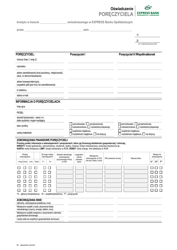 Oświadczenie PORĘCZYCIELA kredytu w kwocie __________________ wnioskowanego w EXPRESS Banku Spółdzielczym przez _______________________________________ zam. ____________________________ 1/ 2/ nr z rejestru poręczycieli PORĘCZYCIEL: Poręczyciel I Poręczyciel II /Współmałżonek imiona /imię 1, imię 2/ nazwisko adres zameldowania (kod pocztowy, miejscowość, ulica, nr domu/mieszkania) adres korespondencyjny (wypełnić jeśli jest inny niż zameldowania) nr telefonu adres e-mail INFORMACJA O PORĘCZYCIELACH: imię ojca PESEL dowód tożsamości - seria i nr , data wydania i organ wydający stan cywilny panna/kawaler, wdowiec/wdowa, ustrój małżeński wspólnota majątkowa, rozdzielność majątkowa, zamężna/żonaty rozwiedziony/separacja nie dotyczy panna/kawaler, zamężna/żonaty wdowiec/wdowa, rozwiedziony/separacja wspólnota majątkowa, rozdzielność majątkowa, nie dotyczy ZOBOWIĄZANIA FINANSOWE PORĘCZYCIELI: Prosimy podać informacje o zobowiązaniach i poręczeniach, które nie finansują działalności gospodarczej / rolniczej, KREDYT: kredyt gotówkowy, samochodowy, studencki, ratalny, leasing, kredyt mieszkaniowy, pożyczka hipoteczna itp., KARTA: karta kredytowa, LIMIT: kredyt odnawialny w ROR, DEBET: karta charge, limit debetowy w ROR. Rodzaj zobowiązania Kredyt Karta Limit Do kogo należy zobowiązanie? Debet PI P II Wartość aktualnego zobowiązania (przyznanego limitu) w PLN oryginalna waluta zobowiązania *K – główny kredytobiorca, W – współkredytobiorca, P – poręczyciel ZOBOWIĄZANIA INNE: (alimenty, zobowiązania podatkowe, inne) Miesięczne wydatki z tytułu utrzymania lokalu mieszkalnego (czynsz, energia, telefon, inne) Miesięczne wydatki związane z utrzymaniem członków gospodarstwa domowego Liczba osób we wspólnym gospodarstwie domowym - odpowiednie zakreślić Miesięczne zobowiązanie w PLN (nie dot. Karta i Limit) Rok zawarcia umowy Nazwa banku Relacja do zobowiązania K* W* P* INFORMACJE MAJĄTKOWE*: posiadany majątek dom mieszkanie działki/grunty samochody/ pojazdy inne …………. dom mieszkanie samochody/ pojazdy działki/grunty inne ………… Łączna szacunkowa wartość majątku * - w przypadku wspólnoty majątkowej małżonków informacja o składnikach majątku i wydatkach, dotyczących obojga małżonków wypełnia tylko poręczyciel. Oświadczenia Klienta 1) moja kondycja finansowa jest / nie jest uzależniona pośrednio lub bezpośrednio od powiązania z członkiem organu banku (Zarządu Banku, Rady Nadzorczej Banku) lub osobą zajmującą stanowisko kierownicze w banku (pracownik banku podlegający bezpośrednio członkom Zarządu Banku oraz dyrektorzy oddziałów banku, ich zastępcy i główni księgowi), rodzaj powiązania: 2) 3) 4) wnioskowany kredyt nie jest przeznaczony na działalność gospodarczą, prowadzę/ nie prowadzę działalności gospodarczej / działalności rolniczej, zostałem poinformowany, że w przypadku przedłożenia fałszywych dokumentów lub informacji, zebrane informacje, bank może przekazać do Systemu Dokumenty Zastrzeżone, którego administratorem jest Związek Banków Polskich, zostały mi udzielone wyjaśnienia dotyczące: postanowień zawartych w umowie. 5) Zgody Klienta 1) 2) 3) 4) 5) 6) 7) Korespondencja zgoda tylko na materiały informacyjne / brak ograniczeń / brak zgody na materiały informacyjne, Wyrażam zgodę na przetwarzanie przez Bank informacji stanowiących moje dane osobowe w celu dokonywania oceny ryzyka kredytowego, Upoważniam bank, na podstawie art. 24 ust. 1 Ustawy z dnia 9 kwietnia 2010 r. o udostępnieniu informacji gospodarczych i wymianie danych gospodarczych (Dz. U. nr 81, poz. 530, z późn. zm.) do wystąpienia i uzyskania z Krajowego Rejestru Długów Biura Informacji Gospodarczej S.A. z siedzibą we Wrocławiu informacji gospodarczych o moich zobowiązaniach, Upoważniam bank, na podstawie art. 24 ust. 1 Ustawy z dnia 9 kwietnia 2010 r. o udostępnieniu informacji gospodarczych i wymianie danych gospodarczych (Dz. U. nr 81, poz. 530 z późn. zm.) oraz na podstawie art. 105 ust. 4a, 4a¹ Ustawy z dnia 29 sierpnia 1997 r. Prawo bankowe (Dz. U. z 2012 r. poz. 1376 j.t., z późn. zm.) w związku z art. 13 ustawy z dnia 9 kwietnia 2010 roku o udostępnieniu informacji gospodarczych i wymianie danych gospodarczych (Dz. U. nr 81, poz. 530, z późn. zm.) do pozyskania z Biura Informacji Gospodarczej InfoMonitor S.A. z siedzibą w Warszawie przy ul. Zygmunta Modzelewskiego 77 (BIG InfoMonitor) dotyczących mnie informacji gospodarczych oraz do pozyskania za pośrednictwem BIG InfoMonitor danych gospodarczych z Biura Informacji Kredytowej S.A. i Związku Banków Polskich dotyczących mojego wymagalnego od co najmniej 60 dni zadłużenia wobec banków lub instytucji upoważnionych do udzielania kredytów, przekraczającego 200 zł lub braku danych o takim zadłużeniu, Upoważniam bank, na podstawie art. 24 ust. 1 Ustawy z dnia 9 kwietnia 2010 r. o udostępnieniu informacji gospodarczych i wymianie danych gospodarczych (Dz. U. nr 81, poz. 530, z późn. zm.) do wystąpienia za pośrednictwem Biura Informacji Kredytowej S.A. z siedzibą w Warszawie – Biura Obsługi Klienta BIK, ul. Postępu 17A, 02-676 Warszawa do biur informacji gospodarczej o ujawnienie informacji gospodarczych dotyczących moich zobowiązań, Wyrażam zgodę/ nie wyrażam zgody na przetwarzanie – aktualnie i w przyszłości – przez bank moich danych osobowych w celu wykonania czynności wywołanych udzielonym poręczeniem, Wyrażam zgodę/ nie wyrażam zgody na przetwarzanie – aktualnie i w przyszłości – przez bank moich danych osobowych w celach marketingowych. Express Bank Spółdzielczy w Rzeszowie z siedzibą 35-111 Rzeszów, ul.Krakowska 12b/3 (dalej bank) informuje, że: 1) 2) 3) 4) zgodnie z art. 24 ust. 1 ustawy z dnia 29 sierpnia 1997 r. o ochronie danych osobowych (j. t. Dz. U. z 2002 r. nr 101, poz. 926, z późn. zm.) informuje, iż jest Administratorem pod