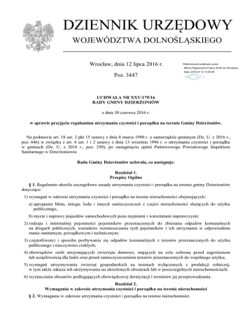 DZIENNIK URZĘDOWY WOJEWÓDZTWA DOLNOŚLĄSKIEGO Wrocław, dnia 12 lipca 2016 r. Elektronicznie podpisany przez: Milena Pigdanowicz-Fidera; DUW we Wrocławiu Poz. 3447 Data: 2016-07-12 14:30:29 UCHWAŁA NR XXV/179/16 RADY GMINY DZIERŻONIÓW z dnia 30 czerwca 2016 r. w sprawie przyjęcia regulaminu utrzymania czystości i porządku na terenie Gminy Dzierżoniów. Na podstawie art. 18 ust. 2 pkt 15 ustawy z dnia 8 marca 1990 r. o samorządzie gminnym (Dz. U. z 2016 r., poz. 446) w związku z art. 4 ust. 1 i 2 ustawy z dnia 13 września 1996 r. o utrzymaniu czystości i porządku w gminach (Dz. U. z 2016 r., poz. 250), po zasięgnięciu opinii Państwowego Powiatowego Inspektora Sanitarnego w Dzierżoniowie Rada Gminy Dzierżoniów uchwala, co następuje: Rozdział 1. Przepisy Ogólne § 1. Regulamin określa szczegółowe zasady utrzymania czystości i porządku na terenie gminy Dzierżoniów dotyczące: 1) wymagań w zakresie utrzymania czystości i porządku na terenie nieruchomości obejmujących: a) uprzątanie błota, śniegu, lodu i innych zanieczyszczeń z części nieruchomości służących do użytku publicznego, b) mycie i naprawy pojazdów samochodowych poza myjniami i warsztatami naprawczymi; 2) rodzaju i minimalnej pojemności pojemników przeznaczonych do zbierania odpadów komunalnych na drogach publicznych, warunków rozmieszczania tych pojemników i ich utrzymania w odpowiednim stanie sanitarnym, porządkowym i technicznym; 3) częstotliwości i sposobu pozbywania się odpadów komunalnych z terenów przeznaczonych do użytku publicznego i nieczystości ciekłych; 4) obowiązków osób utrzymujących zwierzęta domowe, mających na celu ochronę przed zagrożeniem lub uciążliwością dla ludzi oraz przed zanieczyszczeniem terenów przeznaczonych do wspólnego użytku; 5) wymagań utrzymywania zwierząt gospodarskich na terenach wyłączonych z produkcji rolniczej, w tym także zakazu ich utrzymywania na określonych obszarach lub w poszczególnych nieruchomościach; 6) wyznaczania obszarów podlegających obowiązkowej deratyzacji i terminów jej przeprowadzania. Rozdział 2. Wymagania w zakresie utrzymania czystości i porządku na terenie nieruchomości § 2. Wymagania w zakresie utrzymania czystości i porządku na terenie nieruchomości Dziennik Urzędowy Województwa Dolnośląskiego –2– Poz. 3447 1. Właściciele nieruchomości realizują obowiązek uprzątania błota, śniegu, lodu i innych zanieczyszczeń z części nieruchomości służących do użytku publicznego poprzez odgarnięcie uprzątniętego błota, śniegu, lodu i innych zanieczyszczeń w miejsce niepowodujące zakłóceń w ruchu pieszych lub pojazdów i umożliwiające odpływ wód do kanalizacji deszczowej lub rowu przydrożnego. 2. Do czasu uprzątnięcia warstwy lodowej lub w przypadku braku możliwości usunięcia jej dopuszcza się posypanie materiałem uszorstniającym, przy czym materiał użyty do ograniczenia śliskości należy uprzątnąć niezwłocznie po ustaniu przyczyny jego zastosowania. § 3. 1. Na terenie nieruchomości mycie pojazdów samochodowych poza myjniami może odbywać się wyłącznie przy użyciu samej wody i pod warunkiem, że nie powoduje zanieczyszczenia środowiska naturalnego, z zastrzeżeniem ust. 2, 3 i 6. 2. Dopuszcza się mycie pojazdów samochodowych przy użyciu wody wraz ze środkami myjącymi, wyłącznie jeżeli mycie odbywa się ma utwardzonych częściach nieruchomości, a powstające ścieki odprowadzane są do kanalizacji sanitarnej, przydomowej oczyszczalni ścieków lub zbiornika bezodpływowego. 3. Na terenach przeznaczonych do użytku publicznego, w tym w pasach drogowych, zakazuje się mycia pojazdów samochodowych poza myjniami. 4. Naprawa pojazdów samochodowych poza warsztatami naprawczymi, dozwolona jest w przypadku wystąpienia awarii i polega na wykonaniu drobnych napraw lub doraźnych czynności umożliwiających kontynuowanie jazdy lub uruchomienie pojazdu. 5. Naprawa pojazdów samochodowych w przypadkach innych niż wymienione w ust. 4 poza warsztatami naprawczymi dozwolona jest w garażach lub na wydzielonych i utwardzonych częściach nieruchomości pod warunkiem że naprawa pojazdów samochodowych nie powoduje zanieczyszczenia środowiska, a odpady powstające w trakcie naprawy gromadzone są w pojemnikach do tego przeznaczonych i przekazywane do unieszkodliwienia, zgodnie z przepisami odrębnymi, 6. Mycie i naprawa pojazdów samochodowych poza myjniami i warsztatami naprawczymi nie może stwarzać uciążliwości dla właścicieli i współwłaścicieli nieruchomości, na których dokonuje się mycia i napraw oraz właścicieli i współwłaścicieli nieruchomości sąsiednich. Rozdział 3. Pojemniki do zbierania odpadów komunalnych na drogach publicznych § 4. 1. Odpady komunalne z dróg publicznych należy zbierać w koszach ulicznych o minimalnej pojemności 20l, wykonanych z materiałów trudnopalnych o konstrukcji uniemożliwiającej ich wywrócenie i sprawnych technicznie. 2. Rozmieszczenie koszy ulicznych w pasach dróg publicznych, wzdłuż ciągów przy przystankach autobusowych należy dostosować do intensywności i specyfiki ruchu pieszego. pieszych, Rozdział 4. Częstotliwość i sposoby pozbywania się odpadów komunalnych z terenów przeznaczonych do użytku publicznego i nieczystości ciekłych § 5. Częstotliwość i sposoby pozbywania się odpadów komunalnych z terenów przeznaczonych do użytku publicznego i nieczystości ciekłych § 6. Usuwanie nieczystości ciekłych z terenów nieruchomości wyposażonych w zbiorniki bezodpływowe, powinno odbywać się z częstotliwością uzależnioną od ilości wytwarzanych na terenie nieruchomości nieczystości ciekłych oraz objętości zbiornika, zapewniając ciągłość użytkowania oraz uniemożliwiając przedostanie się nieczystości poza zbiornik, ale nie rzadziej niż raz na kwartał. Rozdział 5. Obowiązki osób utrzymujących zwierzęta domowe § 7. Os