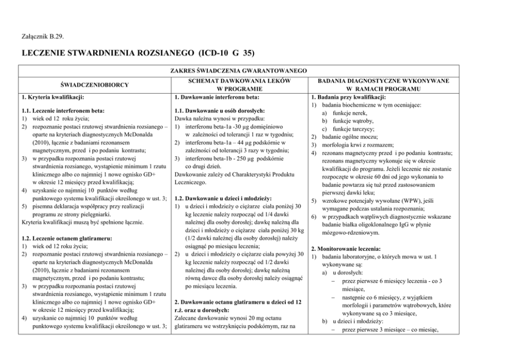 Załącznik B.29. LECZENIE STWARDNIENIA ROZSIANEGO (ICD-10 G 35) ZAKRES ŚWIADCZENIA GWARANTOWANEGO ŚWIADCZENIOBIORCY 1. Kryteria kwalifikacji: 1.1. Leczenie interferonem beta: 1) wiek od 12 roku życia; 2) rozpoznanie postaci rzutowej stwardnienia rozsianego – oparte na kryteriach diagnostycznych McDonalda (2010), łącznie z badaniami rezonansem magnetycznym, przed i po podaniu kontrastu; 3) w przypadku rozpoznania postaci rzutowej stwardnienia rozsianego, wystąpienie minimum 1 rzutu klinicznego albo co najmniej 1 nowe ognisko GD+ w okresie 12 miesięcy przed kwalifikacją; 4) uzyskanie co najmniej 10 punktów według punktowego systemu kwalifikacji określonego w ust. 3; 5) pisemna deklaracja współpracy przy realizacji programu ze strony pielęgniarki. Kryteria kwalifikacji muszą być spełnione łącznie. 1.2. Leczenie octanem glatirameru: 1) wiek od 12 roku życia; 2) rozpoznanie postaci rzutowej stwardnienia rozsianego – oparte na kryteriach diagnostycznych McDonalda (2010), łącznie z badaniami rezonansem magnetycznym, przed i po podaniu kontrastu; 3) w przypadku rozpoznania postaci rzutowej stwardnienia rozsianego, wystąpienie minimum 1 rzutu klinicznego albo co najmniej 1 nowe ognisko GD+ w okresie 12 miesięcy przed kwalifikacją; 4) uzyskanie co najmniej 10 punktów według punktowego systemu kwalifikacji określonego w ust. 3; SCHEMAT DAWKOWANIA LEKÓW W PROGRAMIE 1. Dawkowanie interferonu beta: 1.1. Dawkowanie u osób dorosłych: Dawka należna wynosi w przypadku: 1) interferonu beta-1a -30 µg domięśniowo w zależności od tolerancji 1 raz w tygodniu; 2) interferonu beta-1a – 44 µg podskórnie w zależności od tolerancji 3 razy w tygodniu; 3) interferonu beta-1b - 250 µg podskórnie co drugi dzień. Dawkowanie zależy od Charakterystyki Produktu Leczniczego. 1.2. Dawkowanie u dzieci i młodzieży: 1) u dzieci i młodzieży o ciężarze ciała poniżej 30 kg leczenie należy rozpocząć od 1/4 dawki należnej dla osoby dorosłej; dawkę należną dla dzieci i młodzieży o ciężarze ciała poniżej 30 kg (1/2 dawki należnej dla osoby dorosłej) należy osiągnąć po miesiącu leczenia; 2) u dzieci i młodzieży o ciężarze ciała powyżej 30 kg leczenie należy rozpocząć od 1/2 dawki należnej dla osoby dorosłej; dawkę należną równą dawce dla osoby dorosłej należy osiągnąć po miesiącu leczenia. 2. Dawkowanie octanu glatirameru u dzieci od 12 r.ż. oraz u dorosłych: Zalecane dawkowanie wynosi 20 mg octanu glatirameru we wstrzyknięciu podskórnym, raz na BADANIA DIAGNOSTYCZNE WYKONYWANE W RAMACH PROGRAMU 1. Badania przy kwalifikacji: 1) badania biochemiczne w tym oceniające: a) funkcje nerek, b) funkcje wątroby, c) funkcje tarczycy; 2) badanie ogólne moczu; 3) morfologia krwi z rozmazem; 4) rezonans magnetyczny przed i po podaniu kontrastu; rezonans magnetyczny wykonuje się w okresie kwalifikacji do programu. Jeżeli leczenie nie zostanie rozpoczęte w okresie 60 dni od jego wykonania to badanie powtarza się tuż przed zastosowaniem pierwszej dawki leku; 5) wzrokowe potencjały wywołane (WPW), jeśli wymagane podczas ustalania rozpoznania; 6) w przypadkach wątpliwych diagnostycznie wskazane badanie białka oligoklonalnego IgG w płynie mózgowo-rdzeniowym. 2. Monitorowanie leczenia: 1) badania laboratoryjne, o których mowa w ust. 1 wykonywane są: a) u dorosłych: przez pierwsze 6 miesięcy leczenia - co 3 miesiące, następnie co 6 miesięcy, z wyjątkiem morfologii i parametrów wątrobowych, które wykonywane są co 3 miesiące, b) u dzieci i młodzieży: przez pierwsze 3 miesiące – co miesiąc, 5) pisemna deklaracja współpracy przy realizacji programu ze strony pielęgniarki. Kryteria kwalifikacji muszą być spełnione łącznie. 1.3. Do programu włączeni są również pacjenci, bez konieczności ponownej kwalifikacji, którzy zostali z niego wyłączeni od 1 stycznia 2014 r. ze względu na upływ maksymalnego sześćdziesięciomiesięcznego okresu leczenia immunomodulującego lekami zawartymi w przedmiotowym programie i spełniający w momencie wyłączenia kryteria przedłużenia leczenia. 1.4. Dopuszcza się zamiany leków pierwszej linii w przypadku wystąpienia objawów niepożądanych lub częściowej nieskuteczności terapii definiowanej jako wystąpienie jednego z kryteriów wymienionych w punkcie 5.1. 2. Kryteria uniemożliwiające włączenie do programu: 2.1. Przeciwwskazaniem do stosowania interferonów beta jest wystąpienie przynajmniej jednego z poniższych przeciwwskazań: 1) nadwrażliwość na interferon beta; 2) pierwotnie lub wtórnie postępująca postać choroby; 3) zdekompensowana niewydolność wątroby (enzymy wątrobowe 2 razy lub więcej powyżej normy); 4) zaburzenia czynności tarczycy (bez eutyreozy); 5) depresja nie poddająca się leczeniu; 6) próby samobójcze; 7) padaczka z wyłączeniem napadów, które u dzieci i młodzieży wystąpiły w czasie rzutu stwardnienia rozsianego; 8) leukopenia poniżej 3000/µl; 9) istotna klinicznie niedokrwistość; 10) ciąża; 11) inne przeciwwskazania wymienione w Charakterystyce Produktu Leczniczego. dobę. następnie co 3 miesiące; 2) rezonans magnetyczny przed i po podaniu kontrastu – po każdych 12 miesiącach leczenia; 3) badania oceniające skuteczność leczenia i umożliwiające kontynuacje leczenia w programie wykonuje się każdorazowo po 12 miesiącach leczenia. 3. Monitorowanie programu: 1) gromadzenie w dokumentacji medycznej pacjenta danych dotyczących monitorowania leczenia i każdorazowe ich przedstawianie na żądanie kontrolerów Narodowego Funduszu Zdrowia; 2) uzupełnienie danych zawartych w rejestrze (SMPT) dostępnym za pomocą aplikacji internetowej udostępnionej przez OW NFZ, z częstotliwością zgodną z opisem programu oraz na zakończenie leczenia; 3) przekazywanie informacji sprawozdawczorozliczeniowych do NFZ: informacje przekazuje się do NFZ w formie papierowej lub w formie elektronicznej, zgodnie z wymaganiami o