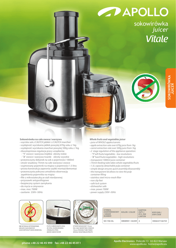 sokowirówka juicer SOKOWIRÓWKA JUICER Vitale Sokowirówka na całe owoce i warzywa • wyciska sok z CAŁYCH jabłek i z CAŁYCH marchwi • wydajność wyciskania jabłek powyżej 670g soku z 1kg • wydajność wyciskania marchwi powyżej 500g soku z 1kg • dwustopniowa regulacja pracy urządzenia: - "1" owoce i warzywa miękkie obroty niskie - "2" owoce i warzywa twarde obroty wysokie • przezroczysty dzbanek na sok o pojemności 1000ml • otwór wsadowy 75mm na całe warzywa i owoce • wyjmowany pojemnik na miąższ o pojemności 1.5 litra • prosta konstrukcja zapewnia szybki montaż/demontaż • przezroczysta pokrywa umożliwia obserwację zapełnienia pojemnika na miąższ • filtr z mikrosiateczką ze stali nierdzewnej • przyssawki antypoślizgowe • bezpieczny system zamykania • do mycia w zmywarce • max. moc 700W • zasilanie 230V~50Hz phone +48 22 46 45 999 fax +48 22 46 45 811 Whole fruits and vegetables juicer • juice of WHOLE apples/carrots • apple extraction rate over 670g juice from 1kg • carrot extraction rate over 500g juice from 1kg • 2 stage regulation of the appliance operation: - "1"soft fruits/vegetables - low revolutions - "2" hard fruits/vegetables - high revolutions • transparent 1000ml juice container • 75mm feeding tube takes whole vegetables/fruits • 1.5L capacity detachable pulp container • simple design ensures quick assembly/disassembly • the transparent lid allows to view the pulp container filling • stainless steel micro-mesh filter • non slip feet • safe lock system • dishwasher safe • max. power 700W • power supply 230V~50Hz SYMBOL ZAMÓWIENIOWY / ORDER NUMBER KOLOR / COLOR SIV-700-SIL SREBRNY / SILVER 4 KARTON (SZT.) / PCS. PER CARTON KOD EAN / EAN CODE 5908237146759 Apollo Electronics Poleczki 13 02-822 Warsaw www.apollo.eu [email protected]