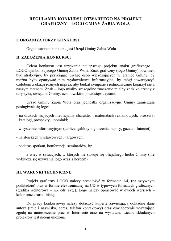 REGULAMIN KONKURSU OTWARTEGO NA PROJEKT GRAFICZNY – LOGO GMINY ŻABIA WOLA I. ORGANIZATORZY KONKURSU: Organizatorem konkursu jest Urząd Gminy Żabia Wola II. ZAŁOŻENIA KONKURSU: Celem konkursu jest uzyskanie najlepszego projektu znaku graficznego – LOGO symbolizującego Gminę Żabia Wola. Znak graficzny (logo Gminy) powinien być atrakcyjny, by przyciągać uwagę osób wjeżdżających w granice Gminy, by można było opatrywać nim wydawnictwa informacyjne, by mógł towarzyszyć ozdobom z okazji różnych imprez, aby budził sympatię i jednoznacznie kojarzył się z naszym terenem. Znak – logo miałby szczególne znaczenie miałby znak kojarzony z turystyką, świętami Gminy, uczniowskimi przedsięwzięciami. Urząd Gminy Żabia Wola oraz jednostki organizacyjne Gminy zamierzają posługiwać się logo: - na drukach mających nieoficjalny charakter i materiałach reklamowych, broszury, katalogi, prospekty, upominki; - w systemie informacyjnym (tablice, gabloty, ogłoszenia, napisy, gazeta i Internet); - na stoiskach wystawowych i targowych; - podczas spotkań, konferencji, seminariów, itp., a więc w sytuacjach, w których nie stosuje się oficjalnego herbu Gminy (nie wyklucza się używania logo wraz z herbem). III. WARUNKI TECHNICZNE: Projekt graficzny LOGO należy przedłożyć w formacie A4, (na sztywnym podkładzie) oraz w formie elektronicznej na CD w typowych formatach graficznych (grafika wektorowa – np. cdr. svg.). Logo należy opracować w dwóch wersjach – kolor oraz czarno-białej. Do pracy konkursowej należy dołączyć kopertę zawierającą dokładne dane autora (imię i nazwisko, adres, telefon kontaktowy) oraz oświadczenie wyrażające zgodę na umieszczenie prac w Internecie oraz na wystawie. Liczba składanych projektów jest nieograniczona. 1 IV. WARUNKI KONKURSU: Konkurs ma charakter otwarty i jest przeznaczony zarówno dla amatorów, jak i profesjonalistów. Złożone prace zostaną ocenione przez społeczną Komisję, w skład której wejdą osoby zaproszone przez Wójta Gminy Żabia Wola. Prawa autorskie wybranego w drodze konkursu projektu przechodzą na Urząd Gminy w Żabiej Woli. Przesłane prace przejdą na własność organizatora (jeśli autor nie poczyni innego zastrzeżenia). Organizator zastrzega sobie prawo do wystawienia nadesłanych prac. Jury może nie przyznać I nagrody, może wybrać projekt logo spoza prac konkursowych, może też zaproponować autorowi najlepszej pracy modyfikację jego projektu. V. TERMINY I MIEJSCE SKŁADANIA PRAC: Prace konkursowe należy składać lub przesyłać na adres: Urząd Gminy Żabia Wola ul. Główna 3 96-321 Żabia Wola ( z dopiskiem „Konkurs – Logo”) Ostateczny termin nadsyłania prac upływa z dniem 30 listopada 2009 roku (decyduje data stempla pocztowego). Nadesłanie pracy na konkurs jest jednoznaczne z przyjęciem zasad regulaminu konkursu. Rozstrzygnięcie konkursu nastapi 7 dni od daty zakończenia składania prac. Organizatorzy zastrzegają sobie prawo do wydłużenia terminu rozstrzygnięcia w zależności od liczby nadesłanych prac konkursowych. Komisja Konkursowa przyzna jedną nagrodę główną w wysokości 700,- zł. (brutto). Wyniki konkursu ogłoszone zostaną w Biuletynie Gminy Żabia Wola, na stronie internetowej oraz na tablicach ogłoszeniowych Urzędu Gminy i Domu Kultury w Żabiej Woli. 2