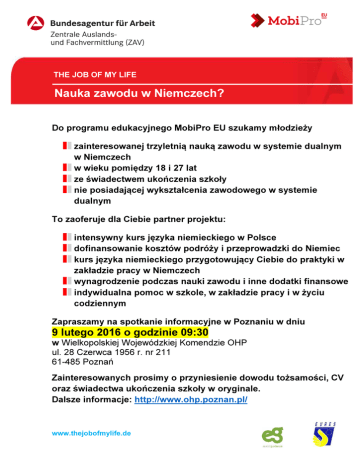 THE JOB OF MY LIFE Nauka zawodu w Niemczech? Do programu edukacyjnego MobiPro EU szukamy młodzieży zainteresowanej trzyletnią nauką zawodu w systemie dualnym w Niemczech w wieku pomiędzy 18 i 27 lat ze świadectwem ukończenia szkoły nie posiadającej wykształcenia zawodowego w systemie dualnym To zaoferuje dla Ciebie partner projektu: intensywny kurs języka niemieckiego w Polsce dofinansowanie kosztów podróży i przeprowadzki do Niemiec kurs języka niemieckiego przygotowujący Ciebie do praktyki w zakładzie pracy w Niemczech wynagrodzenie podczas nauki zawodu i inne dodatki finansowe indywidualna pomoc w szkole, w zakładzie pracy i w życiu codziennym Zapraszamy na spotkanie informacyjne w Poznaniu w dniu 9 lutego 2016 o godzinie 09:30 w Wielkopolskiej Wojewódzkiej Komendzie OHP ul. 28 Czerwca 1956 r. nr 211 61-485 Poznań Zainteresowanych prosimy o przyniesienie dowodu tożsamości, CV oraz świadectwa ukończenia szkoły w oryginale. Dalsze informacje: http://www.ohp.poznan.pl/ www.thejobofmylife.de