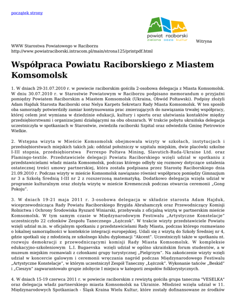 początek strony Witryna WWW Starostwa Powiatowego w Raciborzu http://www.powiatraciborski.intracom.pl/main/strona125/printpdf.html Współpraca Powiatu Raciborskiego z Miastem Komsomolsk 1. W dniach 29-31.07.2010 r. w powiecie raciborskim gościła 2-osobowa delegacja z Miasta Komsomolsk. W dniu 30.07.2010 r. w Starostwie Powiatowym w Raciborzu podpisano memorandum o przyjaźni pomiędzy Powiatem Raciborskim a Miastem Komsomolsk (Ukraina, Obwód Połtawski). Podpisy złożyli Adam Hajduk Starosta Raciborski oraz Nelya Karpets Sekretarz Rady Miasta Komsomolsk. W ten sposób oba samorządy potwierdziły zamiar kontynuowania prac zmierzających do nawiązania trwałej współpracy, której celem jest wymiana w dziedzinie edukacji, kultury i sportu oraz ułatwiania kontaktów między przedsiębiorstwami i organizacjami działającymi na obu obszarach. W trakcie pobytu ukraińska delegacja uczestniczyła w spotkaniach w Starostwie, zwiedziła raciborski Szpital oraz odwiedziła Gminę Pietrowice Wielkie. 2. Wstępna wizyta w Mieście Komsomolsk obejmowała wizyty w szkołach, instytucjach i przedsiębiorstwach miejskich takich jak: oddział położniczy w szpitalu miejskim, dwie placówki szkolne I-III stopnia, przedsiębiorstwa Ferrexpo Poltava Mining, Slavutich-Ruda-Ukraine Ltd. oraz Flamingo-textile. Przedstawiciele delegacji Powiatu Raciborskiego wzięli udział w spotkaniu z przedstawicielami władz miasta Komsomolsk, podczas którego odbyły się rozmowy dotyczące ustalenia ostatecznej treści umowy partnerskiej, która została podpisana przez Starostę Raciborskiego dnia 21.09.2010 r. Podczas wizyty w mieście Komsomolsk nawiązano również współpracę pomiędzy Gimnazjum nr 3 a Szkołą Średnią I-III nr 2 z rozszerzoną matematyką. Dodatkowo delegacja wzięła udział w programie kulturalnym oraz złożyła wizytę w mieście Kremenczuk podczas otwarcia ceremonii „Gong Pokoju”. 3. W dniach 19-21 maja 2011 r. 3-osobowa delegacja w składzie starosta Adam Hajduk, wiceprzewodnicząca Rady Powiatu Raciborskiego Brygida Abrahamczyk oraz Przewodniczący Komisji Rolnictwa i Ochrony Środowiska Ryszard Winiarski, przebywała z oficjalną wizytą w partnerskim mieście Komsomolsk. W tym samym czasie w Międzynarodowym Festiwalu „Artystyczne Konstelacje” uczestniczyło 22 członków Zespołu Tanecznego „Łężczok”. W trakcie wizyty przedstawiciele Powiatu wzięli udział m.in. w oficjalnym spotkaniu z przedstawicielami Rady Miasta, podczas którego rozmawiano o lokalnej samorządności w kontekście integracji europejskiej. Udali się z wizytą do Szkoły Średniej nr 4, gdzie spotkali się z młodzieżą ze szkolnego klubu dyplomacji “Akcent”. Uczestniczyli także w spotkaniu nt. rozwoju demokracji z przewodniczącymi komisji Rady Miasta Komsomolsk. W kompleksie edukacyjno-szkoleniowym L.I. Bugaevska wzięli udział w ogólno ukraińskim forum studentów, a w muzeum miejskim rozmawiali z członkami grupy turystycznej „Pielgrzym”. Na zakończenie wizyty wzięli udział w koncercie galowym i ceremonii wręczania nagród podczas Międzynarodowego Festiwalu „Artystyczne Konstelacje”, w którym uczestniczył Zespół Taneczny „Łężczok”. Wykonanie tańców „Beskid” i „Cieszyn” zagwarantowało grupie zdobycie I miejsca w kategorii zespołów folklorystycznych. 4. W dniach 15-19 czerwca 2011 r. w powiecie raciborskim z rewizytą gościła grupa taneczna "VESELKA" oraz delegacja władz partnerskiego miasta Komsomolsk na Ukrainie. Młodzież wzięła udział w 11. Międzynarodowych Spotkaniach - Śląsk Kraina Wielu Kultur, które zostały dofinansowane ze środków Powiatu Raciborskiego, natomiast delegacja oficjalna w spotkaniach i wizytach m.in. w instytucjach i placówkach podległych Powiatowi. Trzyosobowa delegacja z miasta Komsomolska, w składzie Lyudmyla Byndych - zastępca prezydenta miasta, Svitlana Kalashnik - sekretarz Rady Miasta oraz Svitlana Sheremet - specjalista ds. ekonomicznych i współpracy zagranicznej, rozpoczęła wizytę od oficjalnego spotkania z Zarządem Powiatu i Prezydium Rady Powiatu Raciborskiego, które odbyło się w tut. Starostwie. Następnie goście zwiedzili Raciborskie Centrum Kultury, Ośrodek Sportu i Rekreacji oraz Muzeum w Raciborzu. W piątek delegacja zapoznawała się z funkcjonowaniem oświaty w powiecie - zwiedziła m.in.: Centrum Kształcenia Ustawicznego i Zespół Szkół Mechanicznych, Zespół Szkół Budowlanych i Rzemiosł Różnych oraz Zespół Szkół Ogólnokształcących Nr 1 w Raciborzu. Tego samego dnia wizytowała także Szpital Rejonowy w Raciborzu, po którym oprowadzał jego dyrektor. W trakcie wizyty goście odwiedzili również gminy powiatu tj. m.in.: Pietrowice Wielkie, Krzanowice, Kuźnię Raciborską; wzięli udział w Pływadle i uroczyste j kolacji ze wszystkim zespołami uczestniczącymi w 11. Międzynarodowych Spotkaniach - Śląsk Kraina Wielu Kultur. Na zakończenie wizyty partnerzy zwiedzili Zamek Piastowski w Raciborzu. W tym samym czasie zespół taneczny "VESELKA" prezentował tańce narodowe zarówno na scenach w Raciborzu, jak i w Kuźni Raciborskiej. Zaprezentował się także w Domu Pomocy Społecznej "Złota Jesień" oraz Przedszkolu nr 10 w Raciborzu. W trakcie pobytu był też zorganizowany czas wolny - wspólne ognisko w Szymocicach, kręgielnia, przejażdżka kolejką wąskotorową w Rudach. 5. W dniach 17-22 maja 2012 r. zespół wokalny MIRAŻ Młodzieżowego Domu Kultury w Raciborzu pod kierownictwem Elżbiety Biskup uczestniczył w Międzynarodowym Festiwalu Sztuki Estradowej pn. "Artystyczne Konstelacje" w Komsomolsku.Do udziału w Festiwalu zespół został zaproszony dzięki współpracy partnerskiej pomiędzy Powiatem Raciborskim a miastem Komsomolsk na Ukrainie. W festiwalu obok reprezentantów Raciborszczyzny uczestniczyli także artyści z Ukrainy, Rosji i Białorusi. Festiwal "Artystyczne Konstelacje" przebiegał w dwóch kategoriach tematycznych - śpi
