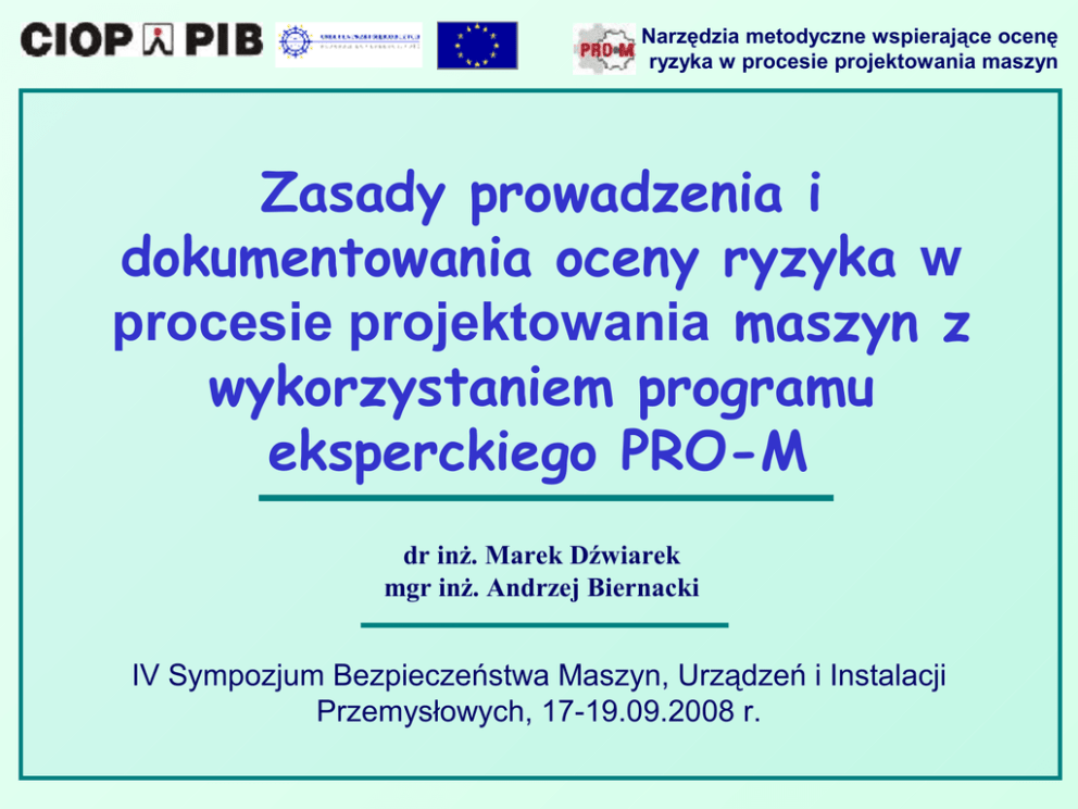Narzędzia metodyczne wspierające ocenę ryzyka w procesie projektowania maszyn Zasady prowadzenia i dokumentowania oceny ryzyka w procesie projektowania maszyn z wykorzystaniem programu eksperckiego PRO-M dr inż. Marek Dźwiarek mgr inż. Andrzej Biernacki IV Sympozjum Bezpieczeństwa Maszyn, Urządzeń i Instalacji Przemysłowych, 17-19.09.2008 r. Narzędzia metodyczne wspierające ocenę ryzyka w procesie projektowania maszyn Zasady ogólne • ocena ryzyka jest ciągiem logicznych kroków mających na celu określenie, w usystematyzowany sposób, ryzyka związanego z obsługą maszyn • podstawowe zasady prowadzenia i dokumentowania oceny ryzyka przedstawione są w normie PN-EN 14121-1:2008 • przy prowadzeniu oceny ryzyka szczególna uwagę należy zwrócić na systematyczność prowadzonych działań oraz ich udokumentowanie Narzędzia metodyczne wspierające ocenę ryzyka w procesie projektowania maszyn Metodyka prowadzenia oceny ryzyka Hierarchia doboru środków ochronnych: • Konstrukcja bezpieczna sama w sobie, • Stosowanie technicznych i uzupełniających środków ochronnych • Informowanie o ryzyku resztkowym Narzędzia metodyczne wspierające ocenę ryzyka w procesie projektowania maszyn Metodyka prowadzenia oceny ryzyka OCENA RYZYKA Identyfikacja maszyny Określenie ograniczeń dotyczących maszyny Identyfikacja zagrożeń Oszacowanie ryzyka NIE Czy, zgodnie z celem dyrektywy, wymagane jest zmniejszenie ryzyka, Informacja o ryzyku resztkowym Sporządzenie dokumentacji REDUKCJA RYZYKA TAK Narzędzia metodyczne wspierające ocenę ryzyka w procesie projektowania maszyn Charakterystyka programu PRO-M • program ma strukturę modułową • moduł główny stanowi narzędzie zarządzania procesem oceny ryzyka, • moduły szczegółowe dotyczą zagrożeń najczęściej występujących przy maszynach PYŁOWYCH DOKUMEN TACJA DOKUMEN TACJA BIOMEHCANICZNYCH WYBUCHEM DOKUMEN TACJA DOKUMEN TACJA HAŁASEM DOKUMEN TACJA ZWIĄZANYCH Z NIESPRAWNOŚCIĄ SYSTEMU STEROWANIA ELEKTRYCZNYCH DOKUMEN TACJA DOKUMEN TACJA MECHANICZNYCH DOKUMEN TACJA MODUŁY DOTYCZĄCE POSZCZEGÓLNYCH ZAGROŻEŃ Narzędzia metodyczne wspierające ocenę ryzyka w procesie projektowania maszyn Charakterystyka programu PRO-M MODUŁ GŁÓWNY DOKUMENTACJA WYMAGANA DYREKTYWĄ 2006/42/WE Narzędzia metodyczne wspierające ocenę ryzyka w procesie projektowania maszyn Charakterystyka programu PRO-M START PROGRAMU Logowanie użytkownika Czy nowy projekt? Nie Tak Edycja danych Wprowadzenie danych identyfikacyjnych projektu Wstępne dane o ograniczeniach dotyczących maszyny Wstępna identyfikacja zagrożeń Uszczegóławianie zapisów Ocena ryzyka wg poszczególnych modułów na kolejnych etapach projektowania Dokument podsumowujący w każdym module ze wskazaniem zasadniczych wymagań bezpieczeństwa Lista kontrolna zasadniczych wymagań bezpieczeństwa Narzędzia metodyczne wspierające ocenę ryzyka w procesie projektowania maszyn Struktura modułu głównego MODUŁ GŁÓWNY - identyfikacja projektu -Opis opis ograniczeń ograniczeń dotyczących dotyczących maszyny, maszyny, w w tym tym zamierzonego używania i możliwego do przewidzenia w uzasadniony sposób niewłaściwego jej użycia - identyfikacja zagrożeń wg PN-EN 1050 (lista kontrolna) Moduły szczegółowe dotyczące poszczególnych zagrożeń Wykaz zasadniczych wymagań bezpieczeństwa (lista kontrolna) DOKUMENTACJA WYMAGANA DYREKTYWĄ 2006/42/WE Narzędzia metodyczne wspierające ocenę ryzyka w procesie projektowania maszyn Zarządzanie procesem oceny ryzyka w programie PRO‑M • administrator: zarządza systemem, tworzy listę użytkowników systemu, nadaje uprawnienia, konfiguruje system, zarządza projektami (kontroluje stan realizacji, archiwizuje zakończone), wskazuje projektantów • główny projektant: tworzy i edytuje projekt, zarządza oceną ryzyka z poziomu modułu głównego, przeprowadza wstępną identyfikację zagrożeń, nadaje uprawnienia pozostałym osobom uczestniczącym w projekcie, tworzy ostateczną dokumentację z oceny ryzyka Narzędzia metodyczne wspierające ocenę ryzyka w procesie projektowania maszyn Zarządzanie procesem oceny ryzyka w programie PRO‑M • projektant: ma uprawnienia dostępu do modułu (zagrożenia) wskazanego przez głównego projektanta, przeprowadza ocenę ryzyka w ramach danego modułu, tworzy dokumentację z przeprowadzonej oceny oraz przekazuje wyniki końcowe do modułu głównego • walidator: ma uprawnienia dostępu do modułu wskazanego przez administratora (standardowo posiada uprawnienia do zagrożeń związanych z niesprawnością systemu sterowania), przeprowadza walidację projektu i sprawdza dokumentację wytworzoną przez projektanta • edytor baz danych: ma uprawnienia do modyfikacji i uzupełniania baz danych Narzędzia metodyczne wspierające ocenę ryzyka w procesie projektowania maszyn Tworzenie i edycja projektu Narzędzia metodyczne wspierające ocenę ryzyka w procesie projektowania maszyn Identyfikacja zagrożeń Narzędzia metodyczne wspierające ocenę ryzyka w procesie projektowania maszyn Informacja o ryzyku resztkowym Narzędzia metodyczne wspierające ocenę ryzyka w procesie projektowania maszyn Listy kontrolne wymagań zasadniczych Narzędzia metodyczne wspierające ocenę ryzyka w procesie projektowania maszyn Efekt końcowy programu PRO-M • wykazanie, że zastosowano wszelkie dostępne środki w celu zredukowania ryzyka związanego z obsługą maszyny • udokumentowanie tego poprzez sporządzenie wymaganej przez dyrektywę maszynową dokumentacji z oceny ryzyka pokazującej zastosowaną procedurę: opis środków zapobiegawczych wdrożonych w celu wyeliminowania rozpoznanych zagrożeń lub zmniejszenia ryzyka oraz, w stosownych przypadkach, wskazanie ryzyka resztkowego związanego z maszyną wykaz zasadniczych wymagań w zakresie ochrony zdrowia i bezpieczeństwa, które mają zastosowanie do maszyny Narzędzia metodyczne wspierające ocenę ryzyka w pro