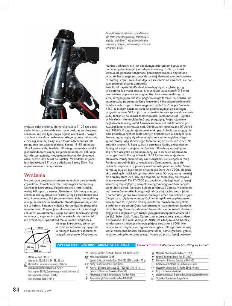 Cieniutki paseczek ciemniejszych włókien tuż nad górną krawędzią przekroju dolnej rury to wlaśnie „pitch fibers”, które umożliwiły obniżenie masy ramy przy deklarowanym wzroście sztywności o 20% grają ze sobą unisono, ale górska kaseta 11-27 nas zaskoczyła. Mimo że ułatwiała nam życie podczas testów poza sezonem, nie jest tym, czego będzie oczekiwał - naszym zdaniem - docelowy nabywca takiego sprzętu. Wszystkie elementy świetnej klasy, więc to nie oszczędności, ale połączenie jest zastanawiające. Kaseta 11-25 lub nawet 11-23 pasowałaby bardziej. Hipotetyczny właściciel SL3 jest posiadaczem więcej niż jednego kompletu kół, więc górskie zestawienie, niedostępne jeszcze do ubiegłego roku, będzie jak znalazł do kolekcji. W dodatku czymże jest dodatkowe 641 zł za dodatkową kasetę Dura-Ace w porównaniu z ceną roweru... Wrażenia Na poczucie sztywności roweru ma wpływ bardzo wiele czynników i to niekoniecznie związanych z samą ramą. Szerokość kierownicy, długość mostka i korb, siodło, rodzaj kół, opon, a nawet ciśnienie w nich mogą znacząco zmieniać jak wyczuwa się rower. Z tego powodu podczas testu i porównań z SL2 podmienialiśmy koła, zwracaliśmy uwagę na różnice w mostkach i standaryzowaliśmy ciśnienia w kołach. Szczerze mówiąc kierownica nie przypadła nam do gustu. Przyjmujemy do wiadomości, że to klasyk i że wielu zawodowców wciąż nie widzi możliwości jazdy na nowych, ergonomicznych barankach, ale nas to i tak nie przekonuje. Specialized ma w kolekcji nowocześnie gięte kierownice, ale w tym sezonie montowane są wyłącznie 582 mm w niższych klasach, zapewne ze 72.7° względu na prawie 50-gramową różnicę. Jeśli waga nie jest absolutnym priorytetem kupującego, zachęcamy do negocjacji w sklepie i zamiany. Krótszy mostek wpływa na poczucie sztywności przedniego trójkąta pogłębione przez mniejsze wyprzedzenie klasycznej kierownicy w porównaniu ze starszą „ergo”. Taki układ daje lepsze czucie na wirażach, ale bardziej przenosi drgania z podłoża. Koła Roval Rapide SL 45 idealnie nadają się do szybkiej jazdy w peletonie lub małej grupce. Stosunkowo wysoki profil (45 mm) zauważalnie poprawia aerodynamikę. Zaobserwowaliśmy, że lepiej utrzymują prędkość w pagórkowatym terenie. Po zjeździe, na przeciwstoku podejmowaliśmy kręcenie o kilka sekund później niż na Mavic’ach R-Sys, w które wyposażony był SL2. W porównaniu z SL2, w którym każde naciśnięcie pedału wydaje się osobnym przyspieszeniem, SL3 w jeździe w płaskim terenie sprawiał wrażenie jakby toczył się na kołach zamachowych. Sama masa kół - wyższa w Rovalach - nie mogłaby być tego przyczyną. Proporcjonalnie większa część masy kół SL3 rozmieszczona jest daleko od osi pozwalając łatwiej zachować pęd. Cieniowane i spłaszczane DT Aerolite 2,3/0,9/2,0 wywierają również efekt psychologiczny. Gdyby nie kilka pomalowanych na biało szprych błyskających w każdym kole, Rovale wydawałyby się obracać tylko na czarnej mgiełce. Negatywną stroną kół jest dość tępe toczenie się po nierównościach. Na polskich drogach R-Sysy są kocio sprężyste i jakby umięśnieniem tłumiły wibracje i mniejsze nierówności. Rovale są raczej bycze. Tną przez wszystko co się napatoczy, za to jeździec odczuwa to w nadgarstkach. Korby S-Works FACT Carbon obracają się na 30-milimetrowej aluminiowej osi z łożyskami wciskanymi w ramę. Ramiona, podobnie jak w rozwiązaniu Campagnolo, łączą się w środku suportu przy pomocy wielowpustu patentu Hirtha. Same korby wydają się być równie sztywne jak Dura-Ace 7900, ale przy ekstremalnych naciskach sprinterskich tarcza 53 wygina się mocniej niż drążony Dura-Ace. Do tego stopnia, że zaczęliśmy się zastanawiać czy manetki DA ST-7900 pozbawione „międzybiegu” w lewej klamce są aby najlepszą parą dla zintegrowanego modułu napędowego Specialized. Ciekawie byłoby spróbować Campa. Niestety nie ma Tarmaców w takiej konfiguracji fabrycznej. Quick Step - jedna z dwóch drużyn Pro Tour sponsorowanych przez Specialized używa Campa ze względu na umowy. Dokładne repliki nie są planowane. Inna sprawa to szybkość zmiany przełożeń. Zwłaszcza przy skoku z dużej na małą tarczę Dura-Ace pozostaje nadal punktem odniesienia w branży. To może zabrzmieć śmiesznie, ale po kołach i kierownicy jedną z największych różnic, jaką poczuliśmy porównując SL2 do SL3, było siodło Toupe Carbon z tytanową ramką i siedziskiem o szerokości 143 mm. Wersja na 2010 jest zdecydowanie bardziej komfortowa niż identycznie wyglądające siedzisko z 2008. Nie wynika to ze zużycia starszego modelu, tylko z elastyczności nowej wersji siodła pod kośćmi kulszowymi. Ma tej samej grubości gąbkę, to samo pokrycie, tę samą wagę... Nowe po prostu lepiej dostoso- 73.3° 415 mm 270 mm SPECIALIZED S-WORKS TARMAC SL3 DURA-ACE 1010 mm Rama: carbon FACT 11r Rozmiary: 49, 52, 54, 56, 58, 61 cm Geometria: rozmiar testowany: 580 mm Masa kompletnego roweru: 6 920 g Masa ramy: 1070 g (z wewnętrzymi łożyskami suportu) Masa przedniego koła: 1088 g Masa tylnego koła: 1434 g 84 bikeBoar d #5 maj 2010 Cena: 29 899 zł Współczynnik bB: 100 g za 432 zł* Przedni widelec: S-Works Tarmac 3SL FACT carbon Koła: Roval Rapide SL 45 Opony: S-Worsk Mondo Open 700x23C (220 g, dętka: 70 g) Korby: S-Works 53/39T (175 mm) Kaseta: Shimano Dura-Ace CS-7900 (11-27) 10-rz. Łańcuch: Shimano Dura-Ace CN-7900 Przerzutka przód: Shimano Dura-Ace FD-7900 Przerzutka tył: Shimano Dura-Ace RD-7900 Manetki: Shimano Dura-Ace ST-7900 Klamki: Shimano Dura-Ace ST-7900 Hamulce: Shimano Dura-Ace BR-7900 Kierownica: S-Works SL Carbon (440 mm) Wspornik kierownicy: S-Works 3D (110 mm) Łożyska sterów: aheadset Wspornik siodełka: S-Works FACT carbon Zertz (350 mm) Siodełko: Specialized Toupe Team