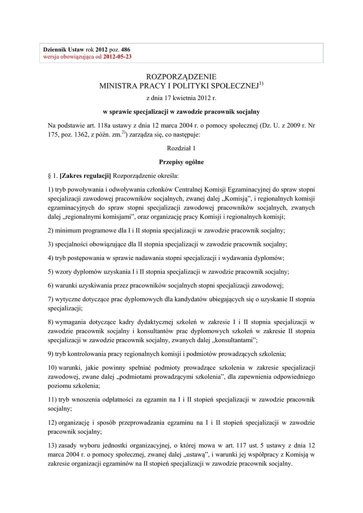 Dziennik Ustaw rok 2012 poz. 486 wersja obowiązująca od 2012-05-23 ROZPORZĄDZENIE MINISTRA PRACY I POLITYKI SPOŁECZNEJ1) z dnia 17 kwietnia 2012 r. w sprawie specjalizacji w zawodzie pracownik socjalny Na podstawie art. 118a ustawy z dnia 12 marca 2004 r. o pomocy społecznej (Dz. U. z 2009 r. Nr 175, poz. 1362, z późn. zm.2)) zarządza się, co następuje: Rozdział 1 Przepisy ogólne § 1. [Zakres regulacji] Rozporządzenie określa: 1) tryb powoływania i odwoływania członków Centralnej Komisji Egzaminacyjnej do spraw stopni specjalizacji zawodowej pracowników socjalnych, zwanej dalej „Komisją”, i regionalnych komisji egzaminacyjnych do spraw stopni specjalizacji zawodowej pracowników socjalnych, zwanych dalej „regionalnymi komisjami”, oraz organizację pracy Komisji i regionalnych komisji; 2) minimum programowe dla I i II stopnia specjalizacji w zawodzie pracownik socjalny; 3) specjalności obowiązujące dla II stopnia specjalizacji w zawodzie pracownik socjalny; 4) tryb postępowania w sprawie nadawania stopni specjalizacji i wydawania dyplomów; 5) wzory dyplomów uzyskania I i II stopnia specjalizacji w zawodzie pracownik socjalny; 6) warunki uzyskiwania przez pracowników socjalnych stopni specjalizacji zawodowej; 7) wytyczne dotyczące prac dyplomowych dla kandydatów ubiegających się o uzyskanie II stopnia specjalizacji; 8) wymagania dotyczące kadry dydaktycznej szkoleń w zakresie I i II stopnia specjalizacji w zawodzie pracownik socjalny i konsultantów prac dyplomowych szkoleń w zakresie II stopnia specjalizacji w zawodzie pracownik socjalny, zwanych dalej „konsultantami”; 9) tryb kontrolowania pracy regionalnych komisji i podmiotów prowadzących szkolenia; 10) warunki, jakie powinny spełniać podmioty prowadzące szkolenia w zakresie specjalizacji zawodowej, zwane dalej „podmiotami prowadzącymi szkolenia”, dla zapewnienia odpowiedniego poziomu szkolenia; 11) tryb wnoszenia odpłatności za egzamin na I i II stopień specjalizacji w zawodzie pracownik socjalny; 12) organizację i sposób przeprowadzania egzaminu na I i II stopień specjalizacji w zawodzie pracownik socjalny; 13) zasady wyboru jednostki organizacyjnej, o której mowa w art. 117 ust. 5 ustawy z dnia 12 marca 2004 r. o pomocy społecznej, zwanej dalej „ustawą”, i warunki jej współpracy z Komisją w zakresie organizacji egzaminów na II stopień specjalizacji w zawodzie pracownik socjalny. Rozdział 2 Tryb powoływania i odwoływania członków Komisji oraz organizacja pracy Komisji § 2. [Skład Komisji] 1. Komisja składa się z nie więcej niż 10 członków. 2. W skład Komisji wchodzą specjaliści z zakresu pracy socjalnej lub pomocy społecznej posiadający: doświadczenie w kształceniu lub doskonaleniu zawodowym pracowników socjalnych lub staż zawodowy w instytucjach i podmiotach działających w obszarze pomocy społecznej. 3. Członków Komisji powołuje minister właściwy do spraw zabezpieczenia społecznego na okres 5 lat. 4. Minister właściwy do spraw zabezpieczenia społecznego zamieszcza ogłoszenie o rozpoczęciu procedury powoływania członków Komisji w Biuletynie Informacji Publicznej i na stronie internetowej urzędu obsługującego ministra właściwego do spraw zabezpieczenia społecznego oraz wyznacza w nim termin zgłaszania się kandydatów. 5. Minister właściwy do spraw zabezpieczenia społecznego ogłasza skład Komisji w Biuletynie Informacji Publicznej i na stronie internetowej urzędu obsługującego ministra właściwego do spraw zabezpieczenia społecznego. 6. Członkowie Komisji wybierają ze swojego składu przewodniczącego, który kieruje pracami Komisji. 7. Przewodniczący Komisji wyznacza zastępcę pełniącego jednocześnie funkcję sekretarza Komisji. 8. Odwołanie przewodniczącego i członków Komisji może nastąpić na podstawie pisemnej rezygnacji albo w drodze odwołania przez ministra właściwego do spraw zabezpieczenia społecznego z funkcji w przypadku niewywiązywania się z zadań określonych w art. 117 ust. 3 ustawy lub ich niewłaściwego wykonywania. § 3. [Obrady Komisji] 1. Komisja obraduje na posiedzeniach nie rzadziej niż dwa razy w roku. 2. Przewodniczący Komisji zwołuje posiedzenia Komisji: 1) z własnej inicjatywy; 2) na wniosek jednej trzeciej liczby członków Komisji lub jednej trzeciej liczby przewodniczących regionalnych komisji; 3) na wniosek ministra właściwego do spraw zabezpieczenia społecznego. 3. Zwołanie posiedzenia Komisji na wniosek, o którym mowa w ust. 2 pkt 2 lub 3, następuje niezwłocznie, jednak nie później niż w terminie miesiąca od dnia złożenia wniosku. 4. Komisja podejmuje rozstrzygnięcia i przyjmuje wnioski w formie uchwał, w trybie głosowania zwykłą większością głosów, w obecności co najmniej połowy liczby członków Komisji. W przypadku równej liczby głosów rozstrzyga głos przewodniczącego. 5. Z przebiegu obrad Komisji sporządza się protokół. 6. Uchwały i protokół, o których mowa w ust. 4 i 5, przewodniczący Komisji przekazuje do wiadomości ministrowi właściwemu do spraw zabezpieczenia społecznego w terminie nie dłuższym niż 30 dni od dnia zakończenia posiedzenia. Rozdział 3 Tryb powoływania i odwoływania członków regionalnych komisji oraz organizacja pracy tych komisji § 4. [Skład regionalnej komisji] 1. Regionalna komisja składa się z nie więcej niż 5 członków. 2. W skład regionalnej komisji wchodzą specjaliści z zakresu pracy socjalnej lub pomocy społecznej z danego województwa posiadający: doświadczenie w kształceniu lub doskonaleniu zawodowym pracowników socjalnych lub staż zawodowy w instytucjach i podmiotach działających w obszarze pomocy społecznej. 3. Członków regionalnej komisji powołuje Komisja na okres 5 lat spośród kandydatów zgłoszonych przez marszałka danego województwa. 4. Członkowie regionalnej komisji wybierają ze swojego składu przewodniczącego, który kieruje pracam