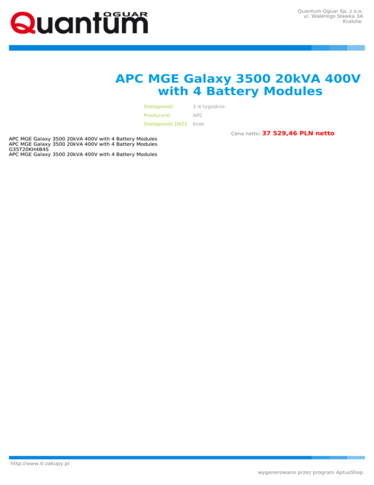 Quantum Qguar Sp. z o.o. ul. Walerego Sławka 3A Kraków APC MGE Galaxy 3500 20kVA 400V with 4 Battery Modules Dostępność: 1-4 tygodnie Producent: APC Dostępność [M2]: brak Cena netto: 37 529,46 PLN netto APC MGE Galaxy 3500 20kVA 400V with 4 Battery Modules APC MGE Galaxy 3500 20kVA 400V with 4 Battery Modules G35T20KH4B4S APC MGE Galaxy 3500 20kVA 400V with 4 Battery Modules http://www.it-zakupy.pl wygenerowano przez program AptusShop