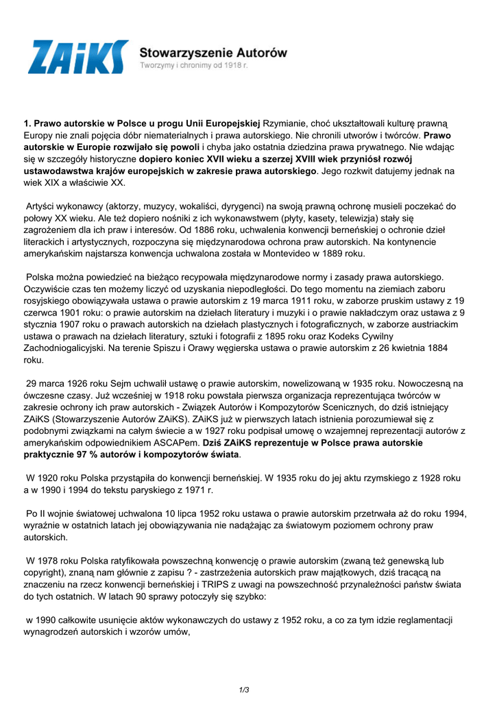 Stowarzyszenie Autorów ZAiKS - 1. Prawo autorskie w Polsce u