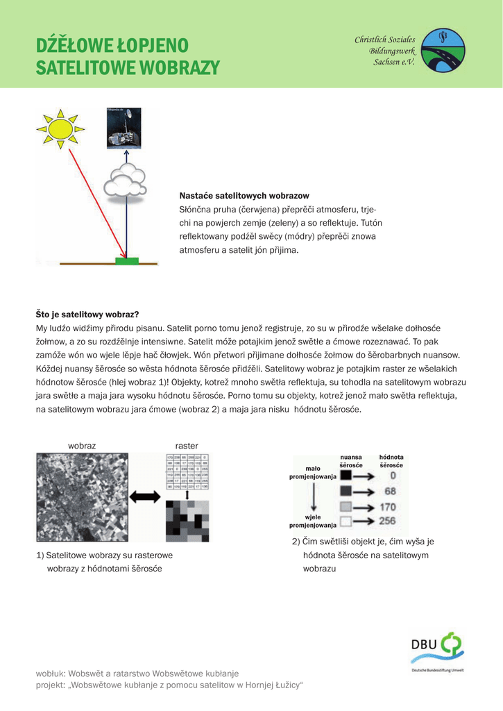 DŹĚŁOWE ŁOPJENO SATELITOWE WOBRAZY Christlich Soziales Bildungswerk Sachsen e.V. Nastaće satelitowych wobrazow Słónčna pruha (čerwjena) přeprěči atmosferu, trjechi na powjerch zemje (zeleny) a so reflektuje. Tutón reflektowany podźěl swěcy (módry) přeprěči znowa atmosferu a satelit jón přijima. Što je satelitowy wobraz? My ludźo widźimy přirodu pisanu. Satelit porno tomu jenož registruje, zo su w přirodźe wšelake dołhosće žołmow, a zo su rozdźělnje intensiwne. Satelit móže potajkim jenož swětłe a ćmowe rozeznawać. To pak zamóže wón wo wjele lěpje hač čłowjek. Wón přetwori přijimane dołhosće žołmow do šěrobarbnych nuansow. Kóždej nuansy šěrosće so wěsta hódnota šěrosće přidźěli. Satelitowy wobraz je potajkim raster ze wšelakich hódnotow šěrosće (hlej wobraz 1)! Objekty, kotrež mnoho swětła reflektuja, su tohodla na satelitowym wobrazu jara swětłe a maja jara wysoku hódnotu šěrosće. Porno tomu su objekty, kotrež jenož mało swětła reflektuja, na satelitowym wobrazu jara ćmowe (wobraz 2) a maja jara nisku hódnotu šěrosće. wobraz raster nuansa šěrosće mało promjenjowanja hódnota šěrosće wjele promjenjowanja 1) Satelitowe wobrazy su rasterowe wobrazy z hódnotami šěrosće 2) Čim swětliši objekt je, ćim wyša je hódnota šěrosće na satelitowym wobrazu wobłuk: Wobswět a ratarstwo Wobswětowe kubłanje projekt: „Wobswětowe kubłanje z pomocu satelitow w Hornjej Łužicy“ Wobłuki, w kotrychž so přeslědźenje zdaloka nałožuje Powětrowe a satelitowe wobrazy, kotrež so při přeslědźenju zdaloka fotografowachu, wobdźěłachu a wuhódnoćichu, so w najwšelakorišich towaršnostnych a wědomostnych wobłukach zasadźuja. Wone wužiwaja so jako zakład za nowe slědźenja, ale runje tak k wudospołnjenju a znazornjenju hižo znatych wobstejnosćow. Na sćěhowacych kartach předstajeja so wšelake wobłuki, w kotrychž so přeslědźenje zdaloka zasadźuje: žórło: http://www.giub.uni-bonn.de/fis/Info-Box/Info-Box_leicht/EFEinf.html Dalše linki: Šulerska dźěłarnička k přeslědźenju zdaloka: http://www.giub.uni-bonn.de/fis/Info-Box/index.html http://www.ph-heidelberg.de/wp/kollar/ Přeslědźenje zdaloka: http://www.esa.int/SPECIALS/Eduspace_EN Widejo Landsat: http://www.youtube.com/watch?v=Y-0rsIuFTrM&translated=1#watch-main-area wobłuk: Wobswět a ratarstwo Wobswětowe kubłanje projekt: „Wobswětowe kubłanje z pomocu satelitow w Hornjej Łužicy“