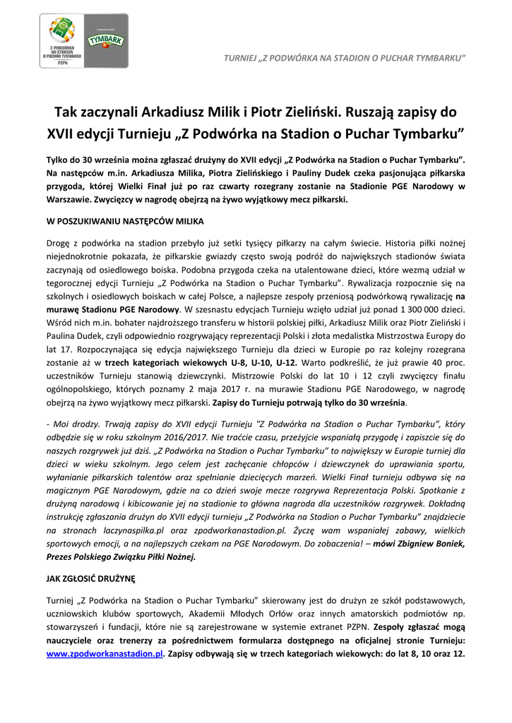 TURNIEJ „Z PODWÓRKA NA STADION O PUCHAR TYMBARKU” Tak zaczynali Arkadiusz Milik i Piotr Zielioski. Ruszają zapisy do XVII edycji Turnieju „Z Podwórka na Stadion o Puchar Tymbarku” Tylko do 30 września można zgłaszad drużyny do XVII edycji „Z Podwórka na Stadion o Puchar Tymbarku”. Na następców m.in. Arkadiusza Milika, Piotra Zielioskiego i Pauliny Dudek czeka pasjonująca piłkarska przygoda, której Wielki Finał już po raz czwarty rozegrany zostanie na Stadionie PGE Narodowy w Warszawie. Zwycięzcy w nagrodę obejrzą na żywo wyjątkowy mecz piłkarski. W POSZUKIWANIU NASTĘPCÓW MILIKA Drogę z podwórka na stadion przebyło już setki tysięcy piłkarzy na całym świecie. Historia piłki nożnej niejednokrotnie pokazała, że piłkarskie gwiazdy często swoją podróż do największych stadionów świata zaczynają od osiedlowego boiska. Podobna przygoda czeka na utalentowane dzieci, które wezmą udział w tegorocznej edycji Turnieju „Z Podwórka na Stadion o Puchar Tymbarku”. Rywalizacja rozpocznie się na szkolnych i osiedlowych boiskach w całej Polsce, a najlepsze zespoły przeniosą podwórkową rywalizację na murawę Stadionu PGE Narodowy. W szesnastu edycjach Turnieju wzięło udział już ponad 1 300 000 dzieci. Wśród nich m.in. bohater najdroższego transferu w historii polskiej piłki, Arkadiusz Milik oraz Piotr Zielioski i Paulina Dudek, czyli odpowiednio rozgrywający reprezentacji Polski i złota medalistka Mistrzostwa Europy do lat 17. Rozpoczynająca się edycja największego Turnieju dla dzieci w Europie po raz kolejny rozegrana zostanie aż w trzech kategoriach wiekowych U-8, U-10, U-12. Warto podkreślid, że już prawie 40 proc. uczestników Turnieju stanowią dziewczynki. Mistrzowie Polski do lat 10 i 12 czyli zwycięzcy finału ogólnopolskiego, których poznamy 2 maja 2017 r. na murawie Stadionu PGE Narodowego, w nagrodę obejrzą na żywo wyjątkowy mecz piłkarski. Zapisy do Turnieju potrwają tylko do 30 września. - Moi drodzy. Trwają zapisy do XVII edycji Turnieju "Z Podwórka na Stadion o Puchar Tymbarku”, który odbędzie się w roku szkolnym 2016/2017. Nie tradcie czasu, przeżyjcie wspaniałą przygodę i zapiszcie się do naszych rozgrywek już dziś. „Z Podwórka na Stadion o Puchar Tymbarku” to największy w Europie turniej dla dzieci w wieku szkolnym. Jego celem jest zachęcanie chłopców i dziewczynek do uprawiania sportu, wyłanianie piłkarskich talentów oraz spełnianie dziecięcych marzeo. Wielki Finał turnieju odbywa się na magicznym PGE Narodowym, gdzie na co dzieo swoje mecze rozgrywa Reprezentacja Polski. Spotkanie z drużyną narodową i kibicowanie jej na stadionie to główna nagroda dla uczestników rozgrywek. Dokładną instrukcję zgłaszania drużyn do XVII edycji turnieju „Z Podwórka na Stadion o Puchar Tymbarku” znajdziecie na stronach laczynaspilka.pl oraz zpodworkanastadion.pl. Życzę wam wspaniałej zabawy, wielkich sportowych emocji, a na najlepszych czekam na PGE Narodowym. Do zobaczenia! – mówi Zbigniew Boniek, Prezes Polskiego Związku Piłki Nożnej. JAK ZGŁOSIĆ DRUŻYNĘ Turniej „Z Podwórka na Stadion o Puchar Tymbarku” skierowany jest do drużyn ze szkół podstawowych, uczniowskich klubów sportowych, Akademii Młodych Orłów oraz innych amatorskich podmiotów np. stowarzyszeo i fundacji, które nie są zarejestrowane w systemie extranet PZPN. Zespoły zgłaszad mogą nauczyciele oraz trenerzy za pośrednictwem formularza dostępnego na oficjalnej stronie Turnieju: www.zpodworkanastadion.pl. Zapisy odbywają się w trzech kategoriach wiekowych: do lat 8, 10 oraz 12. TURNIEJ „Z PODWÓRKA NA STADION O PUCHAR TYMBARKU” Potrwają one do 30 września. Za udział każdej drużyny w rozgrywkach opiekunowie otrzymają piłkarski upominek. Pierwsze mecze rozegrane zostaną już w październiku. - Turniej „Z podwórka na stadion o Puchar Tymbarku” jest szansą dla dzieci na zaprezentowanie swoich umiejętności i spełnienie piłkarskich marzeo, a dla najlepszych jak pokazują przykłady Arkadiusza Milika i Piotra Zielioskiego może byd nawet pierwszym krokiem w stronę prawdziwej kariery. Tymbark jest głównym sponsorem Turnieju i już od 10 lat staramy się zachęcad dzieci do gry w piłkę nożną. Mamy nadzieję, że dobry występ naszej Reprezentacji na Euro we Francji podziałał na wyobraźnię dzieci lubiących piłkę nożną, i w tym roku jeszcze więcej chłopców i dziewczynek weźmie udział w tym największym nie tylko w Polsce, ale i Europie Turnieju – powiedział Krzysztof Pawioski, Prezes Zarządu Maspex. MECZE FINAŁOWE NA STADIONIE PGE NARODOWY Już po raz czwarty zwycięzców Turnieju „Z Podwórka na Stadion o Puchar Tymbarku” poznamy na Stadionie PGE Narodowym w Warszawie. Mecze finałowe XVII edycji rozegrane zostaną 2 maja 2017 r. bezpośrednio przed finałem Pucharu Polski. Dzięki udziałowi w Turnieju każde dziecko, które kocha piłkę nożną może dołączyd do elitarnego grona strzelców gola na Stadionie PGE Narodowy w którym są m.in. Cristiano Ronaldo, Wayne Rooney, Mesut Özil, czy Arkadiusz Milik. Finał rywalizacji o Puchar Tymbarku jest jedną z trzech dróg do zagrania na murawie największego polskiego stadionu, obok gry w Reprezentacji Polski oraz występu w finale Pucharu Polski. - Zapraszam wszystkich do uczestnictwa w turnieju „Z Podwórka na Stadion o Puchar Tymbarku”. Na pewno będzie to świetna zabawa. Coraz więcej dzieci w nim uczestniczy, a poziom sportowy jest coraz wyższy. Finały turnieju są rozgrywane na stadionie PGE Narodowym z piędziesięciotysięczną publicznością, a to naprawdę fantastyczne uczucie. Życzę każdemu, by zagrał tam w Wielkim Finale. Uczestnicy turnieju „Z Podwórka na Stadion o Puchar Tymbarku” mogą dzięki temu iśd naszą drogą (red. Reprezentantów Polski). Ja jestem tego najlepszym przykładem, bo też grałem w ich wieku w tym turnieju - powiedział Arkadiu