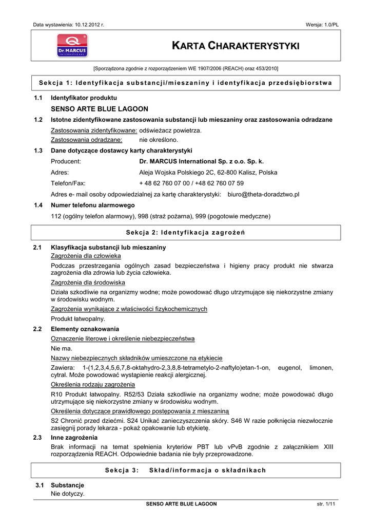 Data wystawienia: 10.12.2012 r. Wersja: 1.0/PL KARTA CHARAKTERYSTYKI [Sporządzona zgodnie z rozporządzeniem WE 1907/2006 (REACH) oraz 453/2010] Sekcja 1: Identyfikacja substancji/mieszaniny i identyfikacja przedsiębiorstwa 1.1 Identyfikator produktu SENSO ARTE BLUE LAGOON 1.2 Istotne zidentyfikowane zastosowania substancji lub mieszaniny oraz zastosowania odradzane Zastosowania zidentyfikowane: odświeżacz powietrza. Zastosowania odradzane: nie określono. 1.3 Dane dotyczące dostawcy karty charakterystyki Producent: Dr. MARCUS International Sp. z o.o. Sp. k. Adres: Aleja Wojska Polskiego 2C, 62-800 Kalisz, Polska Telefon/Fax: + 48 62 760 07 00 / +48 62 760 07 59 Adres e- mail osoby odpowiedzialnej za kartę charakterystyki: 1.4 [email protected] Numer telefonu alarmowego 112 (ogólny telefon alarmowy), 998 (straż pożarna), 999 (pogotowie medyczne) S ek cj a 2 : I d e n t y f i k a c j a z a g r o ż e ń 2.1 Klasyfikacja substancji lub mieszaniny Zagrożenia dla człowieka Podczas przestrzegania ogólnych zasad bezpieczeństwa i higieny pracy produkt nie stwarza zagrożenia dla zdrowia lub życia człowieka. Zagrożenia dla środowiska Działa szkodliwie na organizmy wodne; może powodować długo utrzymujące się niekorzystne zmiany w środowisku wodnym. Zagrożenia wynikające z właściwości fizykochemicznych Produkt łatwopalny. 2.2 Elementy oznakowania Oznaczenie literowe i określenie niebezpieczeństwa Nie ma. Nazwy niebezpiecznych składników umieszczone na etykiecie Zawiera: 1-(1,2,3,4,5,6,7,8-oktahydro-2,3,8,8-tetrametylo-2-naftylo)etan-1-on, cytral. Może powodować wystąpienie reakcji alergicznej. eugenol, limonen, Określenia rodzaju zagrożenia R10 Produkt łatwopalny. R52/53 Działa szkodliwie na organizmy wodne; może powodować długo utrzymujące się niekorzystne zmiany w środowisku wodnym. Określenia dotyczące prawidłowego postępowania z mieszaniną S2 Chronić przed dziećmi. S24 Unikać zanieczyszczenia skóry. S46 W razie połknięcia niezwłocznie zasięgnij porady lekarza - pokaż opakowanie lub etykietę. 2.3 Inne zagrożenia Brak informacji na temat spełnienia kryteriów PBT lub vPvB zgodnie z załącznikiem XIII rozporządzenia REACH. Odpowiednie badania nie były przeprowadzone. Sekcja 3: 3.1 Skład/informacja o składnikach Substancje Nie dotyczy. SENSO ARTE BLUE LAGOON str. 1/11 Data wystawienia: 10.12.2012 r. Wersja: 1.0/PL KARTA CHARAKTERYSTYKI 3.2 Mieszaniny (2-metoksymetyloetoksy)propanol Zakres stężeń: 20-45% Numer CAS: 34590-94-8 Numer WE: 252-104-2 Numer rejestracji właściwej: 01-2119450011-60 Klasyfikacja wg 67/548/EWG: substancja nie jest klasyfikowana jako niebezpieczna Klasyfikacja wg 1272/2008/WE: substancja nie jest klasyfikowana jako niebezpieczna Substancja z określoną wartością dopuszczalnego stężenia w środowisku pracy na poziomie krajowym i unijnym. 1-metoksypropan-2-ol Zakres stężeń: 20-45% Numer CAS: 107-98-2 Numer WE: 203-539-1 Numer rejestracji właściwej: 01-2119457435-35 Klasyfikacja wg 67/548/EWG: R10; R67 Klasyfikacja wg 1272/2008/WE: Flam. Liq. 3 H226; STOT SE 3 H336 Substancja z określoną wartością dopuszczalnego stężenia w środowisku pracy na poziomie krajowym i unijnym. 2,6-dimetylokt-7-en-2-ol (dihydromyrcenol) Zakres stężeń: < 8% Numer CAS: 18479-58-8 Numer WE: 242-362-4 Numer rejestracji właściwej: substancja podlega przepisom okresu przejściowego Klasyfikacja wg 67/548/EWG: Xi R38 Klasyfikacja wg 1272/2008/WE: Eye Irrit. 2 H319 octan linalylu Zakres stężeń: < 2% Numer CAS: 115-95-7 Numer WE: 204-116-4 Numer rejestracji właściwej: substancja podlega przepisom okresu przejściowego Klasyfikacja wg 67/548/EWG: Xi R36/38 Klasyfikacja wg 1272/2008/WE: Eye Irrit. 2 H319; Skin Irrit. 2 H315 octan 3a,4,5,6,7,7a-heksahydro-4,7-metano-1H-indenylu Zakres stężeń: < 2% Numer CAS: 54830-99-8 Numer WE: 259-367-2 Numer rejestracji właściwej: substancja podlega przepisom okresu przejściowego Klasyfikacja wg 67/548/EWG: R52/53 Klasyfikacja wg 1272/2008/WE: Aquatic Chronic 3 H412 4-(2,6,6-trimetylocycloheks-1-en-1-yl)-but-3-en-2-on Zakres stężeń: < 2% Numer CAS: 14901-07-6 Numer WE: 238-969-9 Numer rejestracji właściwej: substancja podlega przepisom okresu przejściowego Klasyfikacja wg 67/548/EWG: N R51/53 Klasyfikacja wg 1272/2008/WE: Aquatic Chronic 2 H411 izoamyloksyoctan allilu Zakres stężeń: Numer CAS: < 2% 67634-00-8 SENSO ARTE BLUE LAGOON str. 2/11 Data wystawienia: 10.12.2012 r. Wersja: 1.0/PL KARTA CHARAKTERYSTYKI Numer WE: 266-803-5 Numer rejestracji właściwej: substancja podlega przepisom okresu przejściowego Klasyfikacja wg 67/548/EWG: Xn R22; Xi R38 Klasyfikacja wg 1272/2008/WE: Acute Tox. 4 H302; Skin Irrit. 2 H315 2-fenyloetanol Zakres stężeń: < 2% Numer CAS: 60-12-8 Numer WE: 200-456-2 Numer rejestracji właściwej: substancja podlega przepisom okresu przejściowego Klasyfikacja wg 67/548/EWG: Xi R36 Klasyfikacja wg 1272/2008/WE: Eye Irrit. 2 H319 limonene Zakres stężeń: < 0,5% Numer CAS: 138-86-3 Numer WE: 205-341-0 Numer rejestracji właściwej: substancja podlega przepisom okresu przejściowego Klasyfikacja wg 67/548/EWG: R10; Xi R38; R43; N R50/53 Klasyfikacja wg 1272/2008/WE: Flam. Liq. 3 H226; Skin Irrit. 2 H315; Skin Sens. 1 H317; Asp. Tox. 1 H304; Aquatic Acute 1 H400; Aquatic Chronic 1 H410 1-(1,2,3,4,5,6,7,8-oktahydro-2,3,8,8-tetrametylo-2-naftylo)etan-1-on Zakres stężeń: < 0,5% Numer CAS: 54464-57-2 Numer WE: 259-174-3 Numer rejestracji właściwej: substancja podlega przepisom okresu przejściowego Klasyfikacja wg 67/548/EWG: R43; N R51/53 Klasyfikacja wg 1272/2008/WE: Skin Sens. 1 H317; Aquatic Chronic 2 H411 eugenol Zakres stężeń: < 0,5% Numer CAS: 97-53-0 Numer WE: 202-589-1 Numer rejestracji właściwej: substancja podlega przepisom okresu przejściowego Klasyfikacja wg 67/548/EWG: Xi R36; R43 Klasyfikacja wg 1272/2008/WE: Eye Irrit. 2 H319; Skin Sens. 1 H317 cytral Zakres stężeń: < 0,5% Numer CAS: 5392-40-5 Numer WE: 226-394-6 