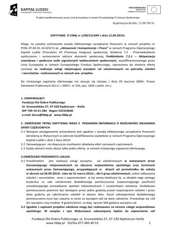 Projekt współfinansowany przez Unię Europejską w ramach Europejskiego Funduszu Społecznego Kędzierzyn-Koźle, 12.09.2013r. ZAPYTANIE O CENĘ nr 1/09/13/AKP z dnia 12.09.2013r. Mając na uwadze zachowanie zasady efektywnego zarządzania finansami w ramach projektu nr POKL.07.02.01-16-023/12 pt. „Aktywność i kompetencje = Praca” w ramach Programu Operacyjnego Kapitał Ludzki (Priorytetu VII Promocja integracji społecznej, działanie 7.2 - Przeciwdziałanie wykluczeniu i wzmocnienie sektora ekonomii społecznej, Poddziałanie 7.2.1 – Aktywizacja zawodowa i społeczna osób zagrożonych wykluczeniem społecznym), współfinansowanego przez Unię Europejską w ramach Europejskiego Fundusz Społecznego, zapraszamy do złożenia oferty cenowej na realizacje usługi obejmującej wynajem sal szkoleniowych na potrzeby szkoleń i warsztatów realizowanych w ramach ww. projektu. Do niniejszego zapytania ofertowego nie stosuje się Ustawy z dnia 29 stycznia 2004r. Prawo Zamówień Publicznych (Dz.U. z 2007r. nr 233, poz. 1655 z późń. zm.). 1. ZAMAWIAJĄCY Fundacja Dla Dobra Publicznego Ul. Grunwaldzka 27, 47-220 Kędzierzyn – Koźle NIP 749-19-21-284 Regon 532319646 e-mail: [email protected] www.fddp.pl 2. OKREŚLENIE TRYBU ZAPYTANIA WRAZ Z PODANIEM INFORMACJI O MOŻLIWOŚCI SKŁADANIA OFERT CZĘŚCIOWYCH 2.1 Niniejsze postępowanie prowadzone jest zgodnie z zasadą efektywnego zarządzania finansami określoną w Wytycznych w zakresie kwalifikowania wydatków w ramach Programu Operacyjnego Kapitał Ludzki z dnia 1 lipca 2013r. 2.2 Zamawiającym nie dopuszcza możliwości składania ofert cenowych częściowych. 2.3 Każdy oferent może złożyć tylko jedna ofertę w ramach niniejszego zapytania ofertowego. 3.OKREŚLENIE PRZEDMIOTU USŁUGI 3.1 Przedmiotem jest realizacji usługi wynajmu sal szkoleniowych w wskazanych przez Zamawiającego miejscowościach na obszarze województwa opolskiego oraz terminach wskazanych przez Zamawiającego, przypadających w dniach od poniedziałku do soboty w okresie od 26.09.2013r. roku do 31 marca 2015r., dla 5 grup szkoleniowych, celem odbywania szkoleń i warsztatów, wraz z zapewnieniem w tej samej lokalizacji (tj. w obrębie tego samego budynku) co sale szkoleniowe dodatkowego pomieszczenia (zapewniającego poufność) umożliwiającego prowadzenie spotkań indywidualnych z uczestnikami szkolenia. Dodatkowe pomieszczenie powinno być dostępne przez jedna godzinę przed rozpoczęciem szkoleń i przez dwie godziny po zakończeniu szkoleń w danym dniu. Koszt udostępnienia dodatkowego pomieszczenia musi być zawarty w cenie za wynajem sali na dane szkolenie. Przewiduje się 118 dni wynajmu razy średnio 8 godzin/dzień, co daję łącznie 944 godziny wynajmu sal. 3.2 Zgodnie z zapisami projektu szkolenia mogą być realizowane na terenie całego województwa opolskiego. W związku z tym Wykonawca zobowiązany będzie do zapewnienia sali Fundacja Dla Dobra Publicznego, ul. Grunwaldzka 27, 47-220 Kędzierzyn-Koźle www.fddp.pl Tel/fax 077 483 40 53 1 Projekt współfinansowany przez Unię Europejską w ramach Europejskiego Funduszu Społecznego szkoleniowej w każdej miejscowości na terenie województwa opolskiego wskazanej przez Zamawiającego. 3.3 Szczegółowy opis przedmiotu usługi: 3.3.1 Wynajem we wskazanej dla każdej grupy przez Zamawiającego miejscowości w woj. opolskim oraz we wskazane dni w okresie od 26.09.2013r. roku do 31 marca 2015r sali szkoleniowej w ilości łącznej 944 godziny, spełniającej następujące wymagania: a) Sala powinna posiadać powierzchnię gwarantując optymalne warunki prowadzenia zajęć szkoleniowych w grupach 10-osobowych +wykładowca/ trener. b) Sala powinna być wyposażona w minimum 11 stolików jednoosobowych umożliwiających swobodną realizacje zajęć przy komputerach przenośnych. c) Możliwość dowolnej aranżacji ustawienia stolików. d) Możliwość oznakowania sali szkoleniowej dostarczonymi przez Zamawiającego materiałami (plakaty, wydruki informacyjne) o wizualizacji zgodnej z wymogami PO KL. e) Każdego dnia zapewniony flipchart z papierem oraz pisaki w czterech kolorach (czarny, niebieski, czerwony, zielony);projektor multimedialny i laptop, ekran. f) Cztery przedłużacze czterogniazdkowe o długości minimum 8m (lub odpowiednio więcej przedłużaczy). g) Stolik na sprzęt audio-video oraz stolik na materiały szkoleniowe trenera. h) Sala szkoleniowa musi mieć dostęp do światła dziennego (posiadać okna). i) Możliwość zaciemnienia pomieszczenia . j) Możliwość wieszania kart flipchartów oraz innych materiałów szkoleniowych na ścianach. k) Sala podczas przerw zamykana w sposób uniemożliwiający dostęp osobom spoza szkolenia; l) Być zaopatrzona w stały i wydajny dostęp do Internetu, umożliwiający jednoczesne korzystanie z Internetu przez minimum 11 laptopów. m) Posiadać dodatkowe stoliki, na których serwowany będzie catering lub wykonawca zapewni osobne pomieszczenie obok sali umożliwiające skorzystanie z przerwy kawowej oraz zjedzenie obiadu. n) Powinna zapewniać dostęp do źródeł prądu; o) Sala szkoleniowa nie może znajdować się w: piwnicy, suterenie, na poddaszu. p) Na sali szkoleniowej nie mogą znajdować się słupy, kolumny lub inne elementy, które utrudnią prowadzenie zajęć. q) W pobliżu sali szkoleniowej tj. w tym samym budynku zapewnione jest dodatkowe pomieszczenie (zapewniającego poufność) umożliwiającego prowadzenie spotkań indywidualnych z uczestnikami szkolenia. r) Powinna być dostępna w godzinach od 8.00 do 18.00. s) Ma zapewnione ogrzewanie przy spadku temperatury w sali poniżej 18 stopni; 3.4 Sale szkoleniowe winny być dostępne na co najmniej 30 minut przed rozpoczęciem szkolenia w danym dniu. 3.5 Wszystkie sale są zlokalizowane dogodnie pod względem komunikacyjnym ( w pobliżu przystanku komunikacji miejskiej), oraz przy budynku w którym jest zlokalizowana sala szkoleniowa jest bezpłatny parking z którego mo