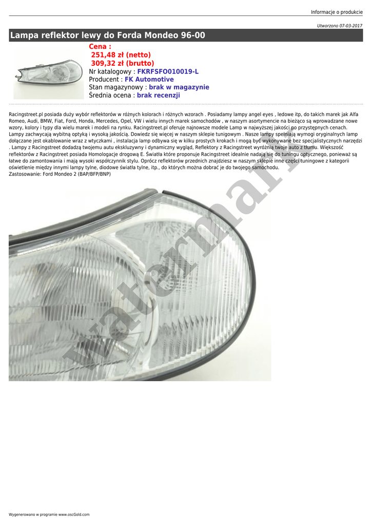 Informacje o produkcie Utworzono 07-03-2017 Lampa reflektor lewy do Forda Mondeo 96-00 Cena : 251,48 zł (netto) 309,32 zł (brutto) Nr katalogowy : FKRFSFO010019-L Producent : FK Automotive Stan magazynowy : brak w magazynie Średnia ocena : brak recenzji w at er m ar k Racingstreet.pl posiada duży wybór reflektorów w różnych kolorach i różnych wzorach . Posiadamy lampy angel eyes , ledowe itp, do takich marek jak Alfa Romeo, Audi, BMW, Fiat, Ford, Honda, Mercedes, Opel, VW i wielu innych marek samochodów , w naszym asortymencie na bieżąco są wprowadzane nowe wzory, kolory i typy dla wielu marek i modeli na rynku. Racingstreet.pl oferuje najnowsze modele Lamp w najwyższej jakości po przystępnych cenach. Lampy zachwycają wybitną optyką i wysoką jakością. Dowiedz się więcej w naszym sklepie tunigowym . Nasze lampy spełniają wymogi oryginalnych lamp dołączane jest okablowanie wraz z wtyczkami , instalacja lamp odbywa się w kilku prostych krokach i mogą być wykonywane bez specjalistycznych narzędzi . Lampy z Racingstreet dodadzą twojemu autu ekskluzywny i dynamiczny wygląd, Reflektory z Racingstreet wyróżnią twoje auto z tłumu. Większość reflektorów z Racingstreet posiada Homologacje drogową E. Światła które proponuje Racingstreet idealnie nadają się do tuningu optycznego, ponieważ są łatwe do zamontowania i mają wysoki współczynnik stylu. Oprócz reflektorów przednich znajdziesz w naszym sklepie inne części tuningowe z kategorii oświetlenie między innymi lampy tylne, diodowe światła tylne, itp., do których można dobrać je do twojego samochodu. Zastosowanie: Ford Mondeo 2 (BAP/BFP/BNP) Wygenerowano w programie www.oscGold.com er m ar k at w w at er m ar k Informacje o produkcie Wygenerowano w programie www.oscGold.com er m ar k at w