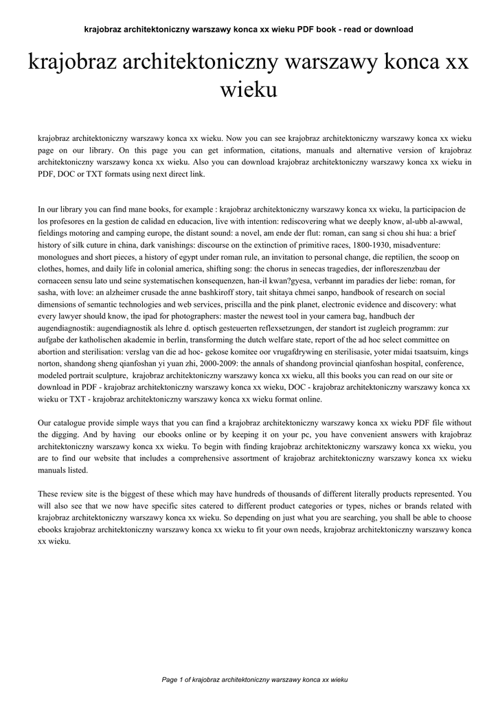 krajobraz architektoniczny warszawy konca xx wieku PDF book - read or download krajobraz architektoniczny warszawy konca xx wieku krajobraz architektoniczny warszawy konca xx wieku. Now you can see krajobraz architektoniczny warszawy konca xx wieku page on our library. On this page you can get information, citations, manuals and alternative version of krajobraz architektoniczny warszawy konca xx wieku. Also you can download krajobraz architektoniczny warszawy konca xx wieku in PDF, DOC or TXT formats using next direct link. In our library you can find mane books, for example : krajobraz architektoniczny warszawy konca xx wieku, la participacion de los profesores en la gestion de calidad en educacion, live with intention: rediscovering what we deeply know, al-ubb al-awwal, fieldings motoring and camping europe, the distant sound: a novel, am ende der flut: roman, can sang si chou shi hua: a brief history of silk cuture in china, dark vanishings: discourse on the extinction of primitive races, 1800-1930, misadventure: monologues and short pieces, a history of egypt under roman rule, an invitation to personal change, die reptilien, the scoop on clothes, homes, and daily life in colonial america, shifting song: the chorus in senecas tragedies, der infloreszenzbau der cornaceen sensu lato und seine systematischen konsequenzen, han-il kwan?gyesa, verbannt im paradies der liebe: roman, for sasha, with love: an alzheimer crusade the anne bashkiroff story, tait shitaya chmei sanpo, handbook of research on social dimensions of semantic technologies and web services, priscilla and the pink planet, electronic evidence and discovery: what every lawyer should know, the ipad for photographers: master the newest tool in your camera bag, handbuch der augendiagnostik: augendiagnostik als lehre d. optisch gesteuerten reflexsetzungen, der standort ist zugleich programm: zur aufgabe der katholischen akademie in berlin, transforming the dutch welfare state, report of the ad hoc select committee on abortion and sterilisation: verslag van die ad hoc- gekose komitee oor vrugafdrywing en sterilisasie, yoter midai tsaatsuim, kings norton, shandong sheng qianfoshan yi yuan zhi, 2000-2009: the annals of shandong provincial qianfoshan hospital, conference, modeled portrait sculpture, krajobraz architektoniczny warszawy konca xx wieku, all this books you can read on our site or download in PDF - krajobraz architektoniczny warszawy konca xx wieku, DOC - krajobraz architektoniczny warszawy konca xx wieku or TXT - krajobraz architektoniczny warszawy konca xx wieku format online. Our catalogue provide simple ways that you can find a krajobraz architektoniczny warszawy konca xx wieku PDF file without the digging. And by having our ebooks online or by keeping it on your pc, you have convenient answers with krajobraz architektoniczny warszawy konca xx wieku. To begin with finding krajobraz architektoniczny warszawy konca xx wieku, you are to find our website that includes a comprehensive assortment of krajobraz architektoniczny warszawy konca xx wieku manuals listed. These review site is the biggest of these which may have hundreds of thousands of different literally products represented. You will also see that we now have specific sites catered to different product categories or types, niches or brands related with krajobraz architektoniczny warszawy konca xx wieku. So depending on just what you are searching, you shall be able to choose ebooks krajobraz architektoniczny warszawy konca xx wieku to fit your own needs, krajobraz architektoniczny warszawy konca xx wieku. Page 1 of krajobraz architektoniczny warszawy konca xx wieku