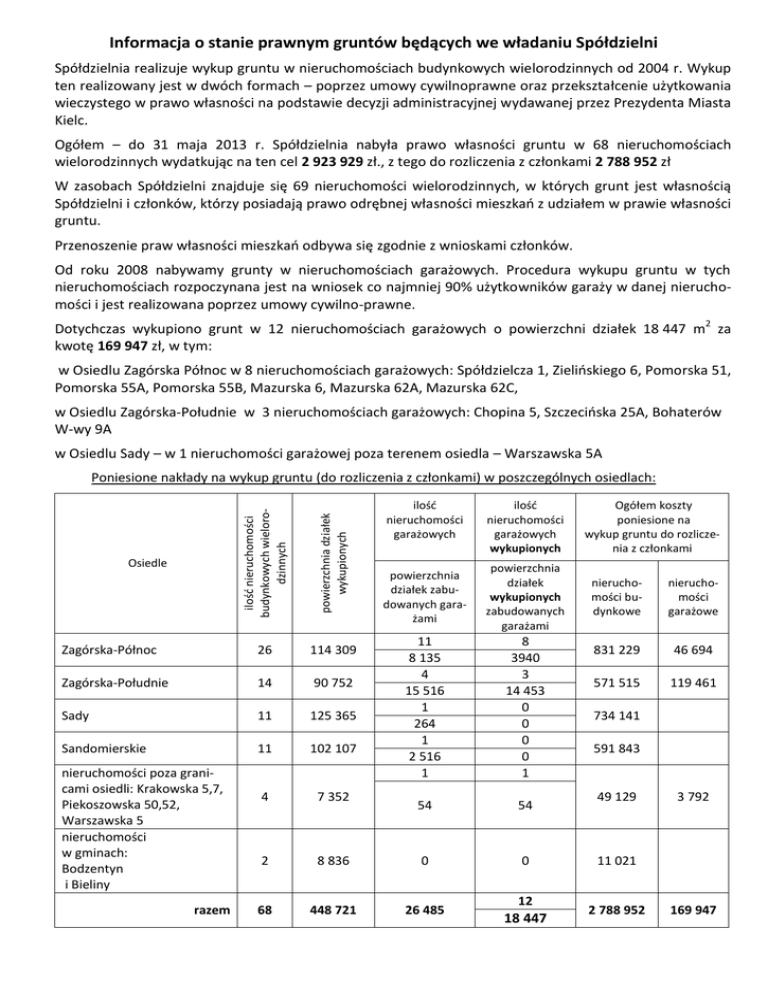 Informacja o stanie prawnym gruntów będących we władaniu Spółdzielni Spółdzielnia realizuje wykup gruntu w nieruchomościach budynkowych wielorodzinnych od 2004 r. Wykup ten realizowany jest w dwóch formach – poprzez umowy cywilnoprawne oraz przekształcenie użytkowania wieczystego w prawo własności na podstawie decyzji administracyjnej wydawanej przez Prezydenta Miasta Kielc. Ogółem – do 31 maja 2013 r. Spółdzielnia nabyła prawo własności gruntu w 68 nieruchomościach wielorodzinnych wydatkując na ten cel 2 923 929 zł., z tego do rozliczenia z członkami 2 788 952 zł W zasobach Spółdzielni znajduje się 69 nieruchomości wielorodzinnych, w których grunt jest własnością Spółdzielni i członków, którzy posiadają prawo odrębnej własności mieszkao z udziałem w prawie własności gruntu. Przenoszenie praw własności mieszkao odbywa się zgodnie z wnioskami członków. Od roku 2008 nabywamy grunty w nieruchomościach garażowych. Procedura wykupu gruntu w tych nieruchomościach rozpoczynana jest na wniosek co najmniej 90% użytkowników garaży w danej nieruchomości i jest realizowana poprzez umowy cywilno-prawne. Dotychczas wykupiono grunt w 12 nieruchomościach garażowych o powierzchni działek 18 447 m2 za kwotę 169 947 zł, w tym: w Osiedlu Zagórska Północ w 8 nieruchomościach garażowych: Spółdzielcza 1, Zielioskiego 6, Pomorska 51, Pomorska 55A, Pomorska 55B, Mazurska 6, Mazurska 62A, Mazurska 62C, w Osiedlu Zagórska-Południe w 3 nieruchomościach garażowych: Chopina 5, Szczecioska 25A, Bohaterów W-wy 9A w Osiedlu Sady – w 1 nieruchomości garażowej poza terenem osiedla – Warszawska 5A Poniesione nakłady na wykup gruntu (do rozliczenia z członkami) w poszczególnych osiedlach: ilośd nieruchomości budynkowych wielorodzinnych powierzchnia działek wykupionych ilośd nieruchomości garażowych Zagórska-Północ 26 114 309 Zagórska-Południe 14 90 752 Sady 11 125 365 Sandomierskie 11 102 107 4 7 352 2 8 836 0 68 448 721 26 485 Osiedle nieruchomości poza granicami osiedli: Krakowska 5,7, Piekoszowska 50,52, Warszawska 5 nieruchomości w gminach: Bodzentyn i Bieliny razem ilośd nieruchomości garażowych wykupionych powierzchnia działek zabudowanych garażami powierzchnia działek wykupionych zabudowanych garażami 11 8 135 4 15 516 1 264 1 2 516 1 8 3940 3 14 453 0 0 0 0 1 54 54 0 12 18 447 Ogółem koszty poniesione na wykup gruntu do rozliczenia z członkami nieruchomości budynkowe nieruchomości garażowe 831 229 46 694 571 515 119 461 734 141 591 843 49 129 3 792 11 021 2 788 952 169 947 Łącznie na wykup gruntu w nieruchomościach wielorodzinnych i garażowych (do rozliczenia z członkami) wydatkowano 2 958 899 zł. Nakłady te, są systematycznie rozliczane z członkami Spółdzielni. Wpłaty jednorazowe dokonują członkowie przed zawarciem umów notarialnych ustanowienia odrębnej własności lokali i ci, którzy sprzedają spółdzielcze własnościowe prawo do lokalu, natomiast pozostali – w ramach opłat czynszowych. Obecnie w dyspozycji Kieleckiej Spółdzielni Mieszkaniowej znajduje się 68,49 ha gruntu z czego 52,83 ha stanowi własnośd, a 15,65 ha użytkowanie wieczyste. Wykorzystanie gruntów będących w użytkowaniu wieczystym w poszczególnych osiedlach: Osiedle Zagórska-Północ Zagórska-Południe Sady zabudowane garażami 4 191 m2 Konarskiego 14 A i B Mazurska 62 Sandomierska 154 1 063 m2 Szymanowskiego 3A 264 m2 niezabudowane tereny zielone, parkingi 5 621 m2 17 166 m2 9 488 m2 1 348 m2 37 814 m2 6 593 m2 22 917 m2 0 39 012 m2 na potrzeby własne Spółdzielni 8 439 m2 kotłownia Minipark Szczecińska boisko Boh.W-wy 11 16 604 m2 12 291 m2 1 180 m2 drogi dojazdy razem 0 30 339 m2 Przelot 2 516 m2 Sandomierskie zabudowane lokalami wolnostojącymi Romualda 14 Kielce, dnia 20.06.2013 r. 10 835 m2 9 179 m2 26 458 m2 kotłownia Żniwna 369 m2 49 357 m2