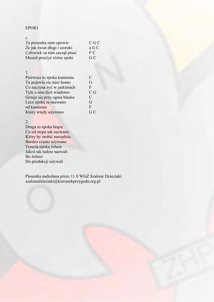EPOKI r. Ta piosenka nam opowie Że jak świat długi i szeroki Człowiek za nim zaczął pisać Musiał przeżyć różne epoki CGC aGC FC GC 1. Pierwsza to epoka kamienia Tu pojawia się nasz homo Co zaczyna żyć w jaskiniach Tyle o nim dziś wiadomo Grzeje się przy ognia blasku Lecz epokę tą nazwano od kamienia Który wtedy używano C G F CG C G F GC 2. Druga to epoka brązu Co od stopu tak nazwano Który by zrobić narzędzia Bardzo często używano Trzecią epoką żelaza Jakoś tak ludzie nazwali Bo żelazo Do produkcji używali Piosenka nadesłana przez 11.8 WGZ Szalone Dzieciaki [email protected]
