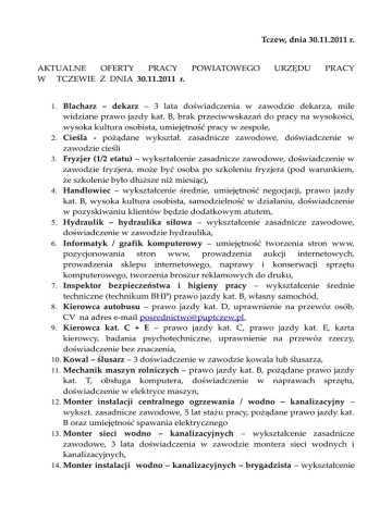 Tczew, dnia 30.11.2011 r. AKTUALNE OFERTY PRACY