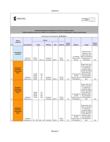 Arkusz1 „WYKWALIFIKOWANY PERSONEL KLUCZEM DO SUKCESU FIRMY” Projekt współfinansowany ze środków Unii Europejskiej w ramach Europejskiego Funduszu Społecznego aktualizacja harmonogramu: 26.08.2013 r. Termin Nazwa szkolenia LP Typ szkolenia Dzień Miesiąc Rok Godzina Liczba godzin szkolenie stacjonarne Sprzedaż i marketing – część druga (2/2) szkolenie stacjonarne 2. Sprzedaż i marketing – część druga (2/2) szkolenie stacjonarne 3. 31.08 – 01.09 22.08 23.08. 02.09 09.09. 29.08 30.08 05.09 12.09 sob -nd czw Pt Pn Pn Pn Wt Czw Czw sierpień / wrzesień sierpień / wrzesień sierpień / wrzesień 2013 r. 2013 r. 2013 r. 8.30 – 16.00 17.00 – 20.30 17.00 – 20.30 szkolenie stacjonarne 07 – 08 sob – nd wrzesień 2013 r. Strona 1 8.30 – 16.00 Wolne miejsca 16 tak 16 Druga część szkolenia ze sprzedaży. Zajęcia poświęcone będą kwestii sprzedaży przez Internet. ul. Taczaka 12, Szkolenie odby61-818 wać się będą w Poznań, sala nr sali komputero49 (II piętro) wej. nie 16 Druga część szkolenia ze sprzedaży. Zajęcia poświęcone będą kwestii sprzedaży przez Internet. ul. Taczaka 12, Szkolenie odby61-818 wać się będą w Poznań, sala nr sali komputero49 (II piętro) wej. tak 16 Druga część szkolenia ze sprzedaży. Zajęcia poświęcone będą kwestii sprzedaży przez Internet. ul. Taczaka 12, Szkolenie odby61-818 wać się będą w Poznań, sala nr sali komputero49 (II piętro) wej. tak Sprzedaż i marketing – część druga (2/2) 4. Uwagi Szkolenie podstawowe – dla osób, które NIE ul. Szkolna BYŁY na szkoleniu 13/6, 61-832 wyjazdowym w Poznań Łężeczkach Zarządzanie zespołem 1. Miejsce Arkusz1 Zarządzanie zespołem szkolenie wyjazdowe 5. 13 -15 Pt – nd wrzesień 13.09.201 3: 08.00 – 17.00, 14.09.201 3: 08.00 – 18.00, 15.09.201 3: 08.00 – 2013 r. 14.00 25 Zakwaterowanie w pokojach 2 i 3 osobowych. Pokój jednoosobowy za dopłatą. Dojazd we własnym zakresie (w Miejsce w przypadku braku trakcie ustaleń transportu pro(hotel do 100 simy o skontakkm od towanie się z biuPoznania) rem projektu) tak 16 Druga część szkolenia ze sprzedaży. Zajęcia poświęcone będą kwestii sprzedaży przez Internet. ul. Taczaka 12, Szkolenie odby61-818 wać się będą w Poznań, sala nr sali komputero49 (II piętro) wej. tak 16 Szkolenie zaawansowane – dla osób, które ul. Szkolna BYŁY na szkoleniu 13/6, 61-832 wyjazdowym w Poznań Łężeczkach tak 16 Szkolenie podstawowe – dla osób, które NIE ul. Szkolna BYŁY na szkoleniu 13/6, 61-832 wyjazdowym w Poznań Łężeczkach tak 15 Zakwaterowanie w pokojach 2 i 3 osobowych. Pokój jednoosobowy za dopłatą. Dojazd we własnym zakresie (w Miejsce w przypadku braku trakcie ustaleń transportu pro(hotel do 100 simy o skontakkm od towanie się z biuPoznania) rem projektu) tak Sprzedaż i marketing – część druga (2/2) szkolenie stacjonarne 6. 14 – 15 sob – nd wrzesień 8.30 – 16.00 2013 r. Zarządzanie zespołem szkolenie stacjonarne 7. 14 – 15 sob – nd wrzesień 8.30 – 16.00 2013 r. Zarządzanie zespołem szkolenie stacjonarne 8. 20 – 21 Pt – sob wrzesień 8.30 – 16.00 2013 r. Zarządzanie Czasem 9. szkolenie wyjazdowe 28-29 sob – nd wrzesień 2013 r. 28.09.201 3: 09.00 – 17.00, 29.09.201 3: 08.00 – 15.00, Strona 2 Arkusz1 16 Szkolenie zaawansowane – dla osób, które ul. Szkolna BYŁY na szkoleniu 13/6, 61-832 wyjazdowym w Poznań Łężeczkach tak 8 Szkolenie podstawowe - POŁÓWKOWE obowiązkowe dla wszysktch osób, które nie uczestul. Szkolna niczyły w tym 13/6, 61-832 szkoleniu przed Poznań wakacjami tak 15 Zakwaterowanie w pokojach 2 i 3 osobowych. Pokój jednoosobowy za dopłatą. Dojazd we własnym zakresie (w Miejsce w przypadku braku trakcie ustaleń transportu pro(hotel do 100 simy o skontakkm od towanie się z biuPoznania) rem projektu) tak ul. Szkolna 13/6, 61-832 Poznań Szkolenie jednodniowe stacjonarne w Poznaniu tak ul. Szkolna 13/6, 61-832 Poznań Szkolenie podstawowe - obowiązkowe dla wszysktch osób, które nie uczestniczyły w tym szkoleniu przed wakacjami tak ul. Szkolna 13/6, 61-832 Poznań Szkolenie podstawowe - obowiązkowe dla osób, którym zależy na dłuższym treningu z zakresu asertywności tak Zarządzanie zespołem szkolenie stacjonarne 10. 04 – 05 8.30 – 16.00 Pt – sob październik 2013 r. Zarządzanie Czasem obowiązkowe stacjonarne szkolenie stacjonarne 11. 08.10. 22.10. wt Wt październik Zarządzanie Czasem szkolenie wyjazdowe 12. 12-13 17.00 20.30 2013r sob – nd październik 2013 r. 12.10.201 3: 09.00 – 17.00, 13.10.201 3: 08.00 – 15.00, Savoir Vivre w biznesie szkolenie stacjonarne 13. 14 Pn październik 2013 r. 8.30 – 16.00 8 Komunikacja szkolenie obowiązkowe szkolenie stacjonarne 14. 18 pt październik 2013r. 08.30 16.00 8 Asertwyność szkolenie dwudniowe 15. szkolenie stacjonarne 18-19 pt -sob październik 2013r. Strona 3 08.30 16.00 16 Arkusz1 Savoir Vivre w biznesie szkolenie stacjonarne 16. 19 sob październik 2013 r. 8.30 – 16.00 ul. Szkolna 13/6, 61-832 Poznań Szkolenie jednodniowe stacjonarne w Poznaniu tak 16 ul. Szkolna 13/6, 61-832 Poznań Szkolenie składa się z dwóch części (część pierwsza: 16 godzin szkolenia ze sprzedaży; część druga: 16 godzin ze sprzedaży przez Internet. tak 8 ul. Szkolna 13/6, 61-832 Poznań Szkolenie jednodniowe stacjonarne w Poznaniu tak 16 ul. Szkolna 13/6, 61-832 Poznań Szkolenie podstawowe - obowiązkowe dla osób, którym zależy na dłuższym treningu z zakresu asertywności tak 8 Szkolenie podstawowe - POŁÓWKOWE obowiązkowe dla wszysktch osób, które nie uczestul. Szkolna niczyły w tym 13/6, 61-832 szkoleniu przed Poznań wakacjami tak 8 ul. Szkolna 13/6, 61-832 Poznań Szkolenie jednodniowe stacjonarne w Poznaniu tak 8 Sprzedaż i marketing – część pierwsza (1/2) szkolenie stacjonarne 17. 25-26 Pt – sob październik 2013 r. 8.30 – 16.00 Szkolenie z Motywacji i Automotywacji szkolenie stacjonarne 18. 25 pt październik 201