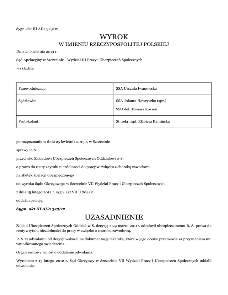 Sygn. akt III AUa 323/12 WYROK W IMIENIU RZECZYPOSPOLITEJ POLSKIEJ Dnia 25 kwietnia 2013 r. Sąd Apelacyjny w Szczecinie - Wydział III Pracy i Ubezpieczeń Społecznych w składzie: Przewodniczący: SSA Urszula Iwanowska Sędziowie: SSA Jolanta Hawryszko (spr.) SSO del. Tomasz Korzeń Protokolant: St. sekr. sąd. Elżbieta Kamińska po rozpoznaniu w dniu 25 kwietnia 2013 r. w Szczecinie sprawy R. S. przeciwko Zakładowi Ubezpieczeń Społecznych Oddziałowi w S. o prawo do renty z tytułu niezdolności do pracy w związku z chorobą zawodową na skutek apelacji ubezpieczonego od wyroku Sądu Okręgowego w Szczecinie VII Wydział Pracy i Ubezpieczeń Społecznych z dnia 15 lutego 2012 r. sygn. akt VII U 704/11 oddala apelację. Sygn. akt III AUa 323/12 UZASADNIENIE Zakład Ubezpieczeń Społecznych Oddział w S. decyzją z 29 marca 2011r. odmówił ubezpieczonemu R. S. prawa do renty z tytułu niezdolności do pracy w związku z chorobą zawodową. R. S. w odwołaniu od decyzji wskazał na dokumentację lekarską, która w jego ocenie przemawia za przyznaniem mu wnioskowanego świadczenia. Organ rentowy wniósł o oddalenie odwołania. Wyrokiem z 15 lutego 2012 r. Sąd Okręgowy w Szczecinie VII Wydział Pracy i Ubezpieczeń Społecznych oddalił odwołanie. Sąd I instancji ustalił, że R. S. urodził się (...); z zawodu jest leśnikiem i w tym zawodzie pracował przez cały okres aktywności zawodowej. Decyzją z 23 października 2002 r. stwierdzono chorobę zawodową – choroby zakaźne i inwazyjne – boreliozę. Decyzją z 1 stycznia 2003 r. organ rentowy przyznał R. S. prawo do renty z tytułu częściowej niezdolności do pracy w związku z chorobą zawodową od 1 stycznia 2003 r. do 28 lutego 2005 r. Prawo ubezpieczonego do tego świadczenia przedłużano kolejnymi decyzjami, ostatnio do 31 marca 2011 r. Aktualnie u R. S. rozpoznaje się: niedokrwistość autoimmunohemolityczną, przebytą boreliozę, cukrzycę typu 3 (posterydową), nadciśnienie tętnicze, dnę moczanową w wywiadzie, boreliozę w wywiadzie. Ubezpieczony R. S. jest częściowo i trwale niezdolny do pracy z ogólnego stanu zdrowia. Niezdolność do pracy istnieje bez związku z chorobą zawodową. Stosownie do treści przepisu art. 6 ust. 1 pkt 6 ustawy z dnia 30 października 2002 r. o ubezpieczeniu społecznym z tytułu wypadków przy pracy i chorób zawodowych (Dz. U. 2002 rok, nr 199, poz. 1673 ze zm.) w związku z art. 12 i art. 13 ustawy z dnia 17 grudnia 1998 r. o emeryturach i rentach z Funduszu Ubezpieczeń Społecznych (Dz. U. 2009 r., nr 153, poz. 1227 ze zm.) i art. 237 § 1 pkt 2 Kodeksu pracy, sąd okręgowy zważył, że odwołanie R. S. nie jest zasadne, ponieważ stan zdrowia R. S. czyni go po 31 marca 2011 r. niezdolnym do pracy, jednak z ogólnego stanu zdrowia, bez związku ze stwierdzoną w październiku 2002 r. chorobą zawodową. Ustalenia w tym przedmiocie zostały poczynione przez sąd okręgowy w oparciu o analizę dokumentacji rentowej ubezpieczonego, w szczególności dokumentacji jego leczenia pozostającej w dyspozycji organu rentowego oraz przedłożonej przez ubezpieczonego, a przede wszystkim na podstawie przeprowadzonego w toku postępowania sądowego dowodu z opinii biegłych sądowych lekarzy specjalistów z zakresu neurologii, kardiologii – diabetologii i reumatologii. W ocenie biegłych neurologa i kardiologa – diabetologa, aktualny stan zdrowia ubezpieczonego nie czyni go osobą niezdolną do pracy w zawiązku z chorobą zawodową. Biegli podkreślili, że po dniu 31 marca 2011 r. nastąpiła istotna poprawa stanu zdrowia wnioskodawcy i obecnie stan zdrowia powoduje częściową niezdolność do pracy z ogólnego stanu zdrowia. Schorzeniem podstawowym jest niedokrwistość autoimmunohemolityczna. Od kilku miesięcy zostały wyraźnie zmniejszone dawki leków immunosupresyjnych, a stan hematologiczny jest stabilny. Jednak z uwagi na charakter schorzeń, wiek ubezpieczonego, wieloletnie leczenie okupione cukrzycą typu 3, częściowa niezdolność do pracy ma charakter trwały. Rozpoznana w 2002 r. borelioza od kilku lat jest jedynie w obserwacji - nie stosowano antybiotykoterapii, a poziomy przeciwciał przeciwko boreliozie są ujemne. Świadczy to o remisji choroby. Również w opinii biegłego z zakresu reumatologii wnioskodawca jest zdolny do pracy. Przebyta borelioza oraz rozpoznana dna moczanowa nie stanowią przeciwskazań do pracy. Narząd ruchu ma prawidłową funkcję, bez upośledzenia funkcji stawów obwodowych oraz kręgosłupa. Dna moczanowa podlega kontroli poziomu kwasu moczowego oraz stosowania Miluritu i przestrzegania diety ubogopurynowej, zaś postępowanie w atakach dny wymaga stosowania kolchicyny albo niesteroidowych leków przeciwbólowych, przeciwzapalnych. Opinie biegłych sąd okręgowy uznał za wiarygodne, uznając że nie mogą ich podważać subiektywne odczucia R. S., który twierdzi, że cukrzyca, na którą choruje obecnie jest następstwem boreliozy i który po rozpoznaniu postawionym przez biegłych sądowych (dotyczącym postawionej diagnozy dotyczącej braku niezdolności do pracy w związku z chorobą zawodową) nie przedstawił żadnych zarzutów, co do ewentualnej wadliwości przeprowadzonych przez biegłych badań. Sąd I instancji zaznaczył, że wyjąwszy przypadki przyznania renty stałej, specyfiką świadczenia rentowego, jest jego okresowość. Zmiana stanu zdrowia ubezpieczonego, mogąca skutkować wystąpieniem u niego niezdolności do pracy w związku z chorobą zawodową, jako okoliczność podlegająca okresowej weryfikacji organu rentowego oraz przy wniesieniu odwołania od decyzji odmownej także kontroli sądowej, przesądza o niemożności uznania, że prawo do renty z tytułu niezdolności do pracy, przyznane na określony czas, stanowi prawo nabyte w rozumieniu przepisów ustawy zasadniczej. Ponieważ z materiału dowodowego wynika, że R. S. zarówno w dacie wydania zaskarżonej decyzji (marzec 2011 r.), jak 