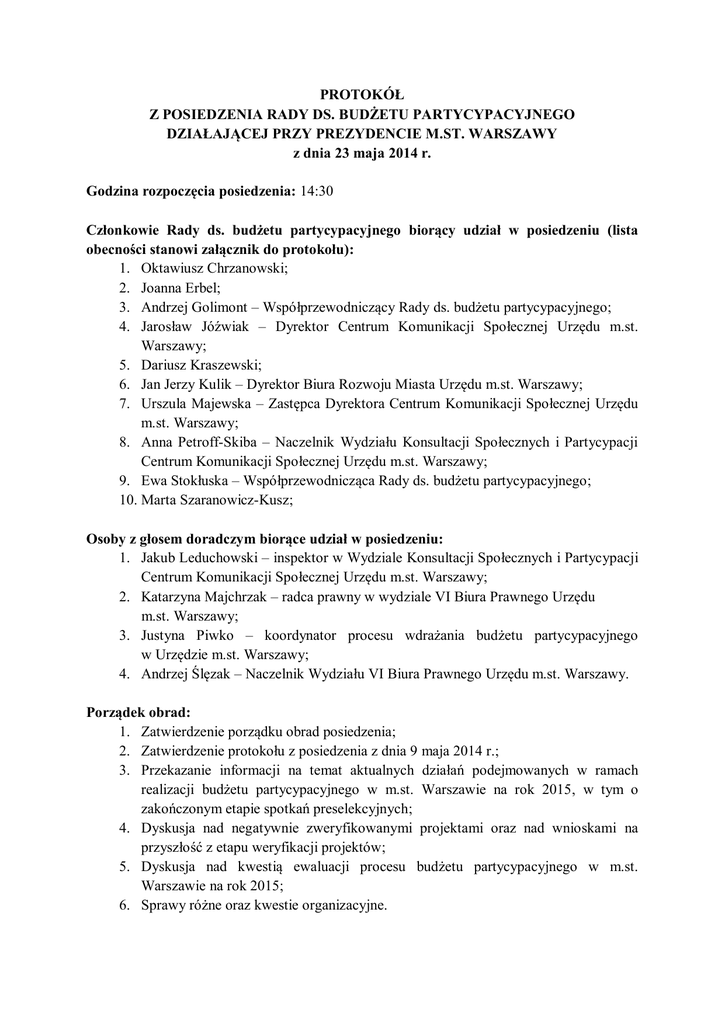PROTOKÓŁ Z POSIEDZENIA RADY DS. BUDŻETU PARTYCYPACYJNEGO DZIAŁAJĄCEJ PRZY PREZYDENCIE M.ST. WARSZAWY z dnia 23 maja 2014 r. Godzina rozpoczęcia posiedzenia: 14:30 Członkowie Rady ds. budżetu partycypacyjnego biorący udział w posiedzeniu (lista obecności stanowi załącznik do protokołu): 1. Oktawiusz Chrzanowski; 2. Joanna Erbel; 3. Andrzej Golimont – Współprzewodniczący Rady ds. budżetu partycypacyjnego; 4. Jarosław Jóźwiak – Dyrektor Centrum Komunikacji Społecznej Urzędu m.st. Warszawy; 5. Dariusz Kraszewski; 6. Jan Jerzy Kulik – Dyrektor Biura Rozwoju Miasta Urzędu m.st. Warszawy; 7. Urszula Majewska – Zastępca Dyrektora Centrum Komunikacji Społecznej Urzędu m.st. Warszawy; 8. Anna Petroff-Skiba – Naczelnik Wydziału Konsultacji Społecznych i Partycypacji Centrum Komunikacji Społecznej Urzędu m.st. Warszawy; 9. Ewa Stokłuska – Współprzewodnicząca Rady ds. budżetu partycypacyjnego; 10. Marta Szaranowicz-Kusz; Osoby z głosem doradczym biorące udział w posiedzeniu: 1. Jakub Leduchowski – inspektor w Wydziale Konsultacji Społecznych i Partycypacji Centrum Komunikacji Społecznej Urzędu m.st. Warszawy; 2. Katarzyna Majchrzak – radca prawny w wydziale VI Biura Prawnego Urzędu m.st. Warszawy; 3. Justyna Piwko – koordynator procesu wdrażania budżetu partycypacyjnego w Urzędzie m.st. Warszawy; 4. Andrzej Ślęzak – Naczelnik Wydziału VI Biura Prawnego Urzędu m.st. Warszawy. Porządek obrad: 1. Zatwierdzenie porządku obrad posiedzenia; 2. Zatwierdzenie protokołu z posiedzenia z dnia 9 maja 2014 r.; 3. Przekazanie informacji na temat aktualnych działań podejmowanych w ramach realizacji budżetu partycypacyjnego w m.st. Warszawie na rok 2015, w tym o zakończonym etapie spotkań preselekcyjnych; 4. Dyskusja nad negatywnie zweryfikowanymi projektami oraz nad wnioskami na przyszłość z etapu weryfikacji projektów; 5. Dyskusja nad kwestią ewaluacji procesu budżetu partycypacyjnego w m.st. Warszawie na rok 2015; 6. Sprawy różne oraz kwestie organizacyjne. POSTANOWIENIA: 1. Omawiana kwestia: Postanowienie: Zatwierdzanie porządku obrad posiedzenia Zatwierdzono bez uwag. 2. Omawiana kwestia: Zatwierdzanie protokołu z posiedzenia z dnia 9 maja 2014 r. Nie zatwierdzono. Projekt protokołu został skierowany do uzupełnienia. Postanowienie: 3. Omawiana kwestia: Postanowienia: Przekazanie informacji na temat aktualnych działań podejmowanych w ramach realizacji budżetu partycypacyjnego w m.st. Warszawie na rok 2015, w tym o zakończonym etapie spotkań preselekcyjnych Głos zabrała Pani Anna Petroff-Skiba. Przypomniała zebranym w których dzielnicach odbyły się spotkania preselekcyjne. Poinformowała, że przebiegały one bez zakłóceń. Uczestnicy chętnie prowadzili dyskusje na temat projektów, a dysproporcje w składzie poszczególnych grup, mogące wpłynąć na równość głosowania preselekcyjnego, zostały zniwelowane zastosowaniem systemu ważenia oddanych głosów. Decyzje o zastosowaniu systemu podejmowały Zespoły ds. budżetu partycypacyjnego dla poszczególnych dzielnic. Informacje dotyczące pozostałych działań przekazała Pani Justyna Piwko. Omówiła kwestię rozpoczynającego się właśnie etapu publicznych dyskusji mieszkańców oraz kwestię dalszej akcji promocyjno-informacyjnej przedsięwzięcia. Poinformowała również, że Centrum Komunikacji Społecznej Urzędu m.st. Warszawy (dalej CKS) obecnie zajmuje się też kwestiami organizacyjnymi związanymi z etapem głosowania. W odpowiedzi na pytania części członków Rady o planowany sposób przeprowadzenia publicznych dyskusji mieszkańców Pani Anna Petroff-Skiba przybliżyła zebranym ogólny plan ich przebiegu. Spotkania będą podzielone na dwie główne części: prezentację projektów wszystkim uczestnikom spotkania oraz giełdę projektów, podczas której mieszkańcy będą mogli zadawać pytania bezpośrednio projektodawcom. Rada zwróciła się z prośbą do CKS o przekazanie wypracowanego scenariusza przebiegu spotkań dyskusyjnych. – dookreślić w regulaminie przyszłej edycji przedsięwzięcia kwestię ważenia głosów oddanych 2 – – – 4. Omawiana kwestia: Postanowienia: podczas spotkań preselekcyjnych, w sytuacji dysproporcji w składzie grup danej dzielnicy; wprowadzić do regulaminu przyszłej edycji przedsięwzięcia zapis zobowiązujący do poinformowania projektodawców o zmianie kosztów ich projektów (kosztów realizacji oraz eksploatacji) jeszcze przed rozpoczęciem etapu spotkań preselekcyjnych; umieścić dodatkową zakładkę informującą o terminach publicznych dyskusji w menu „krok po kroku” strony www.twojbudzet.um.warszawa.pl; zwrócić się z prośbą do urzędów dzielnic o organizowanie publicznych dyskusji w godzinach umożliwiających mieszkańcom uczestnictwo w spotkaniach. Dyskusja nad negatywnie zweryfikowanymi projektami oraz nad wnioskami na przyszłość z etapu weryfikacji projektów Rada zwróciła się z pytaniem do przedstawicieli CKS o działania urzędu podjęte w sprawie projektów zakładających utworzenie punktów interwencji reprywatyzacyjnej i mieszkaniowej. W celu wyjaśnienia wątpliwości dotyczących zasadności negatywnej weryfikacji tych projektów, Pan Jarosław Jóźwiak poinformował zebranych o dwóch głównych powodach ich odrzucenia. Pierwszym z nich była zbyt szeroka grupa beneficjentów projektu – z poradnictwa specjalistycznego, świadczonego przez m.st. Warszawę, mogą korzystać wyłącznie osoby mające trudności z rozwiązywaniem swoich problemów życiowych, co określa ustawa o pomocy społecznej. Drugim powodem był konflikt interesów wynikający ze statusu osoby zatrudnionej przez m.st. Warszawę do obsługi punktów. Sytuacja, w której pracownik punktu miałby udzielić porady prawnej osobie występującej z roszczeniem przeciwko m.st. Warszawie prowadziłaby do naruszenia zasad bezstronności oraz przejrzystości, do przestrzegania których p