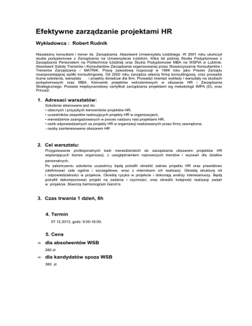 Efektywne zarządzanie projektami HR Wykładowca : Robert Rudnik Niezależny konsultant i trener ds. Zarządzania. Absolwent Uniwersytetu Łódzkiego. W 2001 roku ukończył studia podyplomowe z Zarządzania na Uniwersytecie Łódzkim. Kilka lat później Studia Podyplomowe z Zarządzania Personelem na Politechnice Łódzkiej oraz Studia Podyplomowe MBA na WSPiA w Lublinie. Absolwent Szkoły Trenerów i Konsultantów Zarządzania organizowanej przez Stowarzyszenie Konsultantów i Trenerów Zarządzania – MATRIK. Pracę zawodową rozpoczął w 1999 roku jako Prezes Zarządu nowopowstającej spółki konsultingowej. Od 2002 roku zarządza własną firmą konsultingową, oraz prowadzi liczne szkolenia, warsztaty i projekty doradcze dla firm. Prowadzi również wykłady i warsztaty na studiach podyplomowych oraz MBA. Kierownik projektów wdrożeniowych w obszarze HR i Zarządzania Strategicznego. Posiada międzynarodowy certyfikat zarządzania projektami wg metodologii IMPA (D), oraz Prince2. 1. Adresaci warsztatów: Szkolenie skierowane jest do: • obecnych i przyszłych kierowników projektów HR, • uczestników zespołów realizujących projekty HR w organizacjach, • menedżerów zaangażowanych w proces nadzoru nad projektami HR, • osób odpowiedzialnych za projekty HR w organizacji realizowanych przez firmy zewnętrzne. - osoby zainteresowane obszarem HR 2. Cel warsztatu: Przygotowanie profesjonalnych kadr menedżerskich do zarządzania obszarem projektów HR wspierających biznes organizacji, z uwzględnieniem najnowszych trendów i wyzwań dla działów personalnych. Po zakończeniu szkolenia uczestnicy będą potrafili określić zakres projektu HR oraz prawidłowo zdefiniować cele ogólne i szczegółowe, wraz z miernikami ich realizacji. Określą strukturę ról i odpowiedzialności w projekcie. Określą ryzyka w projekcie i dokonają analizy interesariuszy. Będą potrafili dekomponować projekt na zadania i czynności, oraz określić kolejność realizacji zadań w projekcie. Stworzą harmonogram Gannt’a 3. Czas trwania 1 dzień, 8h 4. Termin 07.12.2013, godz. 9:00-16:00. 5. Cena • dla absolwentów WSB 280 zł • dla kandydatów spoza WSB 360 zł 6. Program warsztatu : • • • • • • • • Charakterystyka projektów HR Metodologia pracy projektowej (fazy, podział ról, ogólne pojęcia, zasady) Przygotowanie i realizacja wybranych projektów HR Praca z harmonogramem Gantt’a Kryteria doboru zespołu projektowego Komunikacja w zespołach Ryzyko w projektach HR Budżetowanie projektów HR