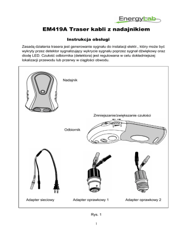 EM419A Traser kabli z nadajnikiem Instrukcja obsługi Zasadą działania trasera jest generowanie sygnału do instalacji elektr., który może być wykryty przez detektor sygnalizujący wykrycie sygnału poprzez sygnał dźwiękowy oraz diodę LED. Czułość odbiornika (detektora) jest regulowana w celu dokładniejszej lokalizacji przewodu lub przerwy w ciągłości obwodu. Nadajnik Zmniejszanie/zwiększanie czułości Odbiornik Adapter sieciowy Adapter oprawkowy 1 Rys. 1 1 Adapter oprawkowy 2 1. Instalowanie baterii Zdejmij pokrywę baterii odbiornika, włóż baterie 9V (6F22 lub równoważną) do przedziału baterii zwracając uwagę na właściwą polaryzację. 2. Sprawdzenie poprawności działania trasera a) Włóż wtyczkę 2 biegunową adaptora sieciowego do gniazd nadajnika a następnie podłącz wtyk do gniazda sieciowego (Rys. 2) . Powinna zapalić się czerwona dioda LED. Napięcie wystepujące w gnieździe sieciowym powinna być zgodne z specifikacją techniczną nadajnika. b) Odczekaj około 20s a następnie przekręć regulator czułości wykrywacza z pozycji OFF aż do usłyszenia charakterystycznego „kliknięcia” – zapali się wówczas zielona dioda LED. Oznacza to ustawienie maksymalnej czułości wykrywacza. Dalsze przekręcanie regulatora czułości bedzie zmniejszało czułość wykrywacza. c) Umieść odbiornik przy nadajniku, jak pokazano na Rys. 3, rozlegnie się sygnał detekcji oraz zapali się zielona dioda LED. Jeżeli traser zachowuje się jak opisano powyżej – działa on prawidłowo i może być stosowany do wykrywania przewodów. 3. Lokalizowanie przerw w obwodach oraz bezpieczników a) Wybierz właściwy adaptor, podłącz jego wtyki do gniazd nadajnika a następnie do gniazda sieciowego lub oprawy lampy – zaświeci się czerwona dioda LED. b) Zbliż wykrywacz do skrzynki bezpiecznikowej (lub wyłączników RCD), trzymaj go w pozycji pionowej – przesuń płaską powierzchnią czujnika wykrywacza w pobliżu wyłacznika RCD lub bezpiecznika (Rys. 4). Powoli przesuwaj odbiornik w górę i dół wzdłuż kolejnych bezpieczników lub wyłączników RCD. Wykrycie sygnału zostanie oznajmione dźwiękiem oraz zieloną diodą LED. Zmniejszając czułość przyrządu można zlokalizować dokładnie bezpiecznik (wyłącznik RCD), który odpowiada ze dany obwód. c) Po detekcji wyłącznika (lub bezpiecznika), wyłacz wyłącznik lub zdemontuj bezpiecznik, następnie użyj wykrywacza ustawiając maksymalna czułość i powtórz detekcje ponownie. Jeżeli wykrywacz nie zasygnalizuje sygnału nadajnika oznacza to,że wyłacznik (bezpiecznik) jest jedynym, który odpowiada ze dany obwód. Jeżeli detektor wykrywa sygnał wokół bezpiecznika – oznacza to, że ten wyłącznik (bezpiecznik) nie jest jedynym zabezpieczającym dany obwód. 2 Rys 2 Rys 3 Rys 4 UWAGI 1. Przed użyciem przyrządu należy upewnić się czy pobliżu nie znajduje się telefon komórkowy lub inne źródło zakłóceń 2. Zawsze przed użyciem testera należy przeprowadzić kolejne kroki zgodnie z punktem 2 niniejszej instrukcji (Sprawdzenie poprawności działania testera 3. Zachować ostrożność jeżeli pracujemy w bliskości przewodów elektrycznych pod napięciem dla uniknięcia porażenia elektrycznego. Stosować się do zasad dobrej praktyki przy pracach elektrycznych 4. Zawsze przed dotykaniem przewodu elektrycznego należy upewnić się stosując standardowy tester/próbnik, że nie znajduje się on pod napięciem 3 5. Jeżeli dioda LED odbiornika nie świeci lub jeżeli odbiornik nie pracuje normalnie należy wymienić baterię 6. Dla uniknięcia porażenia elektrycznego nie dotykać gołego przewodu ręką lub skórą. Nie dotykać uziemienia lub elementów obiektu połączonych z uziemieniem lub przewodem ochronnym podczas wykonywania testów. 7. Nie używać testera jeżeli jest uszkodzony lub pracuje nieprawidłowo 8. Nie operować testerem w miejscach, w których mogą znajdować się gazy (pyły) palne lub wybuchowe 9. Wartość nominalna napięcie wejściowego dopuszczalnego dla nadajnika jest oznaczona na obudowie nadajnika 10. Ten tester jest tylko narzędziem pomocniczym. Przed dokonywaniem jakichkolwiek zmian lub prac w obwodzie testowanym należy mieć pewność, że nie spowoduje to poważnych obrażeń, uszkodzeń lub strat. 4. Specyfikacja Nadajnik Odbiornik Napięcie wejściowe: 200~240V, 50/60Hz Zasilanie 9VDC: bateria 9V 6F22 szt 1 Wymiary: 50x31x80mm (szerxgłxwys) Wymiary: 90x38x186mm (szerxgłxwys) Masa: 58g Masa: 150g Wyposażenie: przewód z wtykiem szt 1, przewód z oprawką szt 1, instrukcja obsługi 5. Oświadczenie Zawarte w niniejszej instrukcji informacje nie mogą być jakąkolwiek podstawą do stosowania testera do jakichkolwiek innych aplikacji 6. Ochrona środowiska Urządzenie podlega dyrektywie WEEE 2002/96/EC. Symbol obok oznacza, że produkt musi być utylizowany oddzielnie i powinien być dostarczany do odpowiedniego punktu zbierającego odpady. Nie należy go wyrzucać razem z odpadami gospodarstwa domowego. Aby uzyskać więcej informacji, należy skontaktować się z przedstawicielem przedsiębiorstwa lub lokalnymi władzami odpowiedzialnymi za zarządzanie odpadami. 4