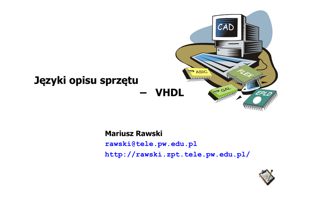 CAD Języki opisu sprzętu – VHDL Mariusz Rawski [email protected] http://rawski.zpt.tele.pw.edu.pl/ Języki opisu sprzętu • System cyfrowy może być opisany na różnych poziomach abstrakcji i z wykorzystaniem różnych sposobów reprezentacji. • Wraz z postępem procesu projektowego może to ulegać zmianie. • Wymagany jest sposób reprezentacji projektowanego systemu tak, by można było wymieniać informacje o projektowanym systemie między członkami grupy projektowej i komputerowymi narzędziami wspomagania projektowania CAD. • Języki opisu sprzętu HDL (Hardware Description Languages) służą temu celowi. Mariusz Rawski 2 Ograniczenia tradycyjnych języków programowania • Tradycyjne języki programowania ogólnego przeznaczenia modelują proces sekwencyjny. • W procesie sekwencyjnym operacje wykonywane są w kolejności – jedna na jednostkę czasową. • Operacje często zależą od wyników wcześniej wykonanych operacji, kolejność wykonania nie może zostać zmieniona – kolejność operacji ma znaczenie. • Zalety: – możliwość tworzenia algorytmu krok po kroku, – proces sekwencyjny odpowiada sposobowi działania komputerów. • Sposób działania systemu cyfrowego jest całkowicie inny niż w modelu sekwencyjnym: – wiele mniejszych elementów połączonych w sieć, – zmiany sygnałów aktywują połączone z nimi elementy do wykonania operacji, – operacje wykonywane współbieżnie. Mariusz Rawski 3 Zastosowania języków HDL • Program HDL wykorzystywany jest do: – dokumentacji – specyfikacja formalna sytemu i dokumentacja dla celów wymiany informacji między projektantami, użytkownikami i systemami CAD, – symulacji – dla celów weryfikacji działania projektowanego układu bez konieczności jego realizacji; symulator HDL pozwala modelować współbieżne operacje; program HDL wraz z generatorem testów i kodem kolekcjonującym odpowiedzi tworzy tzw. testbench który wykorzystywany jest przez symulator HDL do weryfikacji działania projektowanego układu, – syntezy – nowoczesny proces projektowy oparty jest na koncepcji transformacji wysokopoziomowego opisu funkcjonalnego na niskopoziomowy opis strukturalny; niektóre z etapów przekształcania opisu projektu mogą być wykonywane przez oprogramowanie do syntezy; oprogramowanie takie na podstawie kodu HDL realizuje projektowany układ z wykorzystanie elementów z biblioteki; wynikiem jest kod HDL opisujący strukturę syntetyzowanego układu. Mariusz Rawski 4 Cechy języka HDL • Charakterystyka układu cyfrowego opiera się na pojęciach jednostki projektowej, połączenia, współbieżności i zależności czasowych. • Podstawowe cechy nowoczesnego języka HDL to: – semantyka zawierająca koncepcję jednostki projektowej, połączenia, współbieżności i zależności czasowych, – możliwość opisu opóźnienia w propagacji sygnału i zależności czasowych, – konstrukcje umożliwiające opis realizacji strukturalnej, – udostępnianie instrukcji umożliwiających opis funkcjonalny układu w sposób znany z tradycyjnych języków programowania – możliwość efektywnego opisu operacji i struktur danych na poziomie bramek i przesłań między rejestrowych, – posiadanie konstrukcji umożliwiających projektowania w sposób hierarchiczny. Mariusz Rawski 5 VHDL • • • • Very high speed integrated Hardware Description Language Przyjęty jako przemysłowy standard języka HDL (IEEE Std 1076) Modyfikowany w 1987, 1993 i 2001 (VHDL-87, -93, -2001) Rozszerzenia (wybrane): – IEEE Std 1076.2-1996, VHDL Mathematical Packages – definiuje dodatkowe funkcje matematyczne dla liczb rzeczywistych i zespolonych, – IEEE Std 1076.3-1997, Synthesis Packages – definiuje arytmetyczne operacje na zestawach bitów, – IEEE Std 1076.6-1999, VHDL Register Transfer Level (RTL) Synthesis – definiuje podzbiór języka odpowiedni dla procesów syntezy, – IEEE Std 1164-1993 Multivalue Logic System for VHDL Modeling Interoperability (st_logic_1164) – definiuje nowe typy danych dla celów modelowania logiki wielowartościowej, – IEEE Std 1029.1-1998 VHDL Waveform and Vector Exchange to Support Design and Test Verification (WAVES) – definiuje sposób wykorzystania języka VHDL do wymiany danych w środowisku symulacyjnym. Mariusz Rawski 6 Podstawowe koncepcje języka VHDL Przykład • Układ detektora parzystości: – wejścia x2, x1, x0, – wyjście even • Wejścia zgrupowane w szynę • Wyjście aktywne, gdy w wektorze wejściowym jest parzysta liczba jedynek (0 lub 2) x2 x1 x0 even 0 0 0 1 0 0 1 0 0 1 0 0 0 1 1 1 1 0 0 0 1 0 1 1 1 1 0 1 1 1 1 0 • Wyrażenie boolowskie opisujące układ even = x2 x1 x0 + x2 x1 x0 + x2 x1 x0 + x2 x1 x0 Mariusz Rawski 7 Opis ogólny SOP (Sum-of-Product) Wykorzystywane biblioteki library ieee; use ieee.std_logic_1164.all; -- deklaracja jednostki entity even_detector_sop is port( x : in std_logic_vector(2 downto 0); even : out std_logic ); end even_detector_sop ; -- definicja architektury architecture sop_arch of even_detector_sop is signal p1, p2, p3, p4 : std_logic; begin p1 <= (not x(2)) and (not x(1)) and (not x(0)); p2 <= (not x(2)) and x(1) and x(0); p3 <= x(2) and (not x(1)) and x(0); p4 <= x(2) and x(1) and (not x(0)); even <= p1 or p2 or p3 or p4; end sop_arch; Mariusz Rawski Deklaracja jednostki projektowej Specyfikuje wejścia i wyjścia układu. Opisuje interfejs projektowanego urządzenia. X even 3 Architektura układu Między słowami kluczowymi begin i end specyfikuje działania i wewnętrzną organizację układu. Architektura skojarzona jest z konkretną jednostką projektową : architecture sop_arch of even_detector_sop is 8 Koncepcja realizacji architektury SOP library ieee; use ieee.std_logic_1164.all; Wprowadzenie sygnałów wejściowych do wnętrza układu -- deklaracja jednostki entity even_detector_sop is port( x : in std_logic_vector(2 downto 0); even : out std_logic ); end even_detector_sop ; Deklara