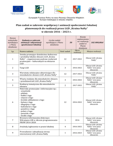 Europejski Fundusz Rolny na rzecz Rozwoju Obszarów Wiejskich: Europa inwestująca w obszary wiejskie. Plan zadań w zakresie współpracy i animacji społeczności lokalnej planowanych do realizacji przez LGD „Kraina Nafty” w okresie 2016 – 2023 r. Nazwa wskaźnika wynikająca z Planu działania: Zadania w zakresie animacji i aktywizacji spoełcznosci lokalnej Liczba zadań wynikająca z Planu działania: 50 Koszty zaplanowane na realizację zadań w Planie działania 102 000,00zł Ilość zadań Okres realizacji Miejsce realizacji 1 Stoiska promujące dziedzictwo kulturowe i produkty lokalne obszaru LGD „Kraina Nafty” – organizowane podczas wydarzeń promocyjno – kulturalnych na obszarze LGD 12 2017-2022 Obszar LGD „Kraina Nafty” 2 Targi LGD 3 2016-2022 Obszar LGD „Kraina Nafty” oraz poza obszarem 3 Warsztaty edukacyjno-aktywizujące dla mieszkańców obszaru LGD „Kraina Nafty” 12 2017-2022 Obszar LGD „Kraina Nafty” 4 Wizyty studyjne dla mieszkańców obszaru i przedstawicieli LGD „Kraina Nafty” 3 2016-2022 2 2017-2022 12 2016-2022 1 2016 Lp. 5 6 7 Nazwa zadania Konkursy tematyczne dla mieszkańców obszaru Materiały promocyjne i informacyjne np.: - wizytówki - plakaty - kubki z logo - smycze z logo - breloki odblaskowe z logo - balony z logo - długopisy z logo - kalendarze z logo - pendrivy z logo - polary z logo - parasole z logo - teczki z logo Broszura informacyjna dotycząca Wdrażania LSR w okresie programowania PROW 2014-2020 8 Artykuły/ogłoszenia w prasie lokalnej 4 2016-2022 9 Prowadzenie i aktualizacja strony internetowej LGD „Kraina Nafty 1 2016-2023 Obszar LGD „Kraina Nafty” oraz poza obszarem Obszar LGD „Kraina Nafty” Obszar LGD „Kraina Nafty” oraz poza obszarem Obszar LGD „Kraina Nafty” oraz poza obszarem Obszar LGD „Kraina Nafty” oraz poza obszarem Obszar LGD „Kraina Nafty” oraz poza obszarem Nazwa wskaźnika wynikająca z Planu działania: 10 Wydawnictwa promujące obszar LGD 11 Szkolenia dla społecznosci lokalnej dotyczące zasad udzielania wsparcia, przygotowywania dokumentów aplikacyjnych oraz rozliczania projektów/Grantów itp. 12 Spotkania informacyjnokonsultacyjne LGD z mieszkańcami Liczba zadań wynikająca z Planu działania: 4 10 25 2016-2022 Obszar LGD „Kraina Nafty” oraz poza obszarem 40 000,00 zł 2016-2022 Obszar LGD „Kraina Nafty” 4 000,00 zł 2016-2022 Obszar LGD „Kraina Nafty 4 000,00 zł SUMA KOSZTÓW NA AKTYWIZACJĘ I ANIMACJĘ WYNIKAJĄCA Z BUDŻETU LSR 13 Doradztwo w Biurze LGD 200 osób Koszty zaplanowane na realizację zadań w Planie działania 2016-2023 150 000,00 zł Biuro LGD „Kraina Nafty” 1 870 000,00 zł