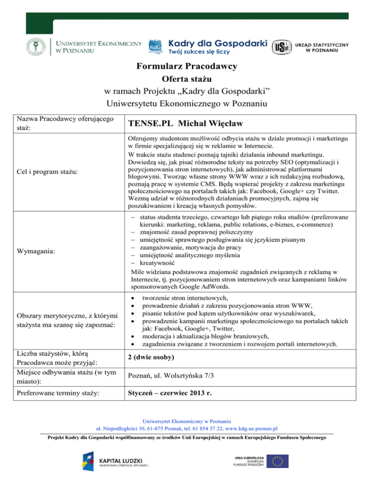 Formularz Pracodawcy Oferta stażu w ramach Projektu „Kadry dla Gospodarki” Uniwersytetu Ekonomicznego w Poznaniu Nazwa Pracodawcy oferującego staż: TENSE.PL Michał Więcław Cel i program stażu: Oferujemy studentom możliwość odbycia stażu w dziale promocji i marketingu w firmie specjalizującej się w reklamie w Internecie. W trakcie stażu studenci poznają tajniki działania inbound marketingu. Dowiedzą się, jak pisać różnorodne teksty na potrzeby SEO (optymalizacji i pozycjonowania stron internetowych), jak administrować platformami blogowymi. Tworząc własne strony WWW wraz z ich redakcyjną rozbudową, poznają pracę w systemie CMS. Będą wspierać projekty z zakresu marketingu społecznościowego na portalach takich jak: Facebook, Google+ czy Twitter. Wezmą udział w różnorodnych działaniach promocyjnych, zajmą się poszukiwaniem i kreacją własnych pomysłów. status studenta trzeciego, czwartego lub piątego roku studiów (preferowane kierunki: marketing, reklama, public relations, e-biznes, e-commerce) znajomość zasad poprawnej polszczyzny umiejętność sprawnego posługiwania się językiem pisanym zaangażowanie, motywacja do pracy umiejętność analitycznego myślenia kreatywność Mile widziana podstawowa znajomość zagadnień związanych z reklamą w Internecie, tj. pozycjonowaniem stron internetowych oraz kampaniami linków sponsorowanych Google AdWords. Wymagania: Obszary merytoryczne, z którymi stażysta ma szansę się zapoznać: Liczba stażystów, którą Pracodawca może przyjąć: Miejsce odbywania stażu (w tym miasto): Preferowane terminy staży: tworzenie stron internetowych, prowadzenie działań z zakresu pozycjonowania stron WWW, pisanie tekstów pod kątem użytkowników oraz wyszukiwarek, prowadzenie kampanii marketingu społecznościowego na portalach takich jak: Facebook, Google+, Twitter, moderacja i aktualizacja blogów branżowych, zagadnienia związane z tworzeniem i rozwojem portali internetowych. 2 (dwie osoby) Poznań, ul. Wolsztyńska 7/3 Styczeń – czerwiec 2013 r. Uniwersytet Ekonomiczny w Poznaniu al. Niepodległości 10, 61-875 Poznań, tel. 61 854 37 22, www.kdg.ue.poznan.pl Projekt Kadry dla Gospodarki współfinansowany ze środków Unii Europejskiej w ramach Europejskiego Funduszu Społecznego