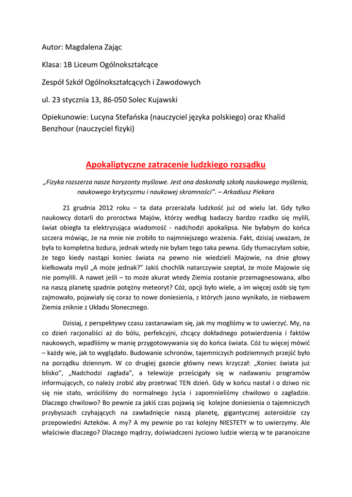 Autor: Magdalena Zając Klasa: 1B Liceum Ogólnokształcące Zespół Szkół Ogólnokształcących i Zawodowych ul. 23 stycznia 13, 86-050 Solec Kujawski Opiekunowie: Lucyna Stefańska (nauczyciel języka polskiego) oraz Khalid Benzhour (nauczyciel fizyki) Apokaliptyczne zatracenie ludzkiego rozsądku „Fizyka rozszerza nasze horyzonty myślowe. Jest ona doskonałą szkołą naukowego myślenia, naukowego krytycyzmu i naukowej skromności”. – Arkadiusz Piekara 21 grudnia 2012 roku – ta data przerażała ludzkość już od wielu lat. Gdy tylko naukowcy dotarli do proroctwa Majów, którzy według badaczy bardzo rzadko się mylili, świat obiegła ta elektryzująca wiadomość - nadchodzi apokalipsa. Nie byłabym do końca szczera mówiąc, że na mnie nie zrobiło to najmniejszego wrażenia. Fakt, dzisiaj uważam, że była to kompletna bzdura, jednak wtedy nie byłam tego taka pewna. Gdy tłumaczyłam sobie, że tego kiedy nastąpi koniec świata na pewno nie wiedzieli Majowie, na dnie głowy kiełkowała myśl „A może jednak?” Jakiś chochlik natarczywie szeptał, że może Majowie się nie pomylili. A nawet jeśli – to może akurat wtedy Ziemia zostanie przemagnesowana, albo na naszą planetę spadnie potężny meteoryt? Cóż, opcji było wiele, a im więcej osób się tym zajmowało, pojawiały się coraz to nowe doniesienia, z których jasno wynikało, że niebawem Ziemia zniknie z Układu Słonecznego. Dzisiaj, z perspektywy czasu zastanawiam się, jak my mogliśmy w to uwierzyć. My, na co dzień racjonaliści aż do bólu, perfekcyjni, chcący dokładnego potwierdzenia i faktów naukowych, wpadliśmy w manię przygotowywania się do końca świata. Cóż tu więcej mówić – każdy wie, jak to wyglądało. Budowanie schronów, tajemniczych podziemnych przejść było na porządku dziennym. W co drugiej gazecie główny news krzyczał: „Koniec świata już blisko”, „Nadchodzi zagłada”, a telewizje prześcigały się w nadawaniu programów informujących, co należy zrobić aby przetrwać TEN dzień. Gdy w końcu nastał i o dziwo nic się nie stało, wróciliśmy do normalnego życia i zapomnieliśmy chwilowo o zagładzie. Dlaczego chwilowo? Bo pewnie za jakiś czas pojawią się kolejne doniesienia o tajemniczych przybyszach czyhających na zawładnięcie naszą planetę, gigantycznej asteroidzie czy przepowiedni Azteków. A my? A my pewnie po raz kolejny NIESTETY w to uwierzymy. Ale właściwie dlaczego? Dlaczego mądrzy, doświadczeni życiowo ludzie wierzą w te paranoiczne wiadomości? Ba, sądzę, ze nawet wielu wykładowców i naukowców zapomniało o podstawowych prawach fizyki w tym czasie i podążyli za spanikowanym tłumem… Jak powiedział Arkadiusz Piekara „Fizyka rozszerza nasze horyzonty myślowe. Jest ona doskonałą szkołą naukowego myślenia, naukowego krytycyzmu i naukowej skromności”. Najpierw trzeba jednak pozwolić jej na rozszerzenie tych horyzontów myślenia, nie ograniczając się do bezkrytycznego przyjmowania opinii innych ludzi tak jak to było w przypadku domniemanego końca świata. Dlaczego ludzie tak łatwo dali się omamić tym doniesieniom? Trzeba przyznać, ze niemałą „zasługę” miały tutaj środki masowego przekazu, bombardujące nas informacjami o nadchodzącej apokalipsie. My, jako istoty chętnie słuchające opinii innych, zaczęliśmy się na nie natykać na każdym kroku – telewizja, radio, prasa a o Internecie to już nawet nie wspomnę. Nawet sąsiedzi między sobą rozmawiali na ten temat. I w ten sposób od nitki do kłębka znamy jeden z powodów, dlaczego ludzie tak bardzo przejęli się końcem świata. Na przyszłość, gdyby znów pojawiły się tego typu rewelacje, osoby cieszące się autorytetem np. w dziedzinach nauk ścisłych powinny bardziej zaangażować się w informowanie o tym, jak to jest naprawdę i jak znikoma jest szansa na to, że takie przepowiednie dojdą do skutku. Bo uświadamianie ludzi, że są w błędzie jest najlepszym sposobem na zapobieganie panice. Jak już wspominałam, na co dzień aż do bólu jesteśmy racjonalistami, jednak są takie chwile, gdy nasz rozum niczym szklany ekran telewizora się wyłącza i pozostaje jedynie uczucie strachu i bezsilności. Tak było i tym razem. Baliśmy się. Tak naprawdę baliśmy się co nas czeka. Jak powiedział Bertrand Russell „Strach jest głównym źródłem przesądu i jedyną przyczyną okrucieństwa”. Dawniej nasze przesądy ograniczały się do wykonywania pewnych czynności, które według mądrości ludowych miały przynosić szczęście. I chociaż niektórzy z nas żarliwie zapewniają, że nie ufają żadnym przesądom, które nie mają na nich żadnego wpływu, większość woli jednak iść okrężną drogą do szkoły po spotkaniu z czarnym kotem przed ważną klasówką z języka polskiego lub przynajmniej splunąć trzy razy nad lewym ramieniem prosto na nowe buty naszej polonistki. I co wtedy? Jednak nas dopada ten pech. „A trzeba było iść dłuższą drogą” – pomyśli wtedy delikwent. Niels Bohr mówił: „Mam na biurku podkowę, choć nie wierzę w przesądy. Sądzę bowiem, że czy ja wierzę, czy nie, ona i tak przynosi mi szczęście.” Ilu z nas zachowuje się w ten sposób? I co jest tego przyczyną? Strach. Najzwyczajniejszy w świecie strach. Lęk, obawa nieraz paraliżująca całe ciało, ograniczająca zdolność racjonalnego myślenia, powodująca przyspieszone bicie serca i przyspieszony oddech. Tak naprawdę boimy się tylu rzeczy. Na co dzień przykryci maską obojętności, takim niewidzialnym skafandrem, który jednak czasami uchyla się, pokazując niewielką przestrzeń, w którą uderzenie tak bardzo boli. I tego się tak bardzo boimy. Robimy więc prawie wszystko, aby unikać pecha i sytuacji zagrożenia. Tak samo postąpiliśmy przed 21 grudnia 2012 roku. Zamiast zastanowić się nad prawdą, woleliśmy zająć się budowaniem kosmicznych schronów, które przed 