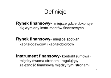Definicje Rynek finansowy- miejsce gdzie dokonuje się wymiany instrumentów finansowych Rynek finansowy- miejsce spotkań kapitałodawców i kapitałobiorców Instrument finansowy- kontrakt (umowa) między dwoma stronami, regulujący zaleŜność finansową między tymi stronami 1 Przykład Biorca kapitału: • Kredyt studencki • Kredyt hipoteczny • Kredyt konsumpcyjny Odsetki Jan Kowalski Dawca kapitału: • Lokaty bankowe • Zakup obligacji • Fundusz emerytalny • Fundusze inwestycyjne • Zakup akcji Oprocentowanie lokat i obligacji, dywidendy, świadczenia emerytalne, wzrost wartości instrumentów finansowych 2 Przepływy na rynku finansowym Pośrednicy Rynek finansowy Dawcy kapitału Przepływ instrumentów finansowych Biorcy kapitału Przepływ środków finansowych 3 Uczestnicy rynku finansowego Kapitałodawcy (nabywcy instrumentów finansowych): • Gospodarstwa domowe (np. zakup akcji, obligacji, lokata bankowa) • Przedsiębiorstwa (np. zakup bonów skarbowych) • Władze publiczne (np. lokowanie rezerw dewizowych) Kapitałobiorcy (wystawcy instrumentów finansowych): • Gospodarstwa domowe (np. kredyt hipoteczny) • Przedsiębiorstwa (np. emisja akcji lub obligacji) • Władze publiczne (np. emisja obligacji skarbowych lub komunalnych) 4 Uczestnicy rynku finansowego (2) Pośrednicy • Banki • Fundusze inwestycyjne • Fundusze emerytalne • Zakłady ubezpieczeń • Firmy asset management • Domy maklerskie 5 Uczestnicy rynku finansowego (3) Podmioty organizujące obrót instrumentami finansowymi • Giełdy • Brokerzy (np. obligacji skarbowych) • Domy maklerskie (market maker) • Instytucje rozliczeniowe (np. KDPW) 6 Uczestnicy rynku finansowego (4) Podmioty dostarczające informacje inwestorom i emitentom • Giełdy (np. publikacja indeksów) • Reuters • Bloomberg • Stacje telewizyjne (np. CNBC, DW TV, Bloomberg TV) • Prasa (Parkiet, FT, Wall Street Journal) 7 Uczestnicy rynku finansowego (5) Podmioty nadzorujące rynek finansowy (Polska) • Komisja Nadzoru Finansowego 8 Funkcje rynku finansowego • umoŜliwienie lokowania i pozyskiwania środków finansowych • tworzenie mechanizmu wyceny aktywów finansowych • koncentracja obrotu aktywami finansowymi • dywersyfikacja ryzyka inwestycyjnego • utrzymanie płynności inwestycji 9 Cechy instrumentów finansowych Denominowanie w wybranej walucie Podzielność Czas trwania Przewidywalność stopy zwrotu - Ryzyko Wymienialność Płynność ZłoŜoność Status podatkowy 10 Struktura rynku finansowego (1) Rynek pienięŜny Rynek kapitałowy Rynek instrumentów pochodnych Rynek walutowy 11 Struktura rynku finansowego (2) Rynek pierwotny Rynek wtórny Rynek giełdowy Rynek pozagiełdowy 12 Struktura rynku finansowego (3) Rynek natychmiastowy Rynek terminowy Rynek krajowy Rynek zagraniczny Rynek międzynarodowy 13 Inwestycje Finansowe Inwestycja (def. K.Jajuga) wyrzeczenie się bieŜącej konsumpcji dla przyszłych i niepewnych korzyści Cechy inwestycji: • Dochód • Ryzyko • Płynność 14