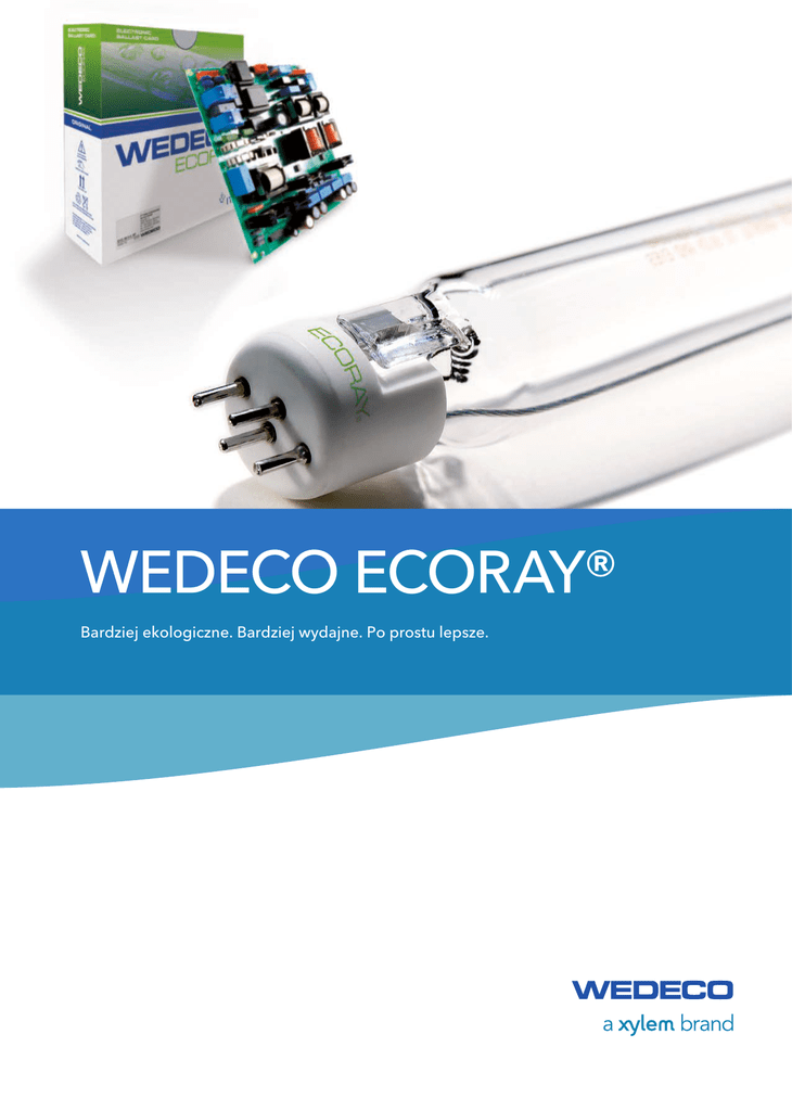 WEDECO ECORAY® Bardziej ekologiczne. Bardziej wydajne. Po prostu lepsze. Ekologiczna technologia ultrafioletowa Każdy z nas może odegrać swoją rolę w kształtowaniu lepszego środowiska poprzez świadome wybieranie energooszczędnych produktów, które wykorzystują zasoby w sposób rozważny. Nasz wkład nazywa się WEDECO ECORAY®. ECORAY jest najnowszą generacją niskociśnieniowych promienników ultrafioletowych firmy WEDECO o wysokiej wydajności i związanych z nimi kart balastowych. Technologia ECORAY jest bardziej wydajna, bardziej trwała, posiada dłuższą żywotność i większym stopniu zachowuje równowagę ekologiczną w porównaniu do wcześniejszych technologii UV WEDECO. Innowacyjna mieszanina gazu i amalgamatu Nowa osłona o długiej żywotności Promienniki UV WEDECO ECORAY wraz z kartami balastowymi stanowią kluczowy i najnowszy element wielu systemów UV WEDECO i ponadto są idealnymi częściami zamiennymi dla wielu instalacji na całym świecie odznaczając się wyśmienitym działaniem i gwarancją najwyższej jakości. Do 80% mniej rtęci* Zwiększona odporność fizyczna Podłącz i używaj do już istniejących instalacji 100% kontrola jakości: Wydajność UV każdego promiennika ECORAY jest testowana po zakończeniu procesu produkcji i certyfikowana zgodnie z normą DIN EN ISO 9001 2 Częstotliwość działania kart balastowych ECORAY jest świetnie dostrojona do specyficznych wymagań, jakie wynikają z właściwości promiennika UV ECORAY. Bardziej ekologiczne. Z wybranych przez nas materiałów do produkcji i pracy promienników dopracowaliśmy każdy aspekt , tak aby promiennik UV ECORAY był najbardziej przyjaznym środowisku promiennikiem ultrafioletowym WEDECO, jaki kiedykolwiek został wyprodukowany. » Promienniki UV ECORAY zawierają do 80% mniej rtęci* » Produkcja i logistyka spełnia najwyższe standardy środowiskowe potwierdzone certyfikatem zgodności z normą DIN EN ISO 14001 » Nawet o 500 kg mniejsza emisja CO2 na każdy promiennik UV* 1,2 Korzyści dla Ciebie: zrównoważone rozwiązanie dla naszego środowiska Relative UVC output 0,90 Bardziej wydajne. 12% 1,00 Promienniki UV są wykorzystywane przez znaczną część całego okresu ich użytkowania w trybie przyciemnionym, co oznacza, że zużycie energii jest dużo niższe. Zoptymalizowaliśmy promienniki UV ECORAY i karty balastowe ECORAY zgodnie z tym typowym trybem pracy. ECORAY® UV 0,80 0,70 25% Previous UV technology 0,60 0,50 » Niższe zużycie energii przy takiej samej pracy wyjściowej UVC* 15% 550 650 450 350 Ballast input power [W] = two lamps 750 » Wyższa moc wyjściowa UVC w trybie przyciemnionym* » Możliwe dłuższe, bardziej elastyczne działanie w trybie przyciemnionym Korzyści dla Ciebie: oszczędność energii średnio do 20%* 2 Po prostu lepsze. Pochodzące od światowego lidera w zaawansowanej technologicznie dezynfekcji, WEDECO ECORAY stanowi znaczący postęp w promiennikach UV i technologii kart balastowych. Długotrwałe testy przeprowadzone na całym świecie w naturalnych warunkach w wodzie i w oczyszczalniach ścieków potwierdziły odporne właściwości tych nowych produktów. » Polepszone właściwości starzenia się, potwierdzone przez stronę trzecią » Dłuższy czas pracy » Zwiększona odporność w celu zapobieżenia awariom i uszkodzeniom Korzyści dla Ciebie: długotrwałe, bezproblemowe działanie * Porównanie ECORAY ELR30 z SLR32143 4p HP (Spektrotherm). Różnice są możliwe w przypadku innych następnych artykułów. 1 Oszacowane na podstawie całkowitego zużycia energii w czasie gwarantowanej żywotności promiennika. Oparte na średnich danych emisyjnych przy wytwarzaniu energii w USA. Źródło: www.carbonfund.org 2 Zależy od rodzaju promiennika, użytego statecznika i trybu pracy systemu UV. Nie ponosimy odpowiedzialności za błędy w publikowanych informacjach 3 Promienniki UV WEDECO ECORAY i karty balastowe WEDECO ECORAY nadają się jako części zamienne dla wielu zainstalowanych systemów UV WEDECO. Ponadto, znakomite właściwości eksploatacyjne produktów ECORAY dają możliwość nowego podejścia do założeń kontroli. Wykorzystując dane wygenerowane przez operacyjny system UV, specjaliści WEDECO są w stanie doradzić odnośnie poprawy efektywności układu kontrolującego system UV, co prowadzi do jeszcze większej redukcji kosztów. Niniejsze audyty kontrolne są dokonywane jako jeden z elementów wyjątkowej usługi Totalcare oferowanej przez firmę Xylem. W sumie, do 20% całkowitych kosztów eksploatacyjnych może być zaoszczędzone dzięki wspólnemu zastosowaniu promiennikow UV WEDECO ECORAY i kart balastowych WEDECO ECORAY oraz naszego unikalnego zakresu usług. Inspekcja i audyt przeprowadzone w celu optymalizacji ustawień systemu, włączając w to modyfikację oprogramowania Twoja lista kontrolna TotalCare Zapytaj firmę WEDECO o produkty ECORAY odpowiednie dla Twojego systemu Wybierz ECORAY, gdy następnym razem będziesz wymieniał promienniki U V Po prostu wymień wadliwe karty balastowe na karty balastowe ECORAY Wezwij techników WEDECO, żeby ustawili programy i urządzenia sterujące Twoim systemem UV odpowiednio do nowych parametrów produktów ECORAY Korzyści dla Ciebie: bezproblemowe działanie i do 20% oszczędności w całkowitych kosztach eksploatacyjnych 1) Roślinne tkanki przewodzące, transportujące w górę rośliny wodę z substancjami odżywczymi 2) Wiodąca na świecie firma zajmująca się technologiami wody Zatrudniamy 12 tysięcy pracowników połączonych wspólnym celem: tworzenie innowacyjnych rozwiązań pozwalających na zapewnianie światowych potrzeb związanychz technologiami wody. Opracowywanie nowych technologii, które usprawnią sposób wykorzystania wody, jej oszczędzanie oraz ponowne wykorzystaniew przyszłości ma kluczowe znaczenie dla naszej pracy. Transportujemy, uzdatniamy, analizujemyizwracamy wodę do środowiska, pomagamy również ludziomw sku
