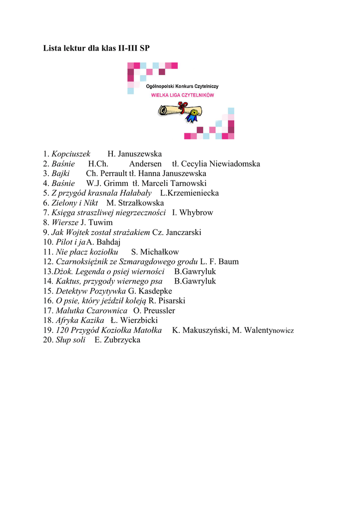 Lista lektur dla klas II-III SP 1. Kopciuszek H. Januszewska 2. Baśnie H.Ch. Andersen tł. Cecylia Niewiadomska 3. Bajki Ch. Perrault tł. Hanna Januszewska 4. Baśnie W.J. Grimm tł. Marceli Tarnowski 5. Z przygód krasnala Hałabały L.Krzemieniecka 6. Zielony i Nikt M. Strzałkowska 7. Księga straszliwej niegrzeczności I. Whybrow 8. Wiersze J. Tuwim 9. Jak Wojtek został strażakiem Cz. Janczarski 10. Pilot i ja A. Bahdaj 11. Nie płacz koziołku S. Michałkow 12. Czarnoksiężnik ze Szmaragdowego grodu L. F. Baum 13.Dżok. Legenda o psiej wierności B.Gawryluk 14. Kaktus, przygody wiernego psa B.Gawryluk 15. Detektyw Pozytywka G. Kasdepke 16. O psie, który jeździł koleją R. Pisarski 17. Malutka Czarownica O. Preussler 18. Afryka Kazika Ł. Wierzbicki 19. 120 Przygód Koziołka Matołka K. Makuszyński, M. Walentynowicz 20. Słup soli E. Zubrzycka