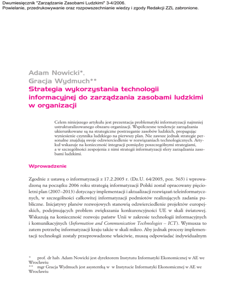 Dwumiesięcznik "Zarządzanie Zasobami Ludzkimi" 3-4/2006. Powielanie, przedrukowywanie oraz rozpowszechnianie wiedzy i zgody Redakcji ZZL zabronione. Adam Nowicki*, Gracja Wydmuch** Strategia wykorzystania technologii informacyjnej do zarz¹dzania zasobami ludzkimi w organizacji Adam Nowicki, Strategia wykorzystania Celem Gracja niniejszego Wydmuch technologii artyku³u informacyjnej... jest prezentacja problematyki informatyzacji najmniej ustrukturalizowanego obszaru organizacji. Wspó³czesne tendencje zarz¹dzania ukierunkowane s¹ na strategiczne postrzeganie zasobów ludzkich, propaguj¹c wyniesienie czynnika ludzkiego na pierwszy plan. Nie zawsze jednak strategie personalne znajduj¹ swoje odzwierciedlenie w rozwi¹zaniach technologicznych. Artyku³ wskazuje na koniecznoæ integracji pomiêdzy poszczególnymi strategiami, a w szczególnoci zespojenia z nimi strategii informatyzacji sfery zarz¹dzania zasobami ludzkimi. Wprowadzenie Zgodnie z ustaw¹ o informatyzacji z 17.2.2005 r. (Dz.U. 64/2005, poz. 565) i wprowadzon¹ na pocz¹tku 2006 roku strategi¹ informatyzacji Polski zosta³ opracowany piêcioletni plan (20072013) dotycz¹cy implementacji i aktualizacji rozwi¹zañ teleinformatycznych, w szczególnoci ca³kowitej informatyzacji podmiotów realizuj¹cych zadania publiczne. Inicjatywy planów rozwojowych stanowi¹ odzwierciedlenie projektów europejskich, podejmuj¹cych problem zwiêkszania konkurencyjnoci UE w skali wiatowej. Wskazuj¹ na koniecznoæ rozwoju pañstw Unii w zakresie technologii informacyjnych i komunikacyjnych (Information and Communication Technologies ICT). Wymusza to zatem potrzebê informatyzacji kraju tak¿e w skali mikro. Aby jednak procesy implementacji technologii zosta³y przeprowadzone w³aciwie, musz¹ odpowiadaæ indywidualnym * prof. dr hab. Adam Nowicki jest dyrektorem Instytutu Informatyki Ekonomicznej w AE we Wroc³awiu ** mgr Gracja Wydmuch jest asystentk¹ w w Instytucie Informatyki Ekonomicznej w AE we Wroc³awiu 20 Adam Nowicki, Gracja Wydmuch potrzebom organizacji. Dlatego te¿ konieczne jest opracowanie odpowiedniej strategii. Niniejszy artyku³ opiera siê na koncepcji strategicznego zarz¹dzania zasobami ludzkimi. Istot¹ usprawnienia tego obszaru dzia³alnoci przedsiêbiorstwa jest opracowanie odpowiedniej strategii implementacji technologii informacyjnej, spójnej z misj¹ i strategi¹ ca³ej organizacji. Przek³ada siê to w praktyce na budowê modelu systemu wspieraj¹cego strategiê zarz¹dzania zasobami ludzkimi i jego implementacjê. Przes³anki strategii personalnej w organizacji W ostatnich latach obserwujemy wiele zmian zachodz¹cych w organizacjach. Wynika to z szybkiego rozwoju gospodarki wiatowej, za czym idzie globalizacja rynkowa wyznaczaj¹ca zakres uwarunkowañ rodowiskowych i nak³adaj¹ca nowe wymagania dotycz¹ce osi¹gania przewagi rynkowej. Warunkiem konkurencyjnoci organizacji funkcjonuj¹cych w turbulentnym otoczeniu jest realizacja odpowiedniej strategii. W lad za stwierdzeniem Hendryego i Pettigrewa, i¿ ludzie stanowi¹ strategiczne bogactwo firmy [Armstrong, 2001, s. 38] idzie konkluzja, ¿e to w³anie zasoby ludzkie odgrywaj¹ kluczow¹ rolê w realizacji celów wspó³czesnej organizacji. Strategia zarz¹dzania, postrzegana jako zespó³ procesów informacyjno-decyzyjnych ukierunkowanych na osi¹ganie kluczowych dla przedsiêbiorstwa celów, ma za zadanie zwiêkszenie jego przewagi konkurencyjnej. Strategia personalna w ogólnym pojêciu powinna jasno okrelaæ cele i zadania stoj¹ce przed kadr¹ mened¿ersk¹, a dotycz¹ce odpowiedniej alokacji i wykorzystania czynnika ludzkiego, oraz metody ich realizacji. Istota tworzenia strategii personalnych podyktowana jest nastêpuj¹cymi wytycznymi: c turbulentne otoczenie o wysokim poziomie konkurencyjnoci c wyrane sp³aszczenie struktury organizacyjnej i decentralizacja procesów decyzyjnych c koniecznoæ sta³ego podnoszenia poziomu kwalifikacji i umiejêtnoci podyktowana rosn¹cym popytem na specjalistów c nowa filozofia zarz¹dzania zasobami ludzkimi (zzl) w organizacji, podkrelaj¹ca strategiczny aspekt czynnika ludzkiego c nowe trendy zarz¹dzania, jak np. zarz¹dzanie projektami, ukierunkowane na efektywn¹ pracê zespo³ow¹ c zmiany technologiczne ukierunkowane na komunikacjê i funkcjonowanie spo³eczeñstwa informacyjnego c efektywnoæ zarz¹dzania przez cele c wzrastaj¹ca rola wiedzy w organizacji. Strategia wykorzystania technologii informacyjnej... 21 Problem strategii personalnej powinien byæ jednak rozpatrywany na kilku p³aszczyznach (rys.1). P³aszczyzny te wyznaczane s¹ przez trzy czynniki, zobrazowane w modelu pod postaci¹ wymiarów strategii: cele, przes³anki i czas realizacji. Podstawê strategii (najni¿szy poziom) stanowi¹ zadania o celach perspektywicznych, przeznaczone do d³ugoterminowej realizacji, a przes³ankami do jej formu³owania s¹ bodce b¹d decyzje ukierunkowane na rozwój organizacji, na podnoszenie jej efektywnoci i osi¹ganie przewagi konkurencyjnej. W strategii personalnej istotê pierwszego poziomu stanowi ogólna, spójna ze strategi¹ i misj¹ ca³ej organizacji polityka dotycz¹ca wszystkich pracowników. Przyk³adem mo¿e byæ planowanie struktury zatrudnienia. Rysunek 1. Model poziomów strategicznych zarz¹dzania cele realizacja iori bie¿¹ca a poster realizacja krótkotermin owa realizacja d³ugotermin owa czas a priori dorane adaptacyjne rozwojowe perspektywiczna przes³anki ród³o: opracowanie w³asne Drugi poziom stanowi¹ strategie realizowane w krótszym czasie, dotycz¹ce rozwi¹zañ, jakie nale¿a³oby wprowadziæ w celu dostosowania przedsiêbiorstwa do zachodz¹cych zmian w otoczeniu b¹d wewn¹trz jego struktury. Przes³anki formu³owane s¹ na podstawie prognoz. Przyk³adem strategii personalnej drugiego poziomu jest reorganizacja dzia³u sprzeda¿y. Strategie trzeciego poziomu maj¹ z regu³y charakter dorany (defensywny). Realizowane s¹ w krótkim czasie, a cele to realizacja dzia³añ bie