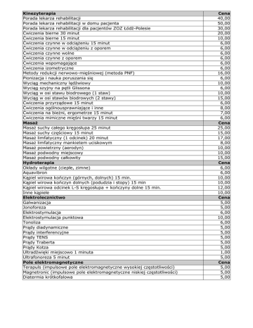 Kinezyterapia Porada lekarza rehabilitacji Porada lekarza rehabilitacji w domu pacjenta Porada lekarza rehabilitacji dla pacjentów ZOZ Łódź-Polesie Ćwiczenia bierne 30 minut Ćwiczenia bierne 15 minut Ćwiczenia czynne w odciążeniu 15 minut Ćwiczenia czynne w odciążeniu z oporem Ćwiczenia czynne wolne Ćwiczenia czynne z oporem Ćwiczenia wspomagające Ćwiczenia izometryczne Metody redukcji nerwowo-mięśniowej (metoda PNF) Pionizacja i nauka poruszania się Wyciąg mechaniczny lędźwiowy Wyciąg szyjny na pętli Glissona Wyciąg w osi stawu biodrowego (1 staw) Wyciąg w osi stawów biodrowych (2 stawy) Ćwiczenia przyrządowe 15 minut Ćwiczenia ogólnousprawniające i inne Ćwiczenia na bieżni, ergometrze 15 minut Ćwiczenia mimiczne mięśni twarzy 15 minut Masaż Masaż suchy całego kręgosłupa 25 minut Masaż suchy częściowy 15 minut Masaż limfatyczny (1 odcinek) 20 minut Masaż limfatyczny mankietem uciskowym Masaż powietrzny (aerodyn) Masaż podwodny miejscowy Masaż podwodny całkowity Hydroterapia Okłady wilgotne (ciepłe, zimne) Aquavibron Kąpiel wirowa kończyn (górnych, dolnych) 15 min. Kąpiel wirowa kończyn dolnych (podudzia i stopy) 15 min Kąpiel wirowa odcinek L-S kręgosłupa + kończyny dolne 15 min. Inne kąpiele Elektrolecznictwo Galwanizacja Jonoforeza Elektrostymulacja Elektrostymulacja punktowa Tonoliza Prądy diadynamiczne Prądy interferencyjne Prądy TENS Prądy Traberta Prądy Kotza Ultradźwięki miejscowo 1 minuta Ultrafonoreza 5 minut Pole elektromagnetyczne Terapuls (impulsowe pole elektromagnetyczne wysokiej częstotliwości) Magnetronic (impulsowe pole elektromagnetyczne niskiej częstotliwości) Diatermia krótkofalowa Cena 40,00 50,00 30,00 20,00 10,00 6,00 6,00 6,00 6,00 6,00 6,00 16,00 6,00 10,00 6,00 10,00 15,00 6,00 8,00 7,00 6,00 Cena 25,00 15,00 17,00 8,00 10,00 10,00 15,00 Cena 6,00 6,00 10,00 10,00 12,00 10,00 Cena 5,00 5,00 6,00 10,00 6,00 5,00 5,00 5,00 5,00 5,00 1,00 5,00 Cena 5,00 5,00 5,00 Światłolecznictwo Naświetlanie (Solux) ogólne i miejscowe Naświetlanie (podczerwień, ultrafiolet) ogólne i miejscowe Laseroterapia (skaner) 10 minut Laseropunktura 1 minuta Laseropunktura 5 minut Światło spolaryzowane Ciepłolecznictwo (termożele) Okłady parafinowe Krioterpia Krioterapia miejscowa (dwutlenek węgla) Krioterapia miejscowa (żel, lód, powietrze) Pakiety zabiegowe Pakiet „Przeciwobrzękowy” 1 Pakiet „Przeciwobrzękowy” 2 Pakiet „Bóle stawowe” 1 Pakiet „Bóle stawowe” 2 Pakiet „Przeciwzapalne” 1 Pakiet „Przeciwzapalne” 2 Pakiet „Zmiany zwyrodnieniowe” 1 Pakiet „Zmiany zwyrodnieniowe” 2 Pakiet „Zmiany zwyrodnieniowe” 3 Pakiet „Bóle kręgosłupa odc. L-S” 1 Pakiet „Bóle kręgosłupa odc. L-S” 2 Pakiet „Bóle kręgosłupa odc. C” 1 Pakiet „Bóle kręgosłupa odc. C” 2 Pakiet „Po Udarze” 1 Pakiet „Po Udarze” 2 Pakiet „Porażenie nerwu twarzowego” Pakiet „Po Urazie” 1 Pakiet „Po Urazie” 2 Pakiet „Po Urazie” 3 Pakiet „Przeciwbólowy” PAKIETY REHABILITACYJNE „PRZECIWOBRZĘKOWY” 1 - Masaż uciskowy mechaniczny (boa) – seria 10 zab. - Ćwiczenia w odciążeniu – 10 x 15 min. - Ćwiczenia wspomagane barku lewego lub prawego – 10 x 15 min „PRZECIWOBRZĘKOWY” 2 - Masaż uciskowy mechaniczny (boa) – seria 10 zab. - Ćwiczenia bierne kończyny górnej (lewej lub prawej) – 10 x 30 min. „BÓLE STAWOWE” 1 - Krioterapia miejscowa – seria 10 zab. - Ćwiczenia w odciążeniu – 10 x 15 min. - Ćwiczenia wspomagane – 10 x 15 min. „BÓLE STAWOWE” 2 - Pole magnetyczne – seria 10 zab. - Diadynamic – seria 10 zab. - Ćwiczenia w odciążeniu – 10 x 15 min. - Ćwiczenia wspomagane – 10 x 15 min. „PRZECIWZAPALNE” 1 - Terapuls lub DKF – seria 10 zab. - Jonoforeza – seria 10 zab. - Ćwiczenia w odciążeniu – 10 x 15 min. - Ćwiczenia wspomagane – 10 x 15 min. „PRZECIWZAPALNE” 2 - Lampa Sollux lub IR – seria 10 zab. - Galwanizacja – seria 10 zab. - Ćwiczenia w odciążeniu – 10 x 15 min. Cena 5,00 5,00 5,00 1,00 5,00 5,00 6,00 10,00 Cena 10,00 6,00 Cena 140,00 230,00 160,00 180,00 180,00 130,00 90,00 220,00 180,00 130,00 220,00 180,00 130,00 180,00 230,00 230,00 130,00 170,00 180,00 230,00 Cena 140,00 230,00 160,00 180,00 180,00 130,00 „ZMIANY ZWYRODNIENIOWE” 1 - Ultradźwięki – seria 10 x 5 min. - Ćwiczenia w odciążeniu – 10 x 15 min. „ZMIANY ZWYRODNIENIOWE” 2 - Lampa Sollux – seria 10 zab. - Ćwiczenia bierne i czynno-bierne, wspomagane – 10 x 30 min. „ZMIANY ZWYRODNIENIOWE” 3 - Laseroterapia (skaner) – seria 10 zab. - Jonoforeza – seria 10 zab. - Ćwiczenia w odciążeniu – 10 x 15 min. - Ćwiczenia wspomagane – 10 x 15 min. „BÓLE KRĘGOSŁUPA ODC. L – S” 1 - Lampa Sollux – seria 10 zab. - Prądy TENS – seria 10 zab. - Ćwiczenia wzmacniające gorset mięśniowy (ćwiczenia izometryczne lub czynne) – 10 x 15 min. „BÓLE KRĘGOSŁUPA ODC. L – S” 2 - Pole magnetyczne – seria 10 zab. - Prądy interferencyjne – seria 10 zab. - Wyciąg mechaniczny odc. L-S – 10 x 15 min. - Ćwiczenia w odciążeniu odc. L-S – 10 x 15 min. „BÓLE KRĘGOSŁUPA ODC. C” 1 - Laseroterapia (skaner) – seria 10 zab. - Prądy interferencyjne – seria 10 zab. - Wyciąg na pętli Glissona – 10 x 15 min. - Ćwiczenia izometryczne – 10 x 15 min. „BÓLE KRĘGOSŁUPA ODC. C” 2 - Ultradźwięki – seria 10 x 5 min. - Prądy interferencyjne – seria 10 zab. - Ćwiczenia izometryczne – 10 x 15 min. „PO UDARZE” 1 - Lampa Sollux – seria 10 zab. - Tonoliza – seria 10 zab. - Ćwiczenia przyrządowe – 10 x 15 min. - Ćwiczenia czynne z oporem – 10 x 15 min. „PO UDARZE” 2 - Tonoliza – seria 10 zab. - Ćwiczenia bierne i czynno-bierne (jednej kończyny) – 10 x 30 min. „PORAŻENIE NERWU TWARZOWEGO” - Lampa Sollux – seria 10 zab. - Elektrostymulacja – seria 10 zab. - Masaż połowy twarzy – 10 x 15 min. „PO URAZIE” 1 - Masaż w