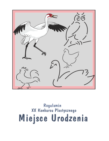 Regulamin XX Konkursu Plastycznego Miejsce Urodzenia XX Konkurs Plastyczny "Miejsce Urodzenia" PTAKI NASZYCH KRAJOBRAZÓW Jest to już 20. konkurs plastyczny "Miejsce Urodzenia". W tym roku tematem konkursu są PTAKI. I te domowe i leśne, małe i duże, mieszkające na stałe i te przelotem. Te, które widujemy w miastach, na wsi, na polu, łące, w sadzie, między wysokimi pokrzywami... Pokażmy ich życie, miejsca gdzie najczęściej przebywają, ich piękne "stroje" i zwyczaje. Przedstawmy je na wodzie, lądzie lub w powietrzu... Zapraszamy ... Organizator Ostrołęckie Centrum Kultury Cel konkursu Konkurs ma na celu rozwijanie wyobraźni i wrażliwości plastycznej młodych twórców, a także uświadomienie związku plastyki z otaczającym nas światem, jak również głębsze poznanie różnych technik malarskich. Techniki malarskie pastele suche, pastele olejne, tempera, akryl, olej, akwarela, ołówek. WARUNKI - wiek uczestników: 7-9 lat, 10-13 lat, 14-16 lat, 17-19 lat - format prac - max 40 x 50 cm - termin składania prac - 22 kwietnia 2013 r. - każda praca powinna być opisana czytelnie (pismem drukowanym) wg wzoru: Imię _______________ Nazwisko _______________________ Wiek ________________ Tytuł pracy _______________________________________ Szkoła/Instytucja _____________________________________ ____________________________________________________ Adres _______________________________________________ ____________________________________________________ Imię i nazwisko nauczyciela _____________________________ Tel. ________________________________________________ Organizator zastrzega, iż nie zwraca prac nadesłanych na konkurs oraz ma prawo do bezpłatnego publikowania prac. Rozstrzygnięcie konkursu połączone z wystawą odbędzie się 13 maja 2012 r. o godz. 11.00 w OCK, w hallu Kina Jantar. Prace prosimy nadsyłać na adres: Ostrołęckie Centrum Kultury 07-410 Ostrołęka ul. Inwalidów Wojennych 23 tel. 29 7664589 www.ock-ostroleka.pl