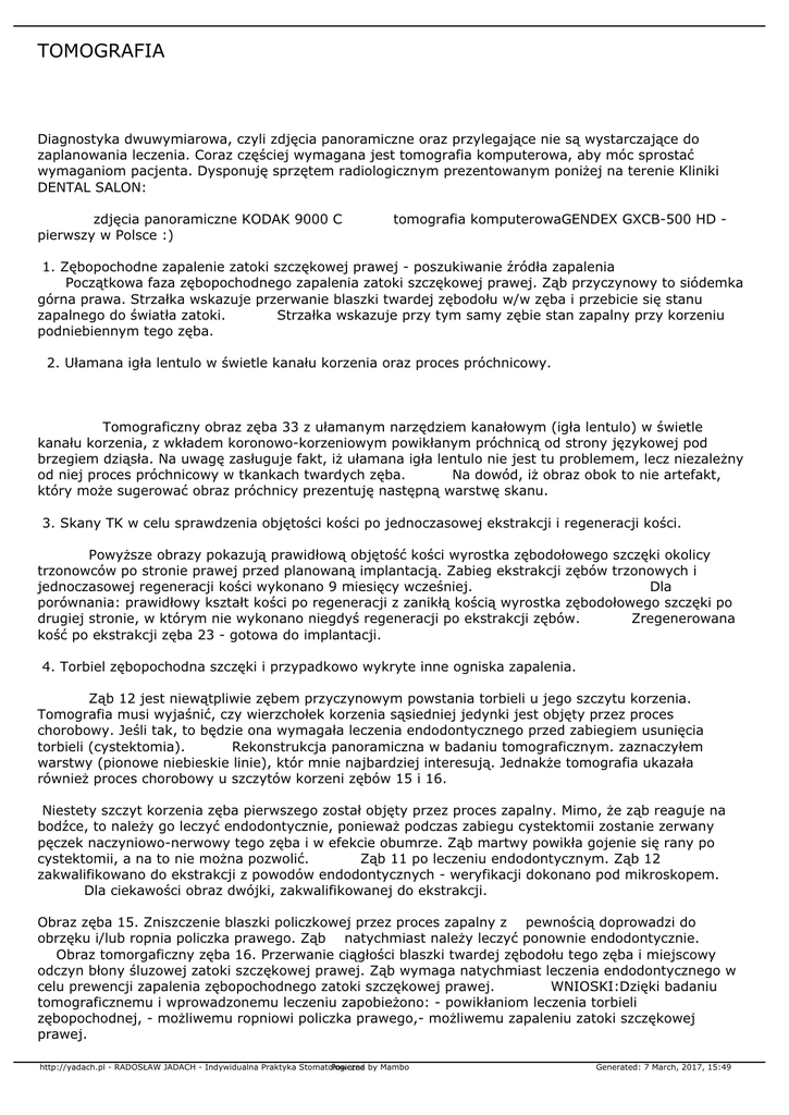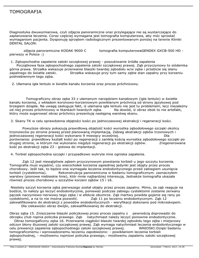 TOMOGRAFIA Diagnostyka dwuwymiarowa, czyli zdjęcia panoramiczne oraz przylegające nie są wystarczające do zaplanowania leczenia. Coraz częściej wymagana jest tomografia komputerowa, aby móc sprostać wymaganiom pacjenta. Dysponuję sprzętem radiologicznym prezentowanym poniżej na terenie Kliniki DENTAL SALON: zdjęcia panoramiczne KODAK 9000 C pierwszy w Polsce :) tomografia komputerowaGENDEX GXCB-500 HD - 1. Zębopochodne zapalenie zatoki szczękowej prawej - poszukiwanie źródła zapalenia Początkowa faza zębopochodnego zapalenia zatoki szczękowej prawej. Ząb przyczynowy to siódemka górna prawa. Strzałka wskazuje przerwanie blaszki twardej zębodołu w/w zęba i przebicie się stanu zapalnego do światła zatoki. Strzałka wskazuje przy tym samy zębie stan zapalny przy korzeniu podniebiennym tego zęba. 2. Ułamana igła lentulo w świetle kanału korzenia oraz proces próchnicowy. Tomograficzny obraz zęba 33 z ułamanym narzędziem kanałowym (igła lentulo) w świetle kanału korzenia, z wkładem koronowo-korzeniowym powikłanym próchnicą od strony językowej pod brzegiem dziąsła. Na uwagę zasługuje fakt, iż ułamana igła lentulo nie jest tu problemem, lecz niezależny od niej proces próchnicowy w tkankach twardych zęba. Na dowód, iż obraz obok to nie artefakt, który może sugerować obraz próchnicy prezentuję następną warstwę skanu. 3. Skany TK w celu sprawdzenia objętości kości po jednoczasowej ekstrakcji i regeneracji kości. Powyższe obrazy pokazują prawidłową objętość kości wyrostka zębodołowego szczęki okolicy trzonowców po stronie prawej przed planowaną implantacją. Zabieg ekstrakcji zębów trzonowych i jednoczasowej regeneracji kości wykonano 9 miesięcy wcześniej. Dla porównania: prawidłowy kształt kości po regeneracji z zanikłą kością wyrostka zębodołowego szczęki po drugiej stronie, w którym nie wykonano niegdyś regeneracji po ekstrakcji zębów. Zregenerowana kość po ekstrakcji zęba 23 - gotowa do implantacji. 4. Torbiel zębopochodna szczęki i przypadkowo wykryte inne ogniska zapalenia. Ząb 12 jest niewątpliwie zębem przyczynowym powstania torbieli u jego szczytu korzenia. Tomografia musi wyjaśnić, czy wierzchołek korzenia sąsiedniej jedynki jest objęty przez proces chorobowy. Jeśli tak, to będzie ona wymagała leczenia endodontycznego przed zabiegiem usunięcia torbieli (cystektomia). Rekonstrukcja panoramiczna w badaniu tomograficznym. zaznaczyłem warstwy (pionowe niebieskie linie), któr mnie najbardziej interesują. Jednakże tomografia ukazała również proces chorobowy u szczytów korzeni zębów 15 i 16. Niestety szczyt korzenia zęba pierwszego został objęty przez proces zapalny. Mimo, że ząb reaguje na bodźce, to należy go leczyć endodontycznie, ponieważ podczas zabiegu cystektomii zostanie zerwany pęczek naczyniowo-nerwowy tego zęba i w efekcie obumrze. Ząb martwy powikła gojenie się rany po cystektomii, a na to nie można pozwolić. Ząb 11 po leczeniu endodontycznym. Ząb 12 zakwalifikowano do ekstrakcji z powodów endodontycznych - weryfikacji dokonano pod mikroskopem. Dla ciekawości obraz dwójki, zakwalifikowanej do ekstrakcji. Obraz zęba 15. Zniszczenie blaszki policzkowej przez proces zapalny z pewnością doprowadzi do obrzęku i/lub ropnia policzka prawego. Ząb natychmiast należy leczyć ponownie endodontycznie. Obraz tomorgaficzny zęba 16. Przerwanie ciągłości blaszki twardej zębodołu tego zęba i miejscowy odczyn błony śluzowej zatoki szczękowej prawej. Ząb wymaga natychmiast leczenia endodontycznego w celu prewencji zapalenia zębopochodnego zatoki szczękowej prawej. WNIOSKI:Dzięki badaniu tomograficznemu i wprowadzonemu leczeniu zapobieżono: - powikłaniom leczenia torbieli zębopochodnej, - możliwemu ropniowi policzka prawego,- możliwemu zapaleniu zatoki szczękowej prawej. http://yadach.pl - RADOSŁAW JADACH - Indywidualna Praktyka Stomatologiczna Powered by Mambo Generated: 7 March, 2017, 15:49 5. Ropne zębopochodne zapalenie zatoki szczękowej lewej. Zdjęcie panoramiczne ukazuje stan zapalny przy zębie 26 (górna lewa szóstka) oraz pogrubiałą błonę śluzową zatoki szczękowej lewej lub poziom płynu w tej zatoce. Skierowano do leczenia endodontycznego. Na zdjęciu przylegającym jest za mało informacji, aby móc ocenić, czy ząb sąsiedni jest objęty procesem chorobowym, czy przejaśnienie wokół korzenia podniebiennego szóstki to torbiel, czy światło zatoki? Nie można również ocenić, czy w jej świetle jest płyn. Na podstawie tylko tego zdjęcia i panoramicznego nie można leczyć, należy wykonać tomografię komputerową. Skan TK: wyraźnie widać zniszczenie kości wokół zęba przyczynowego. Na kolejnych warstwach uwidoczniono również, że proces ten objął szczyty korzeni zęba sąsiedniego (siódemki) - skanów nie zawarto w tej prezentacji. Skany w płaszczyźnie czołowej: wyraźnie widać zniszczenie kości w kierunku do zatoki oraz blaszki podniebiennej. Po otwarciu zęba 26 zdrenowano przez kanały zęba około 10ml treści ropnej, zatem zacienie zatoki, było spowodowane treścią ropną. Zdjęcia śródzabiegowe wkrótce. Rekonstrukcja panoramiczna w badaniu TK: tu widać owalny kształt opisywanej zropiałej torbieli. http://yadach.pl - RADOSŁAW JADACH - Indywidualna Praktyka Stomatologiczna Powered by Mambo Generated: 7 March, 2017, 15:49