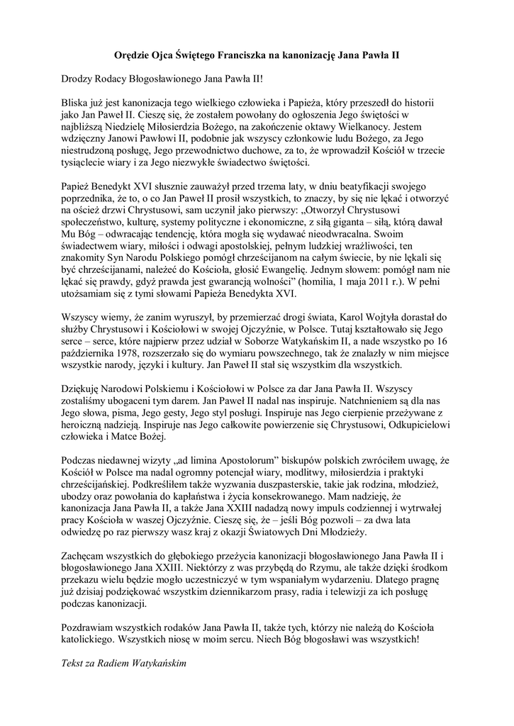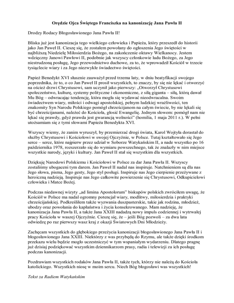 Orędzie Ojca Świętego Franciszka na kanonizację Jana Pawła II Drodzy Rodacy Błogosławionego Jana Pawła II! Bliska już jest kanonizacja tego wielkiego człowieka i Papieża, który przeszedł do historii jako Jan Paweł II. Cieszę się, że zostałem powołany do ogłoszenia Jego świętości w najbliższą Niedzielę Miłosierdzia Bożego, na zakończenie oktawy Wielkanocy. Jestem wdzięczny Janowi Pawłowi II, podobnie jak wszyscy członkowie ludu Bożego, za Jego niestrudzoną posługę, Jego przewodnictwo duchowe, za to, że wprowadził Kościół w trzecie tysiąclecie wiary i za Jego niezwykłe świadectwo świętości. Papież Benedykt XVI słusznie zauważył przed trzema laty, w dniu beatyfikacji swojego poprzednika, że to, o co Jan Paweł II prosił wszystkich, to znaczy, by się nie lękać i otworzyć na oścież drzwi Chrystusowi, sam uczynił jako pierwszy: „Otworzył Chrystusowi społeczeństwo, kulturę, systemy polityczne i ekonomiczne, z siłą giganta – siłą, którą dawał Mu Bóg – odwracając tendencję, która mogła się wydawać nieodwracalna. Swoim świadectwem wiary, miłości i odwagi apostolskiej, pełnym ludzkiej wrażliwości, ten znakomity Syn Narodu Polskiego pomógł chrześcijanom na całym świecie, by nie lękali się być chrześcijanami, należeć do Kościoła, głosić Ewangelię. Jednym słowem: pomógł nam nie lękać się prawdy, gdyż prawda jest gwarancją wolności” (homilia, 1 maja 2011 r.). W pełni utożsamiam się z tymi słowami Papieża Benedykta XVI. Wszyscy wiemy, że zanim wyruszył, by przemierzać drogi świata, Karol Wojtyła dorastał do służby Chrystusowi i Kościołowi w swojej Ojczyźnie, w Polsce. Tutaj kształtowało się Jego serce – serce, które najpierw przez udział w Soborze Watykańskim II, a nade wszystko po 16 października 1978, rozszerzało się do wymiaru powszechnego, tak że znalazły w nim miejsce wszystkie narody, języki i kultury. Jan Paweł II stał się wszystkim dla wszystkich. Dziękuję Narodowi Polskiemu i Kościołowi w Polsce za dar Jana Pawła II. Wszyscy zostaliśmy ubogaceni tym darem. Jan Paweł II nadal nas inspiruje. Natchnieniem są dla nas Jego słowa, pisma, Jego gesty, Jego styl posługi. Inspiruje nas Jego cierpienie przeżywane z heroiczną nadzieją. Inspiruje nas Jego całkowite powierzenie się Chrystusowi, Odkupicielowi człowieka i Matce Bożej. Podczas niedawnej wizyty „ad limina Apostolorum” biskupów polskich zwróciłem uwagę, że Kościół w Polsce ma nadal ogromny potencjał wiary, modlitwy, miłosierdzia i praktyki chrześcijańskiej. Podkreśliłem także wyzwania duszpasterskie, takie jak rodzina, młodzież, ubodzy oraz powołania do kapłaństwa i życia konsekrowanego. Mam nadzieję, że kanonizacja Jana Pawła II, a także Jana XXIII nadadzą nowy impuls codziennej i wytrwałej pracy Kościoła w waszej Ojczyźnie. Cieszę się, że – jeśli Bóg pozwoli – za dwa lata odwiedzę po raz pierwszy wasz kraj z okazji Światowych Dni Młodzieży. Zachęcam wszystkich do głębokiego przeżycia kanonizacji błogosławionego Jana Pawła II i błogosławionego Jana XXIII. Niektórzy z was przybędą do Rzymu, ale także dzięki środkom przekazu wielu będzie mogło uczestniczyć w tym wspaniałym wydarzeniu. Dlatego pragnę już dzisiaj podziękować wszystkim dziennikarzom prasy, radia i telewizji za ich posługę podczas kanonizacji. Pozdrawiam wszystkich rodaków Jana Pawła II, także tych, którzy nie należą do Kościoła katolickiego. Wszystkich niosę w moim sercu. Niech Bóg błogosławi was wszystkich! Tekst za Radiem Watykańskim