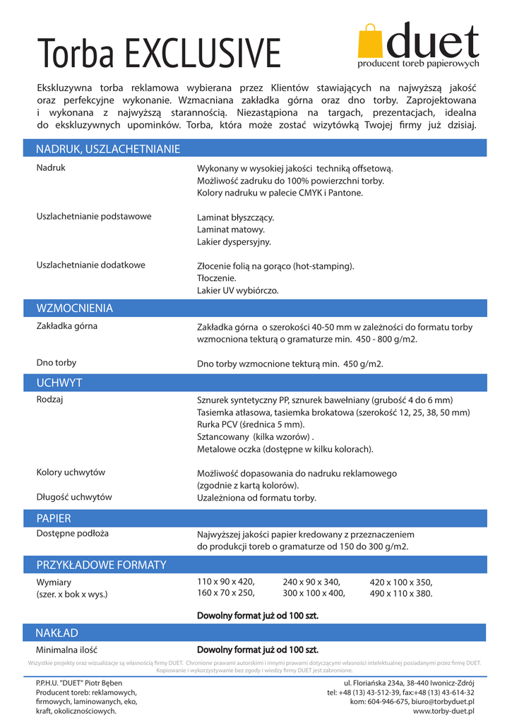 duet Torba EXCLUSIVE producent toreb papierowych Ekskluzywna torba reklamowa wybierana przez Klientów stawiających na najwyższą jakość oraz perfekcyjne wykonanie. Wzmacniana zakładka górna oraz dno torby. Zaprojektowana i wykonana z najwyższą starannością. Niezastąpiona na targach, prezentacjach, idealna do ekskluzywnych upominków. Torba, która może zostać wizytówką Twojej firmy już dzisiaj. NADRUK, USZLACHETNIANIE Nadruk Wykonany w wysokiej jakości techniką offsetową. Możliwość zadruku do 100% powierzchni torby. Kolory nadruku w palecie CMYK i Pantone. Uszlachetnianie podstawowe Laminat błyszczący. Laminat matowy. Lakier dyspersyjny. Uszlachetnianie dodatkowe Złocenie folią na gorąco (hot-stamping). Tłoczenie. Lakier UV wybiórczo. WZMOCNIENIA Zakładka górna Zakładka górna o szerokości 40-50 mm w zależności do formatu torby wzmocniona tekturą o gramaturze min. 450 - 800 g/m2. Dno torby Dno torby wzmocnione tekturą min. 450 g/m2. UCHWYT Rodzaj Sznurek syntetyczny PP, sznurek bawełniany (grubość 4 do 6 mm) Tasiemka atłasowa, tasiemka brokatowa (szerokość 12, 25, 38, 50 mm) Rurka PCV (średnica 5 mm). Sztancowany (kilka wzorów) . Metalowe oczka (dostępne w kilku kolorach). Kolory uchwytów Możliwość dopasowania do nadruku reklamowego (zgodnie z kartą kolorów). Uzależniona od formatu torby. Długość uchwytów PAPIER Dostępne podłoża Najwyższej jakości papier kredowany z przeznaczeniem do produkcji toreb o gramaturze od 150 do 300 g/m2. PRZYKŁADOWE FORMATY Wymiary (szer. x bok x wys.) 110 x 90 x 420, 160 x 70 x 250, 240 x 90 x 340, 300 x 100 x 400, 420 x 100 x 350, 490 x 110 x 380. Dowolny format już od 100 szt. NAKŁAD Minimalna ilość Dowolny format już od 100 szt. Wszystkie projekty oraz wizualizacje są własnością firmy DUET. Chronione prawami autorskimi i innymi prawami dotyczącymi własności intelektualnej posiadanymi przez firmę DUET. Kopiowanie i wykorzystywanie bez zgody i wiedzy firmy DUET jest zabronione. P.P.H.U. "DUET" Piotr Bęben Producent toreb: reklamowych, firmowych, laminowanych, eko, kraft, okolicznościowych. ul. Floriańska 234a, 38-440 Iwonicz-Zdrój tel: +48 (13) 43-512-39, fax:+48 (13) 43-614-32 kom: 604-946-675, [email protected] www.torby-duet.pl
