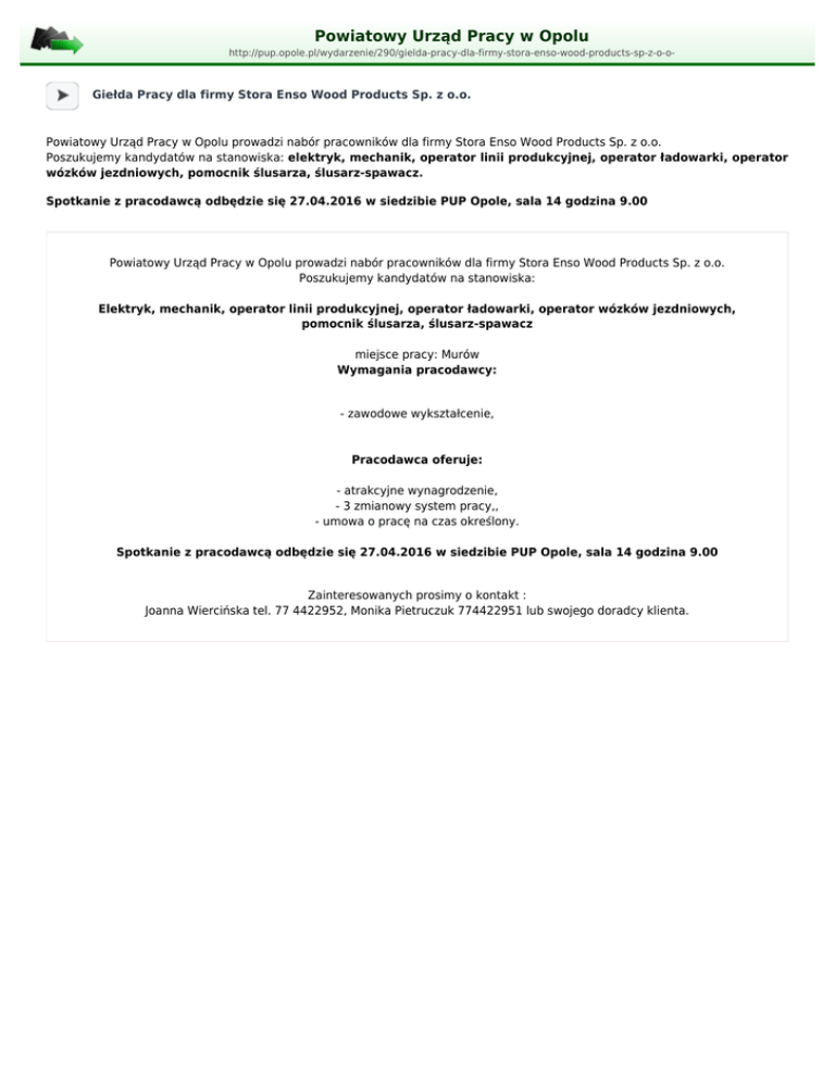 Powiatowy Urząd Pracy w Opolu http://pup.opole.pl/wydarzenie/290/gielda-pracy-dla-firmy-stora-enso-wood-products-sp-z-o-o- Giełda Pracy dla firmy Stora Enso Wood Products Sp. z o.o. Powiatowy Urząd Pracy w Opolu prowadzi nabór pracowników dla firmy Stora Enso Wood Products Sp. z o.o. Poszukujemy kandydatów na stanowiska: elektryk, mechanik, operator linii produkcyjnej, operator ładowarki, operator wózków jezdniowych, pomocnik ślusarza, ślusarz-spawacz. Spotkanie z pracodawcą odbędzie się 27.04.2016 w siedzibie PUP Opole, sala 14 godzina 9.00 Powiatowy Urząd Pracy w Opolu prowadzi nabór pracowników dla firmy Stora Enso Wood Products Sp. z o.o. Poszukujemy kandydatów na stanowiska: Elektryk, mechanik, operator linii produkcyjnej, operator ładowarki, operator wózków jezdniowych, pomocnik ślusarza, ślusarz-spawacz miejsce pracy: Murów Wymagania pracodawcy: - zawodowe wykształcenie, Pracodawca oferuje: - atrakcyjne wynagrodzenie, - 3 zmianowy system pracy,, - umowa o pracę na czas określony. Spotkanie z pracodawcą odbędzie się 27.04.2016 w siedzibie PUP Opole, sala 14 godzina 9.00 Zainteresowanych prosimy o kontakt : Joanna Wiercińska tel. 77 4422952, Monika Pietruczuk 774422951 lub swojego doradcy klienta.