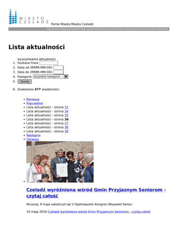 Portal Miasta Miasta Czeladź http://www.czeladz.pl/aktualnosci/lista_aktualnosci/Konferencja-Profilaktyka-i-interwencja-w-sytuacji-krzy/st:36/printpdf Lista aktualności wyszukiwarka aktualności 1. Szukana fraza 2. Data od (RRRR-MM-DD) 3. Data do (RRRR-MM-DD) 4. Kategorie wszystkie kategorie ... ▼ 5. Szukaj 6. Znaleziono 477 wiadomości. Pierwsza Poprzednia Lista aktualności - strona 33 Lista aktualności - strona 34 Lista aktualności - strona 35 Lista aktualności - strona 36 Lista aktualności - strona 37 Lista aktualności - strona 38 Lista aktualności - strona 39 Następna Ostatnia Czeladź wyróżniona wśród Gmin Przyjaznym Seniorom czytaj całość Wczoraj, 9 maja zakończył się V Ogólnopolski Kongres Obywatel Senior. 10 maja 2016 Czeladź wyróżniona wśród Gmin Przyjaznym Seniorom - czytaj całość Seniorzy wysłuchali koncertu - czytaj całość Czeladzcy Seniorzy gościli w sobotę w siedzibie Narodowej Orkiestry Symfonicznej Polskiego Radia w Katowicach. 10 maja 2016 Seniorzy wysłuchali koncertu - czytaj całość 103 urodziny Pani Marii Jurkiewicz - czytaj całość Kolejny piękny jubileusz w DPS „Senior” odbył się w poniedziałek 9 maja – swoje sto trzecie urodziny świętowała najstarsza mieszkańca Czeladzi pani Maria Jurkiewicz. Ten wyjątkowy dzień, jubilatka spędziła w gronie rodziny i przybyłych gości. 10 maja 2016 103 urodziny Pani Marii Jurkiewicz - czytaj całość Rodzinnie przejechali 10 km - czytaj całość W sobotę, 7.05.2016 roku odbył się „IV Rodzinny Rajd Rowerowy”, zorganizowany przez Miejski Ośrodek Sportu i Rekreacji w Czeladzi i GSW „Elektrownia”. 09 maja 2016 Rodzinnie przejechali 10 km - czytaj całość Obchody Dnia Zwycięstwa w Czeladzi - czytaj całość 8 maja obchodziliśmy Dzień Zwycięstwa, który został ustanowiony na pamiątkę zakończenia II wojny światowej w Europie. 09 maja 2016 Obchody Dnia Zwycięstwa w Czeladzi - czytaj całość Ruszył projekt „Wiosna z Seniorem” - czytaj całość Wczoraj w Miejskiej Bibliotece Publicznej Filii nr 2 odbyła się uroczysta inauguracja projektu „Wiosna z Seniorem”. 06 maja 2016 Ruszył projekt „Wiosna z Seniorem” - czytaj całość Uczcimy Dzień Zwycięstwa - czytaj całość W tym roku przypada 71. rocznica zakończenia II wojny światowej. 9 maja będziemy obchodzić w Czeladzi Narodowy Dzień Zwycięstwa. 06 maja 2016 Uczcimy Dzień Zwycięstwa - czytaj całość Rodzinny Rajd Rowerowy - czytaj całość W sobotę, 7 maja o godz. 9.30 spod kościoła św. Wojciecha przy ul. Składkowskiego ruszy IV Rodzinny Rajd Rowerowy "Czeladź 2016". 05 maja 2016 Rodzinny Rajd Rowerowy - czytaj całość Akcja Pisania Bajek - czytaj całość Uroczyste zakończenie Akcji Pisania Bajek odbędzie się w sobotę, 7 maja 2016 roku o godzinie 10.00 w Spółdzielczym Domu Kultury "Odeon". 05 maja 2016 Akcja Pisania Bajek - czytaj całość Industriada wystartuje w Czeladzi! - czytaj całość W tym roku święto turystki poprzemysłowej, jakim jest odbywająca się już po raz siódmy Industriada, odbędzie się 11 czerwca. 05 maja 2016 Industriada wystartuje w Czeladzi! - czytaj całość Pierwsza Poprzednia Lista aktualności - strona 33 Lista aktualności - strona 34 Lista aktualności - strona 35 Lista aktualności - strona 36 Lista aktualności - strona 37 Lista aktualności - strona 38 Lista aktualności - strona 39 Następna Ostatnia