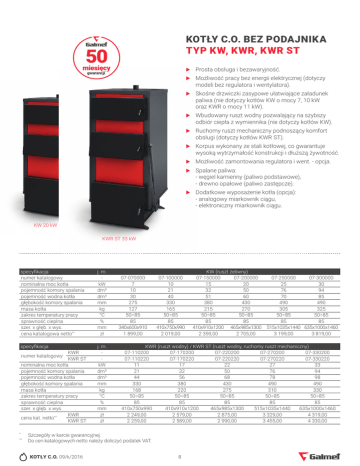 KOTŁY C.O. BEZ PODAJNIKA TYP KW, KWR, KWR ST 50 miesięcy gwarancji * X Prosta obsługa i bezawaryjność. X Możliwość pracy bez energii elektrycznej (dotyczy modeli bez regulatora i wentylatora). X Skośne drzwiczki zasypowe ułatwiające załadunek paliwa (nie dotyczy kotłów KW o mocy 7, 10 kW oraz KWR o mocy 11 kW). X Wbudowany ruszt wodny pozwalający na szybszy odbiór ciepła z wymiennika (nie dotyczy kotłów KW). X Ruchomy ruszt mechaniczny podnoszący komfort obsługi (dotyczy kotłów KWR ST). X Korpus wykonany ze stali kotłowej, co gwarantuje wysoką wytrzymałość konstrukcji i dłuższą żywotność. X Możliwość zamontowania regulatora i went. - opcja. X Spalane paliwa: - węgiel kamienny (paliwo podstawowe), - drewno opałowe (paliwo zastępcze). X Dodatkowe wyposażenie kotła (opcja): - analogowy miarkownik ciągu, - elektroniczny miarkownik ciągu. KW 20 kW KWR ST 33 kW specyfikacja numer katalogowy nominalna moc kotła pojemność komory spalania pojemność wodna kotła głębokość komory spalania masa kotła zakres temperatury pracy sprawność cieplna szer. x głęb. x wys. cena katalogowa netto** j. m. kW dm³ dm³ mm kg °C % mm zł specyfikacja j. m. kW dm³ dm³ mm kg °C % mm zł zł KWR KWR ST nominalna moc kotła pojemność komory spalania pojemność wodna kotła głębokość komory spalania masa kotła zakres temperatury pracy sprawność cieplna szer. x głęb. x wys. KWR cena kat. netto** KWR ST numer katalogowy * ** 07-070000 7 10 30 275 127 50÷85 85 340x600x910 1 899,00 07-100000 10 21 40 330 165 50÷85 85 410x750x990 2 019,00 KWR (ruszt wodny) / KWR ST (ruszt wodny, ruchomy ruszt mechaniczny) 07-110200 07-170200 07-220200 07-270200 07-330200 07-110220 07-170220 07-220220 07-270220 07-330220 11 17 22 27 33 21 32 50 76 94 44 56 68 78 98 330 380 430 490 490 168 220 275 310 330 50÷85 50÷85 50÷85 50÷85 50÷85 85 85 85 85 85 410x750x990 410x910x1200 465x985x1300 515x1035x1440 635x1000x1460 2 249,00 2 579,00 2 875,00 3 329,00 4 319,00 2 259,00 2 589,00 2 990,00 3 455,00 4 330,00 Szczegóły w karcie gwarancyjnej. Do cen katalogowych netto należy doliczyć podatek VAT. KOTŁY C.O. 09/k/2016 KW (ruszt żeliwny) 07-150000 07-200000 07-250000 07-300000 15 20 25 30 32 50 76 94 51 60 70 85 380 430 490 490 215 270 305 325 50÷85 50÷85 50÷85 50÷85 85 85 85 85 410x910x1200 465x985x1300 515x1035x1440 635x1000x1460 2 359,00 2 705,00 3 199,00 3 819,00 8 KOTŁY C.O. BEZ PODAJNIKA TYP KW, KWR, KWR ST 50 miesięcy gwarancji * X Możliwość górnego i dolnego spalania. X Prosta obsługa i bezawaryjność. X Dodatkowe dysze nadmuchowe zwiększające wydajność. X Wbudowany ruszt wodny pozwalający na szybszy odbiór ciepła z wymiennika (dotyczy kotłów KWR Z). X Korpus wykonany ze stali kotłowej, co gwarantuje wysoką wytrzymałość konstrukcji. X Czujnik c.w.u. i czujnik temperatury spalin w standardzie. X Spalane paliwa: - miał węglowy (paliwo podstawowe), - węgiel kamienny (paliwo zastępcze). X Dodatkowe wyposażenie umożliwiające pracę kotła w układzie zamkniętym (opcja): - wężownica zabezpieczająco-schładzająca, - zawór upustowo-schładzający DBV-1. KW Z 15 kW specyfikacja numer katalogowy nominalna moc kotła pojemność komory spalania pojemność wodna kotła masa kotła zakres temperatury pracy sprawność cieplna cena katalogowa netto** j. m. kW dm³ dm³ kg °C % zł specyfikacja numer katalogowy nominalna moc kotła pojemność komory spalania pojemność wodna kotła masa kotła zakres temperatury pracy sprawność cieplna cena katalogowa netto** j. m. kW dm³ dm³ kg °C % zł * ** KW Z (ruszt żeliwny, regulator TECH) 07-150015 07-200015 07-300015 15 20 30 33 45 96 50 65 100 210 272 400 50÷85 50÷85 50÷85 87 87 87 3 039,00 3 190,00 4 949,00 KWR Z (ruszt wodny, reg. TECH) 07-170215 07-220215 07-350215 17 22 35 33 45 96 52 68 110 215 295 405 50÷85 50÷85 50÷85 86 86 86 3 259,00 3 559,00 4 999,00 Szczegóły w karcie gwarancyjnej. Do cen katalogowych netto należy doliczyć podatek VAT. KOTŁY C.O. 09/k/2016 9 KW Z (ruszt żeliwny, regulator ELSTER) 07-450015 07-650015 07-950015 45 65 95 142 205 275 150 210 290 465 950 1420 50÷85 50÷85 50÷85 87 87 87 6 715,00 9 279,00 15 519,00 KWR Z (ruszt wodny, reg. ELSTER) 07-500215 07-700215 07-100615 07-150615 50 70 100 150 142 205 275 345 163 220 300 320 465 950 1420 1800 50÷85 50÷85 50÷85 50÷85 86 86 86 86 6 715,00 9 279,00 16 120,00 21 154,00