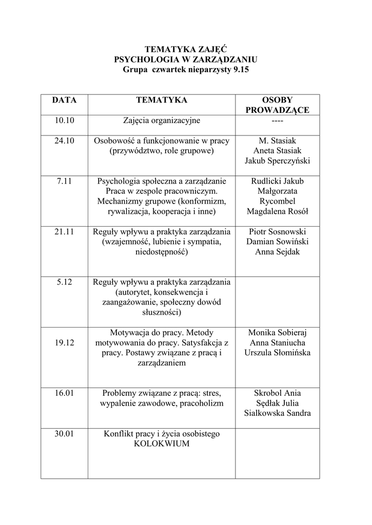 TEMATYKA ZAJĘĆ PSYCHOLOGIA W ZARZĄDZANIU Grupa