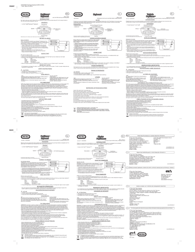 FRONT 624322E4C PopTunes Keyboard (0411-0-E4C) • Color: Black on White PopTunes Keyboard Item no.: 624322E4C ENG TM Age 2+ Years ADULT BATTERY INSTALLATION REQUIRED INTRODUCTION Get ready to play your own hot tunes on this cool Keyboard! Or push a button and play along with five fun songs included on this, full-octave, light-up Keyboard! Rock on! • 1 Little Tikes® Poptunes™ Keyboard Wiek: +2 lata WYMAGANA INSTALACJA BATERII PRZEZ OSOBĘ DOROSŁĄ MLT624322 CONTENTS Song Buttons ZAWARTOŚĆ Keyboard Keys Baterie dołączone do zestawu służą do demonstracji funkcji produktu w sklepie. Zaleca się wymianę baterii na nowe, przez osobę dorosłą, przed rozpoczęciem zabawy, w celu maksymalnego wykorzystania funkcji zabawki. 1.5V AA/LR6 1.5V AA/LR6 3 x AA Batteries 1,5V AA/LR6 1,5V AA/LR6 3 baterie « AA » IMPORTANT NOTES • If the Keyboard is not played for awhile, it will go to “sleep” to conserve battery power. To wake it up again, simply press any Song Button or Keyboard Key. SAFETY INSTRUCTIONS 1. DO NOT sit or stand on any part of the Keyboard. 2. DO NOT drop or throw the Keyboard. 3. DO NOT expose your Keyboard to moisture of any kind. "DO YOU LOVE ME" by Berry Gordy © 1962 Renewed 1990 JOBETE MUSIC CO., INC. All Rights Controlled and Administered by EMI APRIL MUSIC INC. (ASCAP) All Rights Reserved. International Copyright Secured. Used by Permission. "ABC" by Alphonso Mizell, Freddie Perren, Deke Richards, and Berry Gordy, Jr. © 1970 Renewed 1998 JOBETE MUSIC CO., INC. All Rights Controlled and Administered by EMI APRIL MUSIC INC. (ASCAP) All Rights Reserved. International Copyright Secured. Used by Permission. • Si el teclado permanece inactivo por un tiempo, pasará al modo sleep para ahorrar energía. Para activarlo de nuevo, basta con pulsar el teclado o uno de los botones de canciones. ATENCIÓN: ŚRODKI OSTROŻNOŚCI FCC COMPLIANCE NOTE: This equipment has been tested and found to comply with the limits for a Class B digital device, pursuant to Part 15 of the FCC Rules. These limits are designed to provide reasonable protection against harmful interference in a residential installation. This equipment generates, uses and can radiate radio frequency energy and, if not installed and used in accordance with the instructions, may cause harmful interference to radio communications. However, there is no guarantee that interference will not occur in a particular installation. If this equipment does cause harmful interference to radio or television reception, which can be determined by turning the equipment off and on, the user is encouraged to try to correct the interference by one or more of the following measures: • Reorient or relocate the receiving antenna. • Increase the separation between the equipment and receiver. • Connect the equipment into an outlet on a circuit different from that to which the receiver is connected. • Consult the dealer or an experienced radio/TV technician for help. This device complies with Part 15 of the FCC Rules. Operation is subject to the following two conditions: (1) This device may not cause harmful interference, and (2) this device must accept any interference received, including interference that may cause undesired operation. Caution: Modifications not authorized by the manufacturer may void users authority to operate this device. This Class B digital apparatus complies with Canadian ICES-003. SAFE BATTERY USAGE • Use alkaline batteries for best performance and longer life. • Use only the type battery recommended for the unit. • Batteries should be replaced only by an adult. • Insert batteries with the correct polarity ( + and – ). • Do not mix old and new batteries. • Do not mix alkaline, standard (carbon-zinc), or rechargeable (nickel-cadmium) batteries. • Do not short-circuit batteries. • When not used for an extended time, remove batteries to prevent possible leakage and damage to the unit. • Do not mix rechargeable and non-rechargeable batteries. • Rechargeable batteries are to be removed from the toy before charging. • Rechargeable batteries are to be recharged only under adult supervision. • Do not recharge non-rechargeable batteries. • Exhausted batteries are to be removed from the toy. • Do not dispose of batteries in fire as they may leak or explode. UTWORY "ABC" d‛Alphonso Mizell, Freddie Perren, Deke Richards et Berry Gordy, Jr. © 1970 Remixé 1998 JOBETE MUSIC CO., INC. Tous droits contrôlés et administrés par EMI APRIL MUSIC INC. (ASCAP) Tous droits réservés. Protégé par droit d‛auteur international. Utilisé avec permission. INSTRUCCIONES SOBRE SEGURIDAD 1. NO se siente ni se ponga de pie sobre ninguna parte del teclado. 2. NO arroje el teclado ni lo deje caer. 3. NO deje el teclado expuesto a la humedad. AUTORÍA DE CANCIONES "ABC" por Alphonso Mizell, Freddie Perren, Deke Richards, y Berry Gordy, Jr. © 1970 renovado en 1998 JOBETE MUSIC CO., INC. Todos los derechos son controlados y administrados por EMI APRIL MUSIC INC. (ASCAP) Reservados todos los derechos. Protegido por derechos de autor internacionales. Usado bajo licencia. "DO YOU LOVE ME" de Berry Gordy © 1962 Remixé 1990 JOBETE MUSIC CO., INC. Tous droits contrôlés et administrés par EMI APRIL MUSIC INC. (ASCAP) Tous droits réservés. Protégé par droit d‛auteur international. Utilisé avec permission. "DO YOU LOVE ME" por Berry Gordy © 1962 renovado en 1990 JOBETE MUSIC CO., INC. Todos los derechos son controlados y administrados por EMI APRIL MUSIC INC. (ASCAP) Reservados todos los derechos. Protegido por derechos de autor internacionales. Usado bajo licencia. CONFORMIDAD CON LOS REQUISITOS DE LA FCC NOTA: Este equipo ha sido probado y se encontró que cumple con los límites para la Clase B del dispositivo digital, de conformidad con el Apartado 15 del Reglamento FCC. Estos límites son designados para proporcionar una protección razonable contra interferencia dañina en una instalación