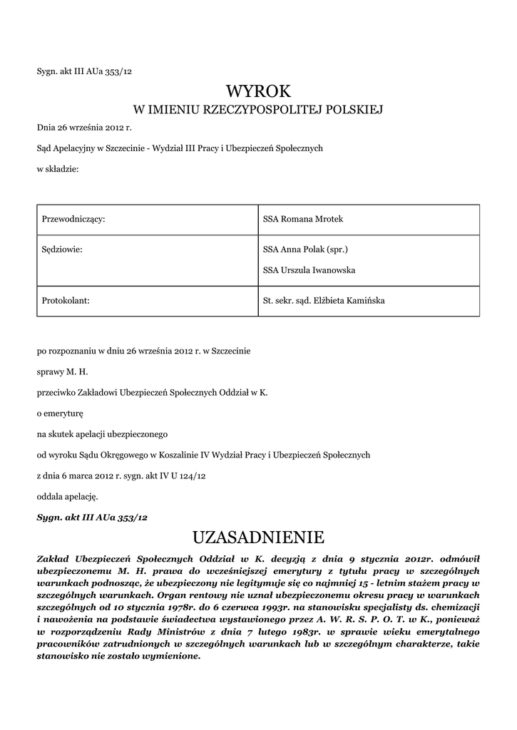 Sygn. akt III AUa 353/12 WYROK W IMIENIU RZECZYPOSPOLITEJ POLSKIEJ Dnia 26 września 2012 r. Sąd Apelacyjny w Szczecinie - Wydział III Pracy i Ubezpieczeń Społecznych w składzie: Przewodniczący: SSA Romana Mrotek Sędziowie: SSA Anna Polak (spr.) SSA Urszula Iwanowska Protokolant: St. sekr. sąd. Elżbieta Kamińska po rozpoznaniu w dniu 26 września 2012 r. w Szczecinie sprawy M. H. przeciwko Zakładowi Ubezpieczeń Społecznych Oddział w K. o emeryturę na skutek apelacji ubezpieczonego od wyroku Sądu Okręgowego w Koszalinie IV Wydział Pracy i Ubezpieczeń Społecznych z dnia 6 marca 2012 r. sygn. akt IV U 124/12 oddala apelację. Sygn. akt III AUa 353/12 UZASADNIENIE Zakład Ubezpieczeń Społecznych Oddział w K. decyzją z dnia 9 stycznia 2012r. odmówił ubezpieczonemu M. H. prawa do wcześniejszej emerytury z tytułu pracy w szczególnych warunkach podnosząc, że ubezpieczony nie legitymuje się co najmniej 15 - letnim stażem pracy w szczególnych warunkach. Organ rentowy nie uznał ubezpieczonemu okresu pracy w warunkach szczególnych od 10 stycznia 1978r. do 6 czerwca 1993r. na stanowisku specjalisty ds. chemizacji i nawożenia na podstawie świadectwa wystawionego przez A. W. R. S. P. O. T. w K., ponieważ w rozporządzeniu Rady Ministrów z dnia 7 lutego 1983r. w sprawie wieku emerytalnego pracowników zatrudnionych w szczególnych warunkach lub w szczególnym charakterze, takie stanowisko nie zostało wymienione. Ubezpieczony M. H. nie zgodził się z decyzją organu rentowego, wniósł o jej zmianę poprzez przyznanie mu prawa do wcześniejszej emerytury i zaliczenie stażu pracy od 10 stycznia 1978r. do 6 czerwca 1993r. do pracy w szczególnych warunkach na stanowisku magazyniera środków chemicznych i specjalisty ds. chemizacji i nawożenia. Organ rentowy w odpowiedzi na odwołanie wniósł o jego oddalenie, podtrzymując argumentację jak w zaskarżonej decyzji. Sąd Okręgowy w Koszalinie IV Wydział Pracy i Ubezpieczeń Społecznych wyrokiem z dnia 6 marca 2012 r., oddalił odwołanie ubezpieczonego od decyzji Zakładu Ubezpieczeń Społecznych Oddział w K. z dnia 9 stycznia 2012 r., znak (...). Swoje rozstrzygnięcie Sąd Okręgowy oparł na następujących ustaleniach faktycznych i rozważaniach prawnych. Ubezpieczony M. H. urodził się 5 grudnia 1951 r. W dniu 28 listopada 2011 r. złożył wniosek do organu rentowego o ustalenie uprawnień do wcześniejszej pracowniczej emerytury z tytułu pracy w szczególnych warunkach. Sąd Okręgowy uznał, że odwołanie ubezpieczonego nie zasługiwało na uwzględnienie. Uzasadniając swoje stanowisko w sprawie, sąd pierwszej instancji wskazał, że p rzedmiot sporu w niniejszej sprawie sprowadzał się do ustalenia, czy ubezpieczony legitymuje się co najmniej 15 letnim okresem pracy w szczególnych warunkach lub w szczególnym charakterze. Ze świadectwa pracy wystawionego przez A. W. R. S. P. O. T. w K. wynika, że ubezpieczony w okresie od 10 stycznia 1978 r. do 6 czerwca 1993 r. pracował na stanowisku specjalisty ds. chemizacji i nawożenia, natomiast z zeznań świadków , W. L. i W. S., któremu Sąd Okręgowy dał wiarę wynika, że ubezpieczony pracował w spornym okresie stale i w pełnym wymiarze czasu pracy na stanowisku magazyniera środków chemizacyjnych. Zdaniem Sądu pierwszej instancji p rzeprowadzone podstępowanie dowodowe, a w szczególności zeznania przesłuchanych świadków, jak również dołączone do sprawy akta osobowe ubezpieczonego potwierdziły, że pracował on na stanowisku magazyniera i starszego specjalisty ds. chemizacji. Zarówno stanowisko specjalisty ds. chemizacji i nawożenia, jak również magazyniera nie jest wymienione w wykazie A rozporządzenia Rady Ministrów z dnia 7.02.1983r. w sprawie wieku emerytalnego pracowników zatrudnionych w szczególnych warunkach oraz w wykazie B Dziale VIII pod pozycją 3 zarządzenia Ministra Rolnictwa i Gospodarki Żywnościowej z dnia 14 lipca 1983r. jako praca w szczególnych warunkach lub w szczególnym charakterze. Sąd Okręgowy w swoich rozważaniach podkreślił, że z przywileju przejścia na emeryturę w niższym wieku emerytalnym przysługującym pracownikom zatrudnionym w szczególnych warunkach lub w szczególnym charakterze, mogą korzystać wyłącznie pracownicy, którzy byli rzeczywiście zatrudnieni stale i w pełnym wymiarze czasu pracy oraz pracowali w szkodliwych warunkach. Skoro ubezpieczony nie wykazał, że pracował przez okres co najmniej 15 lat w szczególnych warunkach lub w szczególnym charakterze to nie spełnia łącznie wszystkich przesłanek do uzyskania prawa do emerytury na podstawie art. 184 ustawy emerytalnej. Brak jednej z przesłanek do nabycia prawa do emerytury jest równoznaczny z brakiem uprawnień do tego świadczenia. Mając powyższe na uwadze Sąd Okręgowy zgodnie z art. 477 wyroku. 14 § 1 k.p.c. orzekł jak w sentencji Od wyroku Sądu Okręgowego w Koszalinie apelację wniósł ubezpieczony M. H., wdanemu rozstrzygnięciu zarzucił: - błędy w ustaleniach faktycznych mając e istotny wpływ na kierunek rozstrzygnięcia przede wszystkim poprzez pominięcie wykazywanego przed organem i w toku postępowania faktu, że ubezpieczony wykonywał stale i w pełnym wymiarze pracę w szczególnych warunkach w rozumieniu § 1 pkt 1 Rozporządzenia Rady Ministrów z dnia 7 lutego 1983 r. w sprawie wieku emerytalnego pracowników zatrudnionych w szczególnych warunkach lub w szczególnym charakterze; - nie rozważenie w sposób wszechstronny i zupełny materiału dowodowego w sprawie skutkujące naruszeniem art. 184 ustawy o emeryturach i rentach przez stwierdzenie, że skarżący nie spełnia przesłanek w tym przepisie określonych uprawniających go do nabycia prawa do wcześniejszej emerytury z tytułu pracy w szczególnych warunkach . Uzasadniając tak postawione zarzuty apelacyjne, apelujący podniósł, że Sąd pierwszej instancji rozpatrując jego odwołanie, oddalił je stwierdzając,