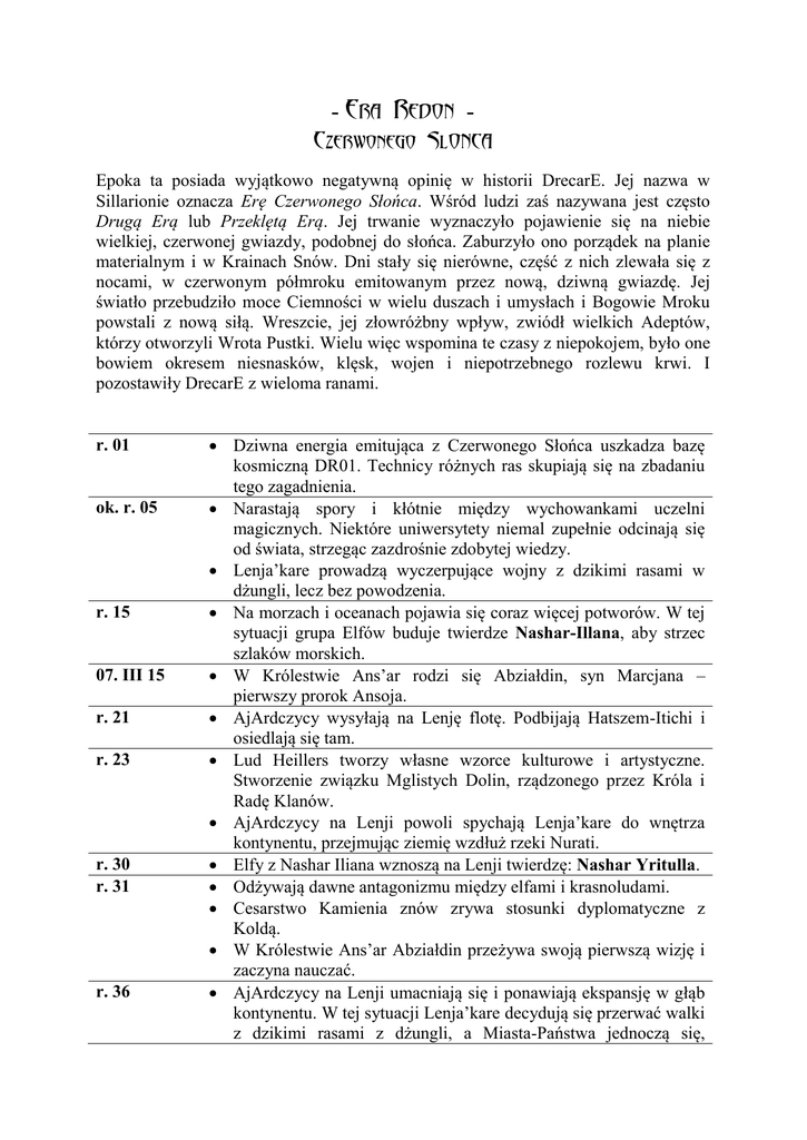 - Era Redon Czerwonego Slonca Epoka ta posiada wyjątkowo negatywną opinię w historii DrecarE. Jej nazwa w Sillarionie oznacza Erę Czerwonego Słońca. Wśród ludzi zaś nazywana jest często Drugą Erą lub Przeklętą Erą. Jej trwanie wyznaczyło pojawienie się na niebie wielkiej, czerwonej gwiazdy, podobnej do słońca. Zaburzyło ono porządek na planie materialnym i w Krainach Snów. Dni stały się nierówne, część z nich zlewała się z nocami, w czerwonym półmroku emitowanym przez nową, dziwną gwiazdę. Jej światło przebudziło moce Ciemności w wielu duszach i umysłach i Bogowie Mroku powstali z nową siłą. Wreszcie, jej złowróżbny wpływ, zwiódł wielkich Adeptów, którzy otworzyli Wrota Pustki. Wielu więc wspomina te czasy z niepokojem, było one bowiem okresem niesnasków, klęsk, wojen i niepotrzebnego rozlewu krwi. I pozostawiły DrecarE z wieloma ranami. r. 01 ok. r. 05 r. 15 07. III 15 r. 21 r. 23 r. 30 r. 31 r. 36 Dziwna energia emitująca z Czerwonego Słońca uszkadza bazę kosmiczną DR01. Technicy różnych ras skupiają się na zbadaniu tego zagadnienia. Narastają spory i kłótnie między wychowankami uczelni magicznych. Niektóre uniwersytety niemal zupełnie odcinają się od świata, strzegąc zazdrośnie zdobytej wiedzy. Lenja’kare prowadzą wyczerpujące wojny z dzikimi rasami w dżungli, lecz bez powodzenia. Na morzach i oceanach pojawia się coraz więcej potworów. W tej sytuacji grupa Elfów buduje twierdze Nashar-Illana, aby strzec szlaków morskich. W Królestwie Ans’ar rodzi się Abziałdin, syn Marcjana – pierwszy prorok Ansoja. AjArdczycy wysyłają na Lenję flotę. Podbijają Hatszem-Itichi i osiedlają się tam. Lud Heillers tworzy własne wzorce kulturowe i artystyczne. Stworzenie związku Mglistych Dolin, rządzonego przez Króla i Radę Klanów. AjArdczycy na Lenji powoli spychają Lenja’kare do wnętrza kontynentu, przejmując ziemię wzdłuż rzeki Nurati. Elfy z Nashar Iliana wznoszą na Lenji twierdzę: Nashar Yritulla. Odżywają dawne antagonizmu między elfami i krasnoludami. Cesarstwo Kamienia znów zrywa stosunki dyplomatyczne z Koldą. W Królestwie Ans’ar Abziałdin przeżywa swoją pierwszą wizję i zaczyna nauczać. AjArdczycy na Lenji umacniają się i ponawiają ekspansję w głąb kontynentu. W tej sytuacji Lenja’kare decydują się przerwać walki z dzikimi rasami z dżungli, a Miasta-Państwa jednoczą się, r. 37 r. 48 r. 50 r. 53 r. 57 r. 59 r. 61 r. 63 r. 64 r. 66 tworząc własną armię. Seria bitew i potyczek pomiędzy AjArdczykami i Lenja’kare kończy się zwycięstwem rdzennych mieszkańców kontynentu. AjArdczycy mniej obeznani w gepgrafii i warunkach przyrodniczych Lenji nie są w stanie prowadzić wojny na długi dystans i wycofują się do ujścia Nurati. Przez kolejne 50 lat starcia między tymi rasami będą dość częste. Pod wpływem monoteistycznych nauk Abziałdina, Proroka Ansoja, w Królestwie Ans’ar dochodzi do przewrotu religijnego. Rozpoczyna się tam wojna domowa pomiędzy zwolennikami nowej i starej religii. Zajęte sporami z krasnoludami Elfy ignorują fakt powstania w pobliżu Olan, na ruinach Tagr’hanionu nowego państwa – Nilfharim. Państwo to rządzone jest przez kapłanów Ciemności. W Ans’ar zwyciężają zwolennicy Proroka Abziładina, który zostaje Najwyższym Kapłanem Ansoja i głową państwa. Ustrój zmienia się w Teokrację. Płoną stosy – pali się na nich księgi magiczne, innowierców i członków innych ras. Ans’ar ogłasza mobilizację, zrywa pakty o nieagresji i napada na Elen-Ghar. Nazywa to „Świętą Wojną” Uciekinierzy – magowie i zwolennicy dawnej religii z Ans’ar przedostają się przez pasmo Elhelid i zajmują ziemię w dorzeczy Lilivy i na terenach dzisiejszego Oderlin. W wyniku narastających pomiędzy klanami sporów Związek Mglistych Dolin rozpada się. Rody występują przeciw sobie i krajem wstrząsa wojna domowa. Daleko, poza Alurbaran, nad brzegami rzeki Turla wznosi się niezależny Uniwersytet Onyxu, będący uczelnią Wysokiej Magii. Jego członkowie za pomocą potężnych zaklęć tworzą twierdzę Elen’gall. W AjArd nieznany nikomu Nomad Bantu natrafia na pustyni na dawne ruiny, w których znajduje się świątynia Sati. Bóstwo objawia mu się, czyniąc z niego swego awatara. Odtąd znany on będzie jako Nebpehtysati (Sati Jest Panem Potęgi). Nebpehtysati zyskuje wielką popularność wśród dzikich plemion nomadów i gromadzi swoją armię. Napada na kilka wiosek położonych wzdłuż nurtu Zinambi i plądruje je. Armia Nebpehtysati zdobywa miasto Amira. Następuje rzeź jego mieszkańców. Armia Nebpehtysati oblega On’ar. Miasto bronić się będzie dzielnie przez następne dwa lata. Wzrost potworów w wodach Fired zmusza elfy z Nashar-Illana do zaciekłych walk. Nebpehtysati zdobywa wpływy wśród korsarzy i zyskuje posłuszną mu flotę. Wiedziony wizją zesłaną mu przez Patrona r. 67 r. 68 r. 72 r. 73 r. 74 r. 75 r. 76 r. 77 porzuca oblężenie Om’aru i kieruje się ku Ualla. Rozpoczyna się oblężenie Ualla. Armia Nebpehtysati atakuje miasto Ualla z lądu i z wody. Miasto jest bliskie upadkowi, a Nomadowie wdzierają się na ulice. Wtedy jednakże dochodzi do objawienia się awatara Neith, który zabija przywódcę Nomadów. Wojsko rozprasza się w popłochu. On’ar i Kudan formują armię, która ma za zadanie rozgromić pozostałości wojsk Nebpehtysati. Mieszkańcy Ualla budują świątynię Neith i poświęcają bogini to miasto. Na Lenji Elfia twierdza Nashar Yritulla przekształca się w kwitnące miasto Vilmisir. Dochodzi do sporadycznych starć między elfami z Olan i Cesarstwa Kamienia a krasnoludami z Koldy. Nilfharim rośnie w siłę i zaczyna budować armię. W AjArd zostaje odbudowane miasto Amira. Do Elen’gall przybywa Wielki Adept, Arcymag Gereth, syn Kalsta z ludu Marven, wraz ze swym przyjacielem Arcydriudem Akhte, synem Vierzby Siwej z ludu Pradawnych. Nilfh