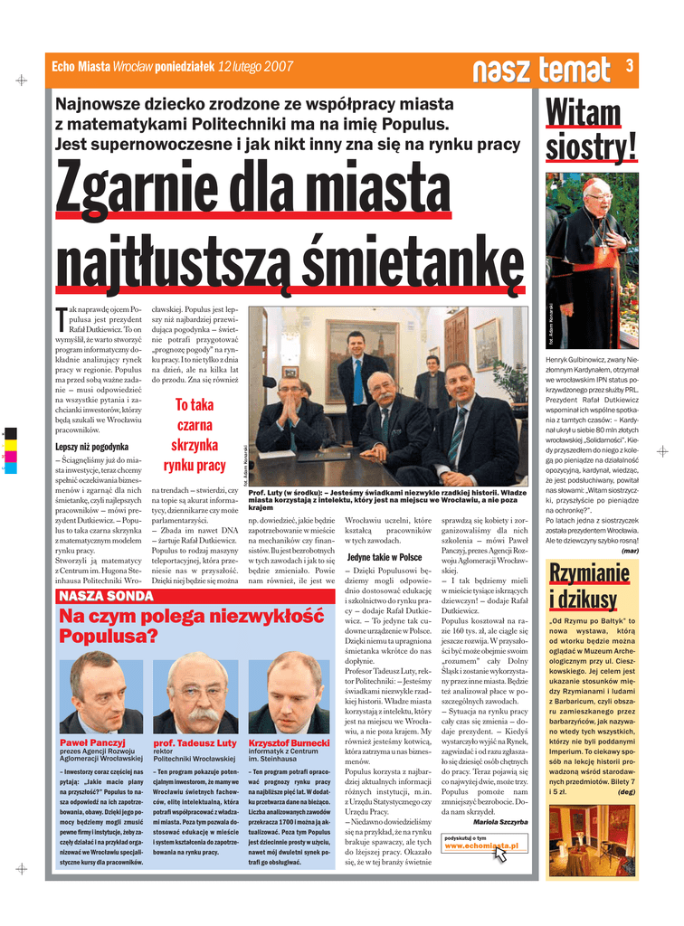 nasz temat 3 Echo Miasta Wrocław poniedziałek 12 lutego 2007 Najnowsze dziecko zrodzone ze współpracy miasta z matematykami Politechniki ma na imię Populus. Jest supernowoczesne i jak nikt inny zna się na rynku pracy cławskiej. Populus jest lepszy niż najbardziej przewidująca pogodynka – świetnie potrafi przygotować „prognozę pogody” na rynku pracy. I to nie tylko z dnia na dzień, ale na kilka lat do przodu. Zna się również To taka czarna skrzynka rynku pracy Lepszy niż pogodynka – Ściągnęliśmy już do miasta inwestycje, teraz chcemy spełnić oczekiwania biznesmenów i zgarnąć dla nich śmietankę, czyli najlepszych pracowników – mówi prezydent Dutkiewicz. – Populus to taka czarna skrzynka z matematycznym modelem rynku pracy. Stworzyli ją matematycy z Centrum im. Hugona Steinhausa Politechniki Wro- na trendach – stwierdzi, czy na topie są akurat informatycy, dziennikarze czy może parlamentarzyści. – Zbada im nawet DNA – żartuje Rafał Dutkiewicz. Populus to rodzaj maszyny teleportacyjnej, która przeniesie nas w przyszłość. Dzięki niej będzie się można fot. Adam Konarski C M Y K T ak naprawdę ojcem Populusa jest prezydent Rafał Dutkiewicz. To on wymyślił, że warto stworzyć program informatyczny dokładnie analizujący rynek pracy w regionie. Populus ma przed sobą ważne zadanie – musi odpowiedzieć na wszystkie pytania i zachcianki inwestorów, którzy będą szukali we Wrocławiu pracowników. fot. Adam Konarski Zgarnie dla miasta najtłustszą śmietankę Prof. Luty (w środku): – Jesteśmy świadkami niezwykle rzadkiej historii. Władze miasta korzystają z intelektu, który jest na miejscu we Wrocławiu, a nie poza krajem np. dowiedzieć, jakie będzie zapotrzebowanie w mieście na mechaników czy finansistów. Ilu jest bezrobotnych w tych zawodach i jak to się będzie zmieniało. Powie nam również, ile jest we NASZA SONDA Na czym polega niezwykłość Populusa? Paweł Panczyj prezes Agencji Rozwoju Aglomeracji Wrocławskiej – Inwestorzy coraz częściej nas pytają: „Jakie macie plany na przyszłość?” Populus to nasza odpowiedź na ich zapotrzebowania, obawy. Dzięki jego pomocy będziemy mogli zmusić pewne firmy i instytucje, żeby zaczęły działać i na przykład organizować we Wrocławiu specjalistyczne kursy dla pracowników. prof. Tadeusz Luty Krzysztof Burnecki – Ten program pokazuje potencjalnym inwestorom, że mamy we Wrocławiu świetnych fachowców, elitę intelektualną, która potrafi współpracować z władzami miasta. Poza tym pozwala dostosować edukację w mieście i system kształcenia do zapotrzebowania na rynku pracy. – Ten program potrafi opracować prognozy rynku pracy na najbliższe pięć lat. W dodatku przetwarza dane na bieżąco. Liczba analizowanych zawodów przekracza 1700 i można ją aktualizować. Poza tym Populus jest dziecinnie prosty w użyciu, nawet mój dwuletni synek potrafi go obsługiwać. rektor Politechniki Wrocławskiej Witam siostry! informatyk z Centrum im. Steinhausa Wrocławiu uczelni, które kształcą pracowników w tych zawodach. Jedyne takie w Polsce – Dzięki Populusowi będziemy mogli odpowiednio dostosować edukację i szkolnictwo do rynku pracy – dodaje Rafał Dutkiewicz. – To jedyne tak cudowne urządzenie w Polsce. Dzięki niemu ta upragniona śmietanka wkrótce do nas dopłynie. Profesor Tadeusz Luty, rektor Politechniki: – Jesteśmy świadkami niezwykle rzadkiej historii. Władze miasta korzystają z intelektu, który jest na miejscu we Wrocławiu, a nie poza krajem. My również jesteśmy kotwicą, która zatrzyma u nas biznesmenów. Populus korzysta z najbardziej aktualnych informacji różnych instytucji, m.in. z Urzędu Statystycznego czy Urzędu Pracy. – Niedawno dowiedzieliśmy się na przykład, że na rynku brakuje spawaczy, ale tych do lżejszej pracy. Okazało się, że w tej branży świetnie sprawdzą się kobiety i zorganizowaliśmy dla nich szkolenia – mówi Paweł Panczyj, prezes Agencji Rozwoju Aglomeracji Wrocławskiej. – I tak będziemy mieli w mieście tysiące iskrzących dziewczyn! – dodaje Rafał Dutkiewicz. Populus kosztował na razie 160 tys. zł, ale ciągle się jeszcze rozwija. W przyszłości być może obejmie swoim „rozumem” cały Dolny Śląsk i zostanie wykorzystany przez inne miasta. Będzie też analizował płace w poszczególnych zawodach. – Sytuacja na rynku pracy cały czas się zmienia – dodaje prezydent. – Kiedyś wystarczyło wyjść na Rynek, zagwizdać i od razu zgłaszało się dziesięć osób chętnych do pracy. Teraz pojawią się co najwyżej dwie, może trzy. Populus pomoże nam zmniejszyć bezrobocie. Doda nam skrzydeł. Mariola Szczyrba Henryk Gulbinowicz, zwany Niezłomnym Kardynałem, otrzymał we wrocławskim IPN status pokrzywdzonego przez służby PRL. Prezydent Rafał Dutkiewicz wspominał ich wspólne spotkania z tamtych czasów: – Kardynał ukrył u siebie 80 mln złotych wrocławskiej „Solidarności”. Kiedy przyszedłem do niego z kolegą po pieniądze na działalność opozycyjną, kardynał, wiedząc, że jest podsłuchiwany, powitał nas słowami: „Witam siostrzyczki, przyszłyście po pieniądze na ochronkę?”. Po latach jedna z siostrzyczek została prezydentem Wrocławia. Ale te dziewczyny szybko rosną! (mar) Rzymianie i dzikusy „Od Rzymu po Bałtyk” to nowa wystawa, którą od wtorku będzie można oglądać w Muzeum Archeologicznym przy ul. Cieszkowskiego. Jej celem jest ukazanie stosunków między Rzymianami i ludami z Barbaricum, czyli obszaru zamieszkanego przez barbarzyńców, jak nazywano wtedy tych wszystkich, którzy nie byli poddanymi Imperium. To ciekawy sposób na lekcję historii prowadzoną wśród starodawnych przedmiotów. Bilety 7 i 5 zł. (deg)