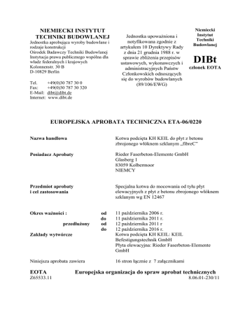 NIEMIECKI INSTYTUT TECHNIKI BUDOWLANEJ Jednostka aprobująca wyroby budowlane i rodzaje konstrukcji Ośrodek Badawczy Techniki Budowlanej Instytucja prawa publicznego wspólna dla władz federalnych i krajowych Kolonnenstr. 30 B D-10829 Berlin Tel. Fax: E-Mail: Internet: +49(0)30 787 30 0 +49(0)30 787 30 320 [email protected] www.dibt.de Jednostka upoważniona i notyfikowana zgodnie z artykułem 10 Dyrektywy Rady z dnia 21 grudnia 1988 r. w sprawie zbliżenia przepisów ustawowych, wykonawczych i administracyjnych Państw Członkowskich odnoszących się do wyrobów budowlanych (89/106/EWG) Niemiecki Instytut Techniki Budowlanej DIBt członek EOTA EUROPEJSKA APROBATA TECHNICZNA ETA-06/0220 Nazwa handlowa Kotwa podcięta KH KEIL do płyt z betonu zbrojonego włóknem szklanym „fibreC” Posiadacz Aprobaty Rieder Faserbeton-Elemente GmbH Glasberg 1 83059 Kolbermoor NIEMCY Przedmiot aprobaty i cel zastosowania Specjalna kotwa do mocowania od tyłu płyt elewacyjnych z płyt z betonu zbrojonego włóknem szklanym wg EN 12467 Okres ważności : przedłużony Zakłady wytwórcze Niniejsza aprobata zawiera EOTA Z65533.11 od do od do 11 października 2006 r. 11 października 2011 r. 12 października 2011 r 12 października 2016 r. Kotwa podcięta KH KEIL: KEIL Befestigungstechnik GmbH Płyta elewacyjna: Rieder Faserbeton-Elemente GmbH 16 stron łącznie z 7 załącznikami Europejska organizacja do spraw aprobat technicznych 8.06.01-230/11 Niemiecki Instytut Techniki Budowlanej DIBt Przedłużenie okresu ważności Europejskiej Aprobaty Technicznej ETA-06/0220 I str. 2/16 12. października 2011 PODSTAWY PRAWNE I POSTANOWIENIA OGÓLNE 1. Niniejsza europejska aprobata techniczna wydawana jest przez Niemiecki Instytut Techniki Budowlanej zgodnie z : - Dyrektywą 89/106/EWG Rady z dnia 21 grudnia 1988 r. w sprawie zbliżenia przepisów ustawowych, wykonawczych i administracyjnych Państw Członkowskich odnoszących się do wyrobów budowlanych1, zmienioną przez Dyrektywę 93/68/EWG Rady2 i przez Rozporządzenie (EG) Nr 1882/2003 Parlamentu Europejskiego i Rady3; - Ustawą o wprowadzeniu do obrotu i o wolnym obrocie towarowym wyrobami budowlanymi w celu realizacji Dyrektywy 89/106/EWG Rady z dnia 21 grudnia 1988 r. w sprawie zbliżenia przepisów ustawowych, wykonawczych i administracyjnych Państw Członkowskich odnoszących się do wyrobów budowlanych i innych aktów prawnych Wspólnot Europejskich (Ustawa o wyrobach budowlanych – BauPG) z dnia 28 kwietnia 1998 r.4 , ostatnio zmienioną przez; Rozporządzenie z dnia 31. października 20065; - Wspólnymi Regułami Postępowania dotyczącymi wnioskowania, przygotowania i wydawania europejskich aprobat technicznych zgodnie z załącznikiem do decyzji 94/23/EG Komisji6. 2. Niemiecki Instytut Techniki Budowlanej jest uprawniony do kontrolowania, czy są spełniane postanowienia niniejszej europejskiej aprobaty technicznej. Kontrola ta może odbywać się w zakładach produkcyjnych. Posiadacz europejskiej aprobaty technicznej pozostaje jednak odpowiedzialny za zgodność wyrobów z europejską aprobatą techniczną i ich przydatność do przewidzianego celu zastosowania. 3. Niniejszej europejskiej aprobaty technicznej nie wolno przenosić na innych producentów lub przedstawicieli producentów niż wymienieni na stronie 1 albo na inne zakłady produkcyjne niż wymienione na stronie 1 niniejszej europejskiej aprobaty technicznej. 4. Niemiecki Instytut Techniki Budowlanej może unieważnić niniejszą europejską aprobatę techniczną, w szczególności po powiadomieniu Komisji na podstawie art. 5 rozdz. 1 Dyrektywy 89/106/EWG. 5. Niniejszą europejską aprobatę techniczną wolno powielać tylko w całości – również w przypadku przekazywania jej drogą elektroniczną. Jednakże częściowe powielanie może odbyć się za pisemną zgodą Niemieckiego Instytutu Techniki Budowlanej. W takim przypadku częściowe powielanie musi być oznaczone jako takie. Teksty i rysunki materiałów reklamowych nie mogą być sprzeczne lub użyte niezgodnie z europejską aprobatą techniczną . 6. Europejska aprobata techniczna wydawana jest przez jednostkę zatwierdzającą w jej urzędowym języku. Niniejsza wersja jest zgodna z wersją stosowaną przez EOTA przy obrocie wyrobami. W przypadku tłumaczeń na inne języki powinno być zaznaczone, że są to tłumaczenia. 1 2 3 4 5 6 Dziennik urzędowy Wspólnot Europejskich L 40 z dnia 11.2.1989 r., s. 12 Dziennik urzędowy Wspólnot Europejskich L 220 z dnia 30.8.1993 r., s. 1 Dziennik urzędowy Unii Europejskiej L 284 z dnia 31.10.2003, s. 25 Federalny Dziennik Ustaw I 1998, s. 812 Federalny Dziennik Ustaw I 2006, s. 2407, 2416 Dziennik urzędowy Wspólnot Europejskich L 17 z dnia 20.1.1994, s. 34 Z65533.11 8.06.01-230/11 Niemiecki Instytut Techniki Budowlanej DIBt Przedłużenie okresu ważności Europejskiej Aprobaty Technicznej ETA-06/0220 str. 3/16 12. października 2011 II POSTANOWIENIA SZCZEGÓŁOWE EUROPEJSKIEJ APROBATY TECHNICZNEJ 1 Opis wyrobu i cel zastosowania 1.1. Opis wyrobu Kotwa podcięta KH KEIL do tafli z betonu zbrojonego włóknem szklanym „fibreC” jest kotwą specjalną, która składa się z naciętej krzyżowo tulejki kotwowej o gwincie wewnętrznym M6, która na górnym końcu ukształtowana jest w sześciokąt, i należącej do niej śruby z łbem sześciokątnym z ukształtowaną zębatą podkładką ustalającą. Tulejka kotwowa i śruba z łbem sześciokątnym wraz z ukształtowaną zębatą podkładką ustalającą wykonane są ze stali nierdzewnej. Kotwa jest wkładana do podciętego wywierconego otworu i poprzez wkręcanie śruby osadzana w wyniku rozpierania oraz kotwiona z jednoczesną kontrolą przemieszczenia. W Załączniku 1 przedstawiona jest kotwa wbudowana. 1.2 Cel zastosowania Kotwa podcięta KH Keil może być stosowana do mocowania od tyłu płyt elewacyjnych z tafli wykonanych z betonu zbrojonego włóknem szklanym „fibreC”. Płyty elewacyjne muszą odpowiadać 