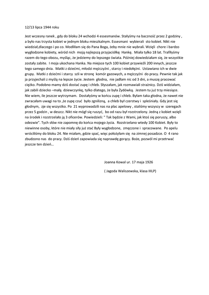 12/13 lipca 1944 roku Jest wczesny ranek , gdy do bloku 24 wchodzi 4 essesmanów. Stałyśmy na baczność przez 2 godziny , a było nas trzysta kobiet w jednym bloku mieszkalnym. Essesmani wybierali sto kobiet. Nikt nie wiedział,dlaczego i po co. Modliłam się do Pana Boga, żeby mnie nie wybrali. Wzięli chore i bardzo wygłodzone kobiety, wśród nich moją najlepszą przyjaciółkę Hankę. Miała tylko 18 lat. Trafiłyśmy razem do tego obozu, myśląc, że jedziemy do lepszego świata. Później dowiedziałam się, że wszystkie zostały zabite. I moja ukochana Hanka. Na miejsce tych 100 kobiet przywieźli 200 innych, jeszcze tego samego dnia. Matki z dziećmi, młodzi mężczyźni , starcy i niedołężni. Ustawiano ich w dwie grupy. Matki z dziećmi i starcy szli w stronę komór gazowych, a mężczyźni do pracy. Pewnie tak jak ja przyjechali z myślą na lepsze życie. Jestem głodna, nie jadłam nic od 3 dni, a muszę pracować ciężko. Podobno mamy dziś dostać zupę i chleb. Słyszałam, jak rozmawiali strażnicy. Dziś widziałam, jak zabili dziecko –małą dziewczynkę, tylko dlatego, że była Żydówką. Jestem tu już trzy miesiące. Nie wiem, ile jeszcze wytrzymam. Dostałyśmy w końcu zupę i chleb. Byłam taka głodna, że nawet nie zwracałam uwagi na to ,że zupę czuć było zgnilizną, a chleb był czerstwy i spleśniały. Gdy jest się głodnym, zje się wszystko. Po 21 wyprowadzili nas na plac apelowy , staliśmy wszyscy w szeregach przez 5 godzin , w deszcz. Nikt nie mógł się ruszyć, bo od razu był rozstrzelony. Jedną z kobiet wzięli na środek i rozstrzelało ją 3 oficerów. Powiedzieli: " Tak będzie z Wami, jak ktoś się poruszy, albo odezwie". Tych słów nie zapomnę do końca mojego życia. Rozstrzelano wtedy 100 Kobiet. Były to niewinne osoby, które nie miały siły już stać Były wygłodzone, zmęczone i spracowane. Po apelu wróciliśmy do bloku 24. Nie miałam, gdzie spać, więc położyłam się na zimnej posadzce. O 4 rano zbudzono nas do pracy. Dziś dzień zapowiada się naprawdę gorący. Boże, pozwól mi przetrwać jeszcze ten dzień… Joanna Kowal ur. 17 maja 1926 ( Jagoda Waliszewska, klasa IIILP)