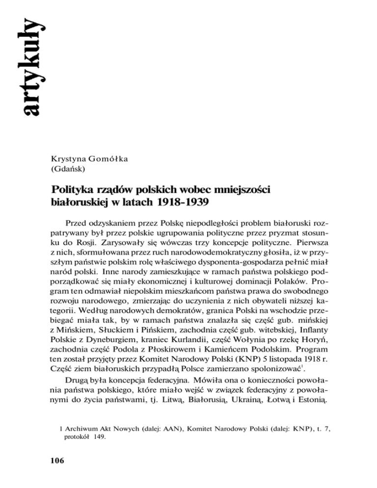 Krystyna Gomółka (Gdańsk) Polityka rządów polskich wobec mniejszości białoruskiej w latach 1918-1939 Przed odzyskaniem przez Polskę niepodległości problem białoruski roz patrywany był przez polskie ugrupowania polityczne przez pryzmat stosun ku do Rosji. Zarysowały się wówczas trzy koncepcje polityczne. Pierwsza z nich, sformułowana przez ruch narodowodemokratyczny głosiła, iż w przy szłym państwie polskim rolę właściwego dysponenta-gospodarza pełnić miał naród polski. Inne narody zamieszkujące w ramach państwa polskiego pod porządkować się miały ekonomicznej i kulturowej dominacji Polaków. Pro gram ten odmawiał niepolskim mieszkańcom państwa prawa do swobodnego rozwoju narodowego, zmierzając do uczynienia z nich obywateli niższej ka tegorii. Według narodowych demokratów, granica Polski na wschodzie prze biegać miała tak, by w ramach państwa znalazła się część gub. mińskiej z Mińskiem, Słuckiem i Pińskiem, zachodnia część gub. witebskiej, Inflanty Polskie z Dyneburgiem, kraniec Kurlandii, część Wołynia po rzekę Horyń, zachodnia część Podola z Płoskirowem i Kamieńcem Podolskim. Program ten został przyjęty przez Komitet Narodowy Polski (KNP) 5 listopada 1918 r. 1 Część ziem białoruskich przypadłą Polsce zamierzano spolonizować . Drugą była koncepcja federacyjna. Mówiła ona o konieczności powoła nia państwa polskiego, które miało wejść w związek federacyjny z powoła nymi do życia państwami, tj. Litwą, Białorusią, Ukrainą, Łotwą i Estonią. 1 Archiwum Akt Nowych (dalej: AAN), Komitet Narodowy Polski (dalej: KNP), t. 7, protokół 149. 106 Zakładano, że akces do federacji będzie miał charakter dobrowolny. Jedną z przyczyn powstania stanowiska federacyjnego było przeświadczenie, że gra nice etnograficzne w Europie wschodniej są niemożliwe do wytyczenia, a prawo do samookreślenia przysługuje również Polakom zamieszkałym na wschód od Sanu i Bugu. Za najsłabsze ogniwo w koncepcji federacyjnej uważano Białorusinów, określając ich często pojęciem „masy etnograficz nej". Za główne zadanie Polaków zamieszkujących ziemie białoruskie uwa żano pomoc w tworzeniu narodu białoruskiego. Zarówno Polska Partia So cjalistyczna, Polskie Stronnictwo Ludowe „Wyzwolenie", a także ludzie z osobistego otoczenia Józefa Piłsudskiego lansujący koncepcję federacyjną zastrzegali sobie, iż w przypadku niemożności realizacji powyższego planu, państwo polskie dążyć będzie do przyłączenia tych ziem litewsko-białoruskich, które zamieszkuje w większości ludność polska2. Wokół odmiennych założeń skupili się zwolennicy stanowiska zwanego krajowym. Ujawniło się ono równolegle w dwóch środowiskach: konserwa tywnej szlachty i postępowej inteligencji. Krajowcy w wystąpieniach podkre ślali swą polskość, czując się obywatelami tzw. kraju, przez co rozumieli ziemie byłego Wielkiego Księstwa Litewskiego (WKL). Obszar ten występo wał w ich mentalności jako spójna całość ekonomiczna, kulturalna, o specy ficznej strukturze ludności i własnych tradycjach historycznych. Wszystkie narody zamieszkujące „kraj" namawiali do zgodnej współpracy, celem „(...) ekonomicznego, kulturalnego i społecznego dźwignięcia kraju i wszystkich jego mieszkańców"3. W sposób instrumentalny traktował problem białoruski J. Piłsudski. Pi sał on, że Białorusini są elementem słabym. W memoriale złożonym w 1904 r. w japońskim Ministerstwie Spraw Zagranicznych, dokonując podziału na narody historyczne i niehistoryczne, Białorusinów zaliczył do drugiej grupy. Ta grupa narodów (Białorusini, Łotysze, Litwini) zdaniem Piłsudskiego nie posiadała tradycji historycznej, a jej uczestnicy nie byli zdolni do powołania w przyszłości własnych państw i mogli znaleźć się w strefie wpływów pol skich lub rosyjskich. Naczelnym celem J. Piłsudskiego było dążenie do rozbi cia Rosji. Za główną siłę mogącą to urzeczywistnić uważał Polaków. Wspo magać ich mieli m.in. Białorusini, zwłaszcza Białorusini katolicy, którzy — 4 jego zdaniem — znacznie łatwiej ulegali wpływom polskim niż pozostali . 2 M. K. Dziewanowski, Joseph Piłsudski, A European Federalist 1918-1922, Stanford 1969, s. 28. 3 A. Tupalski, Stanowisko polskie na Białej Rusi i kwestia agrarna, „Kurier Litewski", 15.IX.1906, nr 189; A. Jurkiewicz, Rozwój polskiej myśli politycznej na Litwie i Biało rusi w latach 1905-1922, Poznań 1983, s. 35. 4 K. Gomółka, Piłsudski wobec kwestii białoruskiej a wschodnia granica Polski w la tach 1918-1922, [w:] Narodziny Polski Niepodległej. Wizje — Realia — Opinie, War szawa 1988, s. 196-216. 107 Dwa pierwsze rządy odrodzonej Rzeczypospolitej — Ignacego Daszyń skiego i Jędrzeja Moraczewskiego — nie sformułowały konkretnego progra mu w kwestii białoruskiej. Były bowiem zajęte problemami związanymi z odradzaniem się po 123 latach niewoli państwa polskiego i kształtowaniem jego granic. To właśnie przez pryzmat nakreślenia przyszłej granicy Polski widziano problem białoruski. Fakt ten potwierdzają oświadczenia J. Mora czewskiego z 20 listopada 1918 r. i wypowiedź ministra spraw zagranicz nych w rządzie premiera J. Moraczewskiego Leona Wasilewskiego z 17 gru dnia 1918 r. W obu wypowiedziach stosunki z Litwinami i Białorusinami miały zostać rozwiązane „(...) w myśl tradycji polskiej wolni z wolnymi, równi z równymi, żeby nic nie zostało uronione z tego dorobku kulturalnego, który tam istnieje i ma szanse rozwoju"5. Wprawdzie w czasie kadencji rządu premiera J. Moraczewskiego został powołany do życia departament litewsko-białoruski (w ramach MSZ), ale i jego celem nie było rozpatrzenie kwe stii białoruskiej. Decyzje o przyszłości ziem zamieszkałych przez Białorusi nów kształtowały się w kuluarach, zaś osobą, która miała na nie największy wpływ był J. Piłsudski. Podczas grudniowe